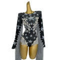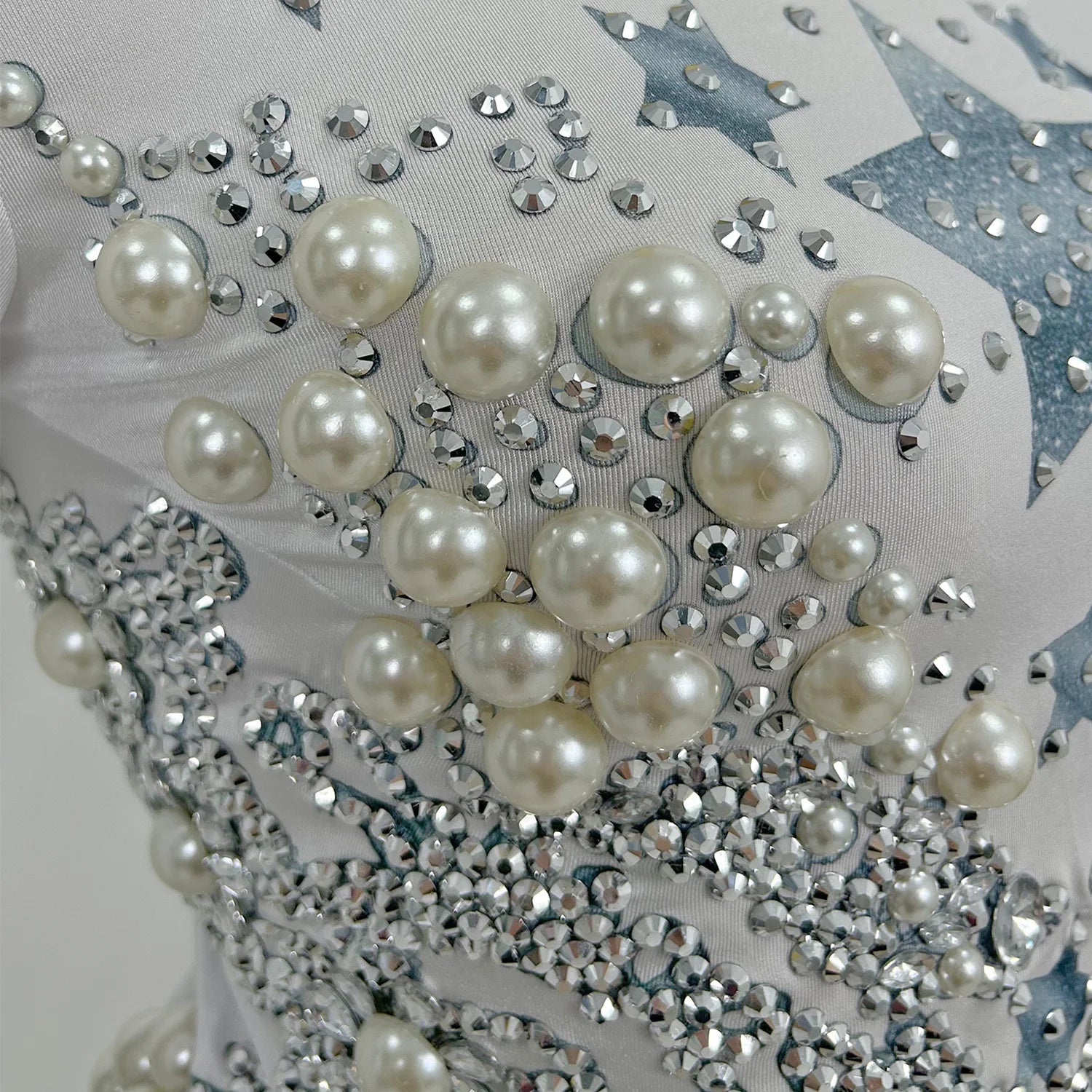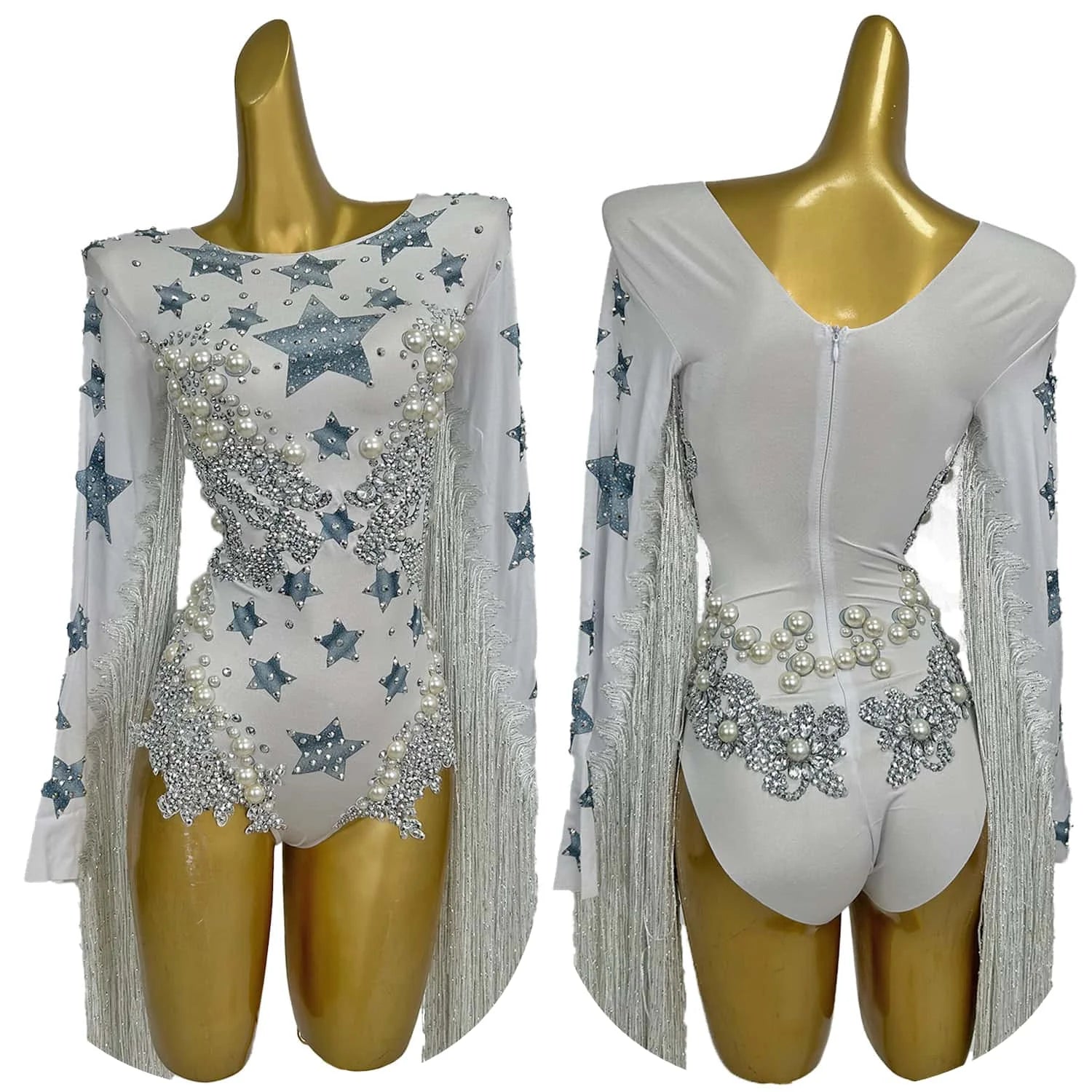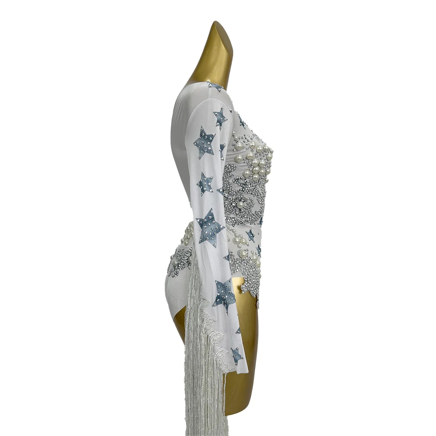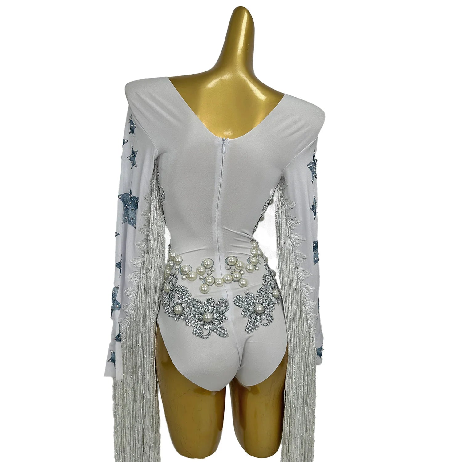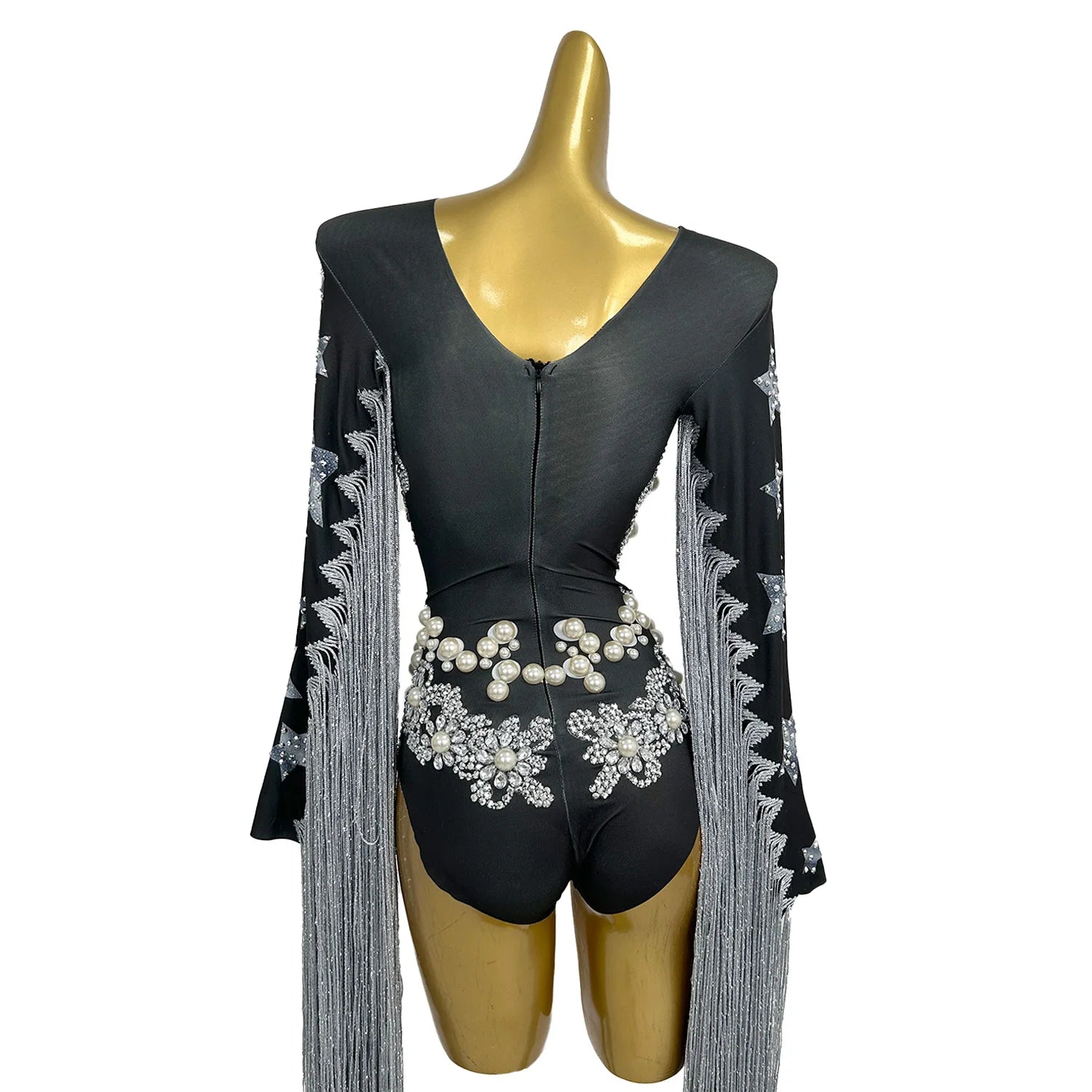Sexy Sparkly Pearls Rhinestones Tassels Printing Bodysuit Bar Nightclub Performance Costume Evening Party Stage Wear