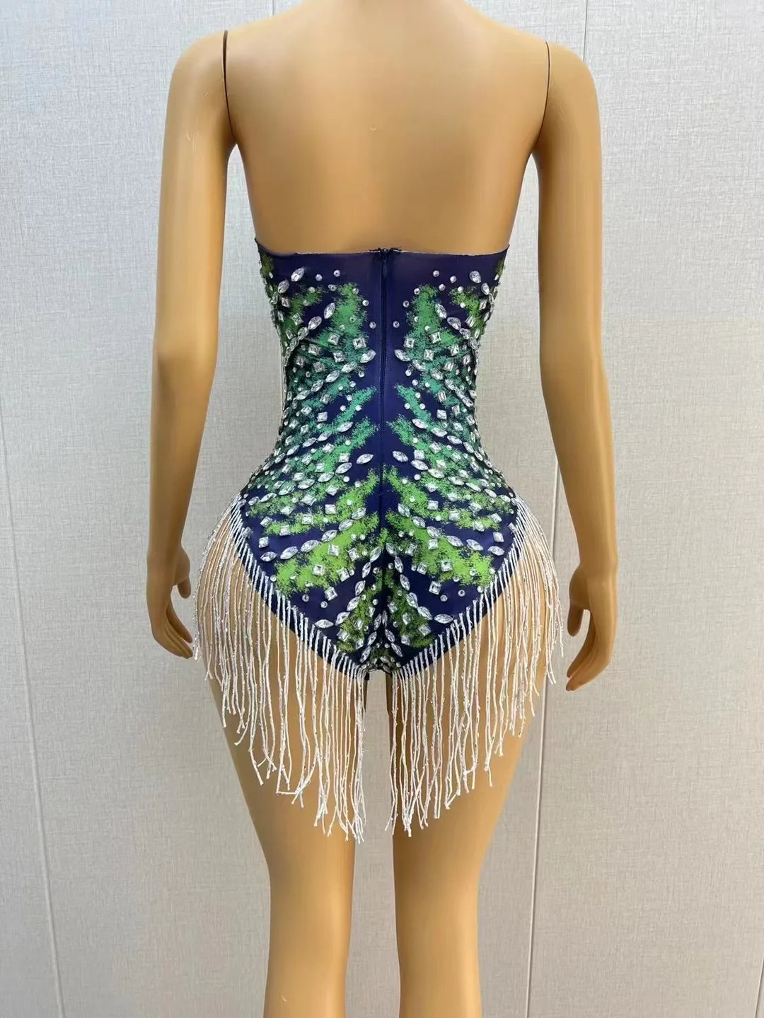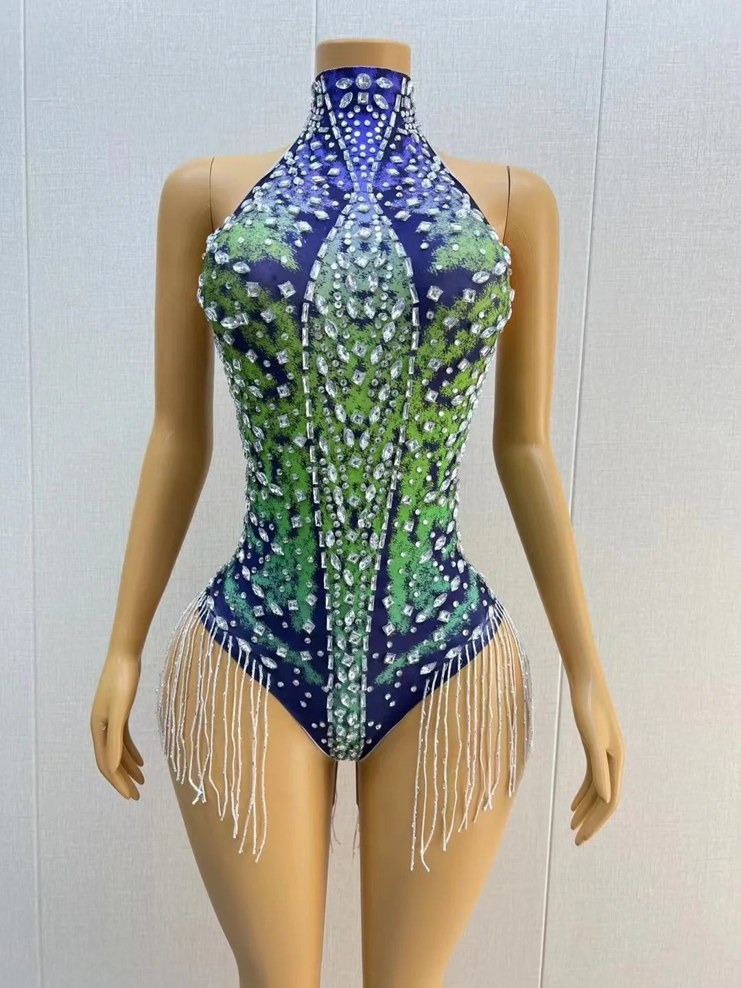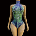 Make a statement at your next celebration with this eye-catching, sleeveless bodysuit adorned with blue, green, and silver rhinestones and dazzling fringe tassels. Designed with a comfortable stretch fit, this sexy stage costume is perfect for birthdays, parties, and photoshoots. The sparkling rhinestone details and lively tassels add movement and shimmer, ensuring you stand out and shine on any special occasion.