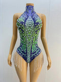 Sexy Stage Blue Green Silver Rhinestones Fringes Sleeveless Stretch Tassels Bodysuit Birthday Celebrate Party Photoshoot Costume