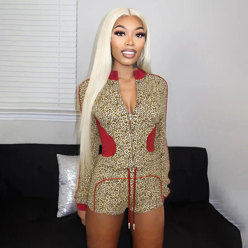 Unleash your wild side with this sexy women’s 2-piece leopard set, featuring a stylish zipper jacket with a stand collar and coordinating high-waist mini shorts. The jacket includes a sleek front zipper and bold leopard print, while the drawstring shorts offer adjustable comfort and a flattering fit. Perfect for parties, clubwear, or casual street style, this eye-catching two-piece outfit ensures you stand out wherever you go.