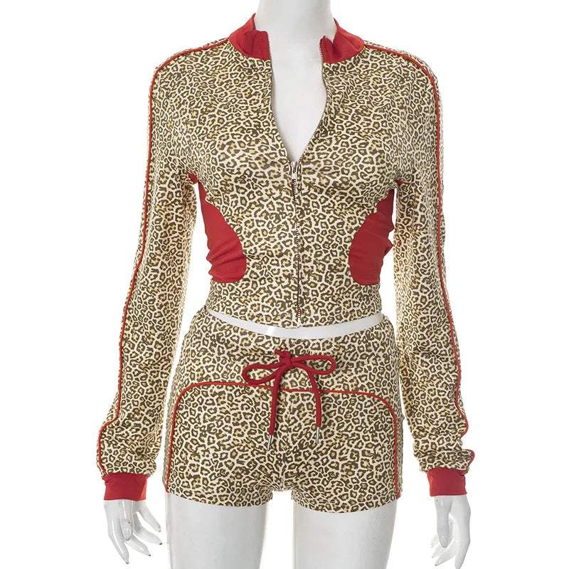 Sexy Women 2 Piece Leopard Zipper Jacket Drawstring Shorts Sets Stand Collar Jackets High Waist Mini Shorts Two Piece Outfits