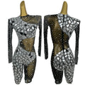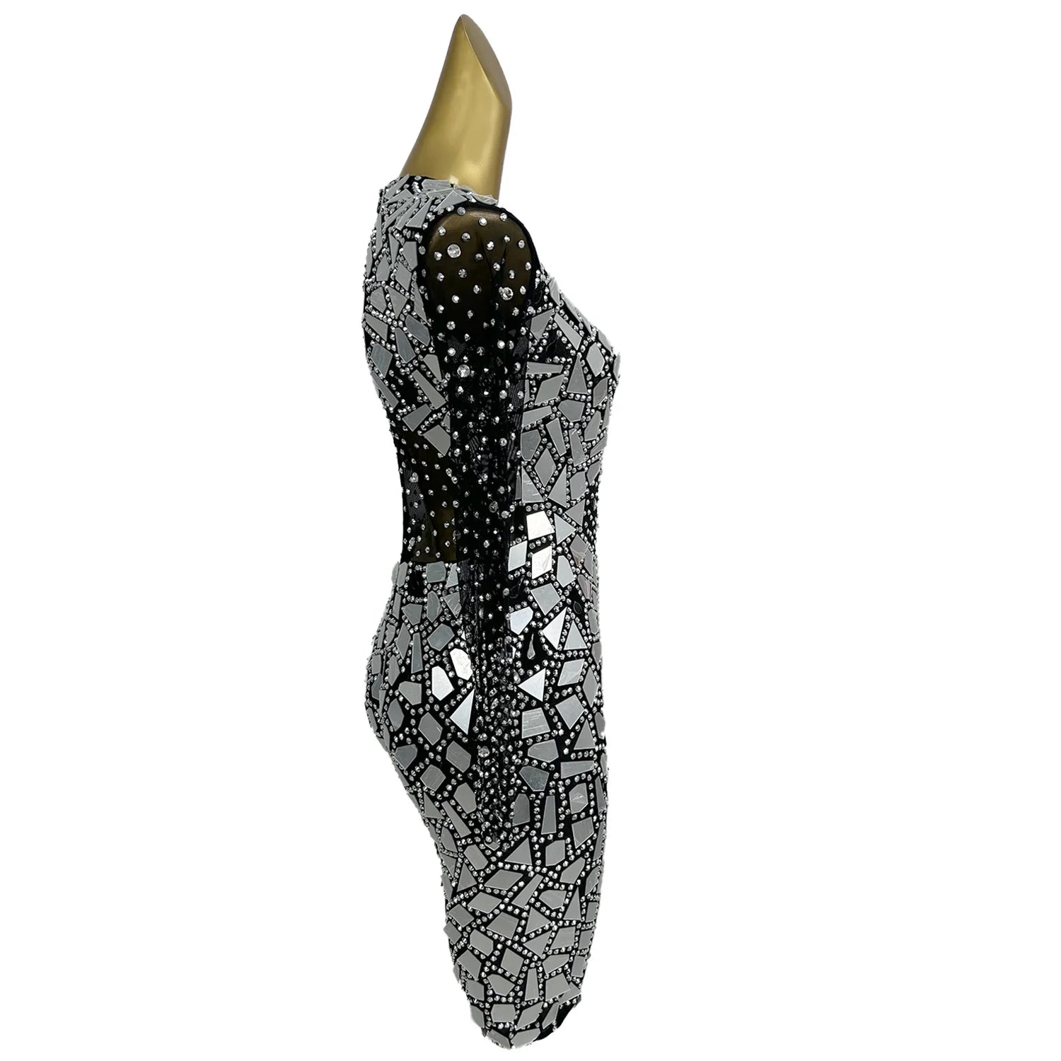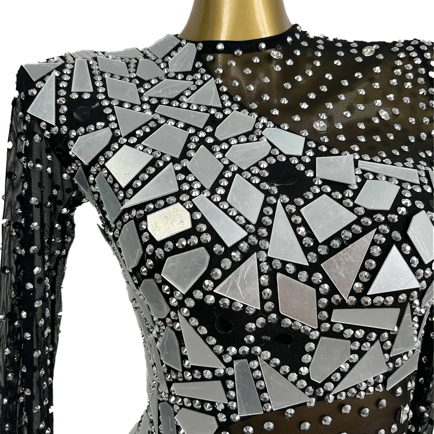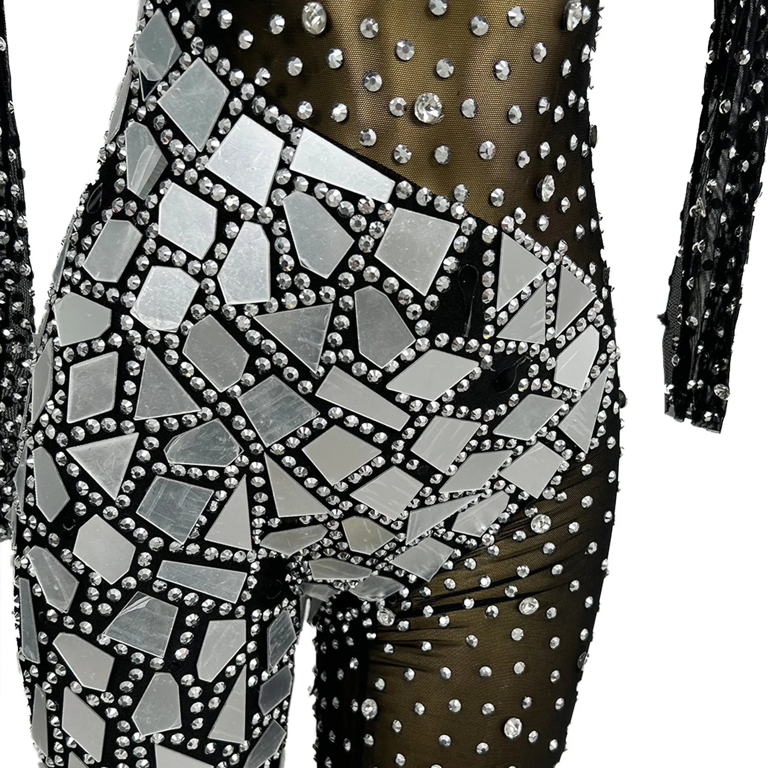 Sexy Women Black See Through Mesh Bodysuit Sparkly Rhinestone Mirrors Tight Fitting Catsuit Club Party Event Show Wear