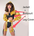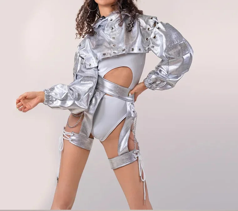 Faites une entrée remarquée avec ce costume de danse hip-hop jazz sexy pour femme. Composé d'un body en cuir doré et argenté scintillant et d'une cape à capuche assortie, cet ensemble audacieux est parfait pour les fêtes, les festivals et les spectacles. Sa finition métallique éclatante et son design saisissant vous garantissent d'attirer l'attention en toute occasion : idéal pour les performances en boîte, les apparitions en festival ou les chorégraphies spectaculaires.