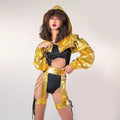 Costume de danse hip-hop sexy pour femme, tenue de scène, de festival, de fête, de cape à capuche en cuir doré et argenté
