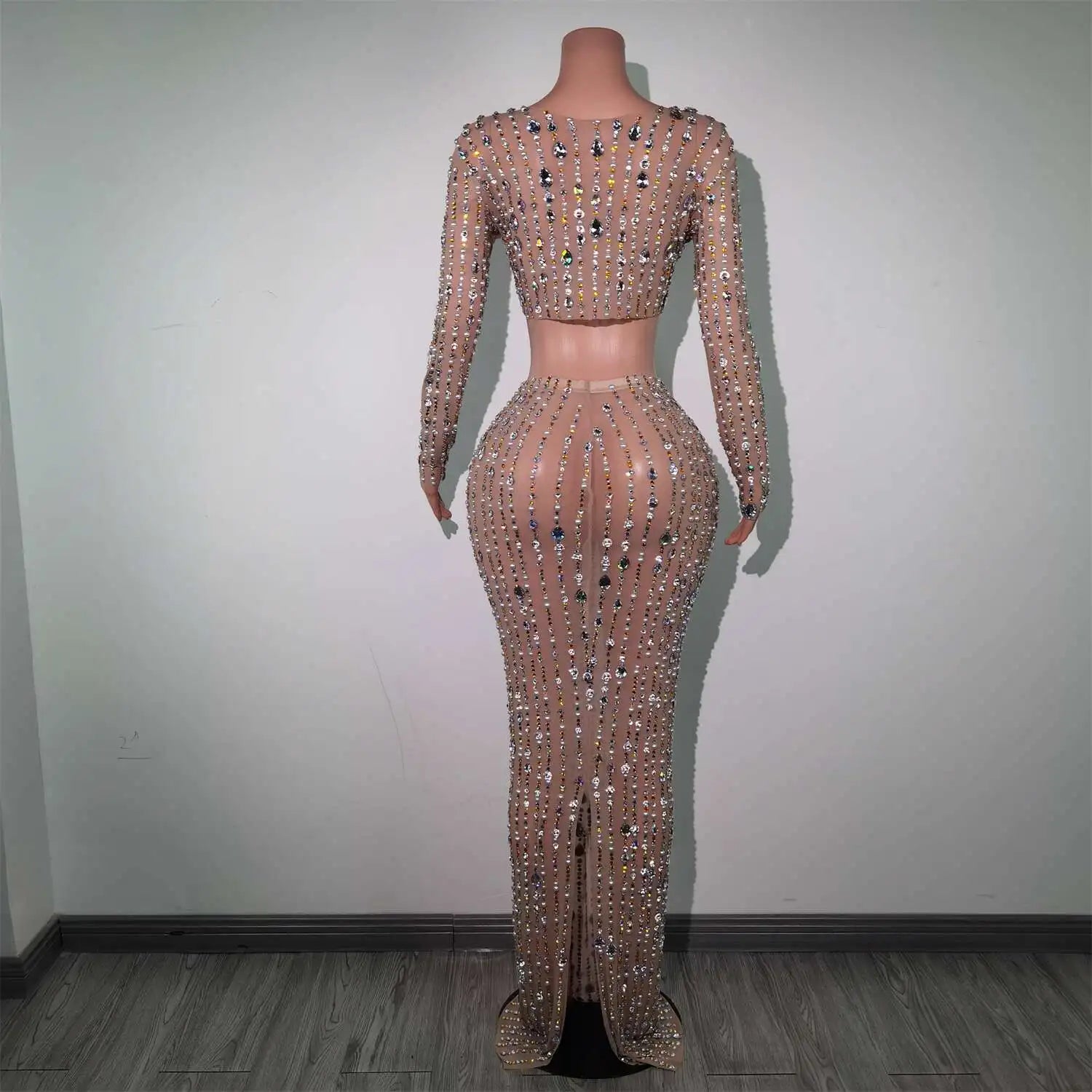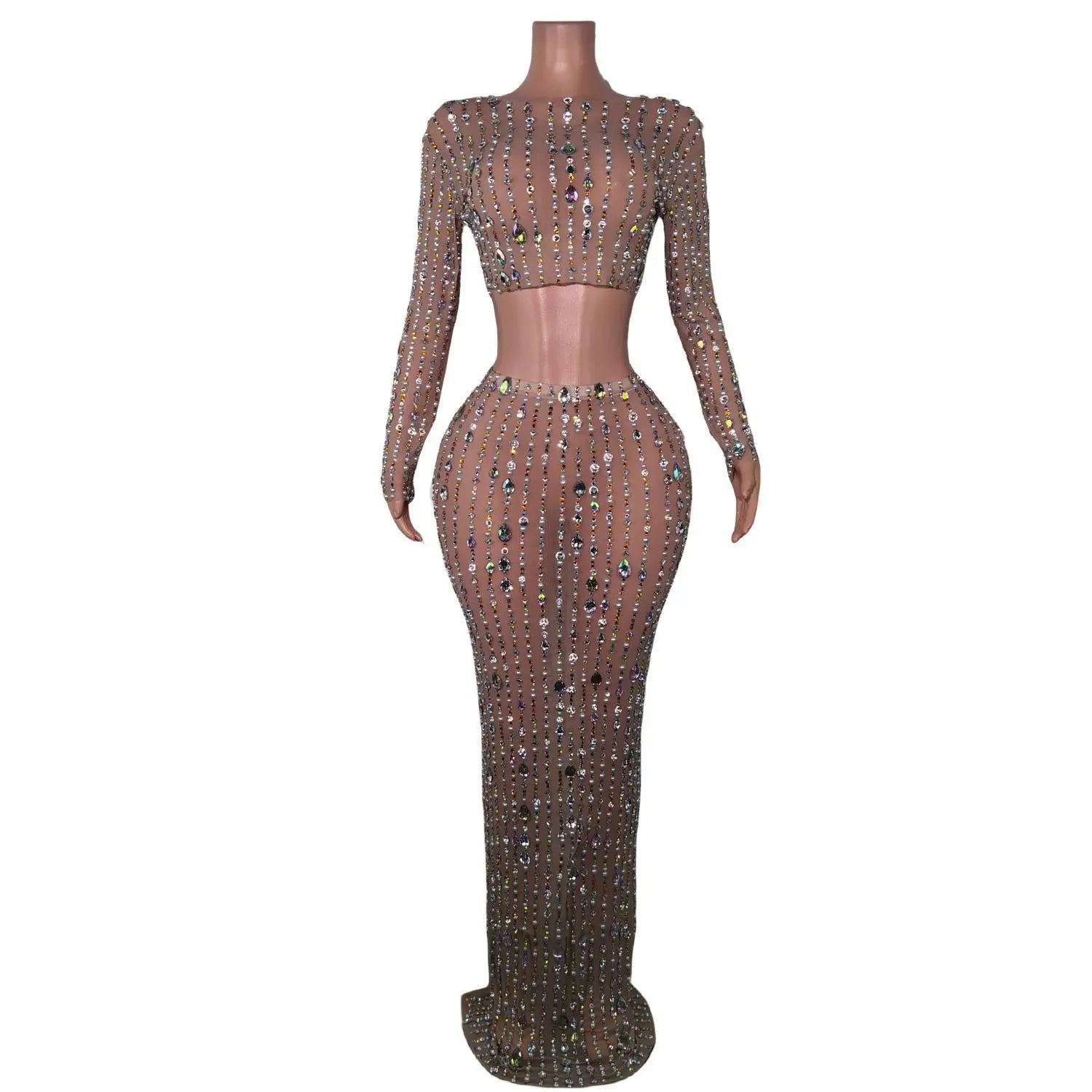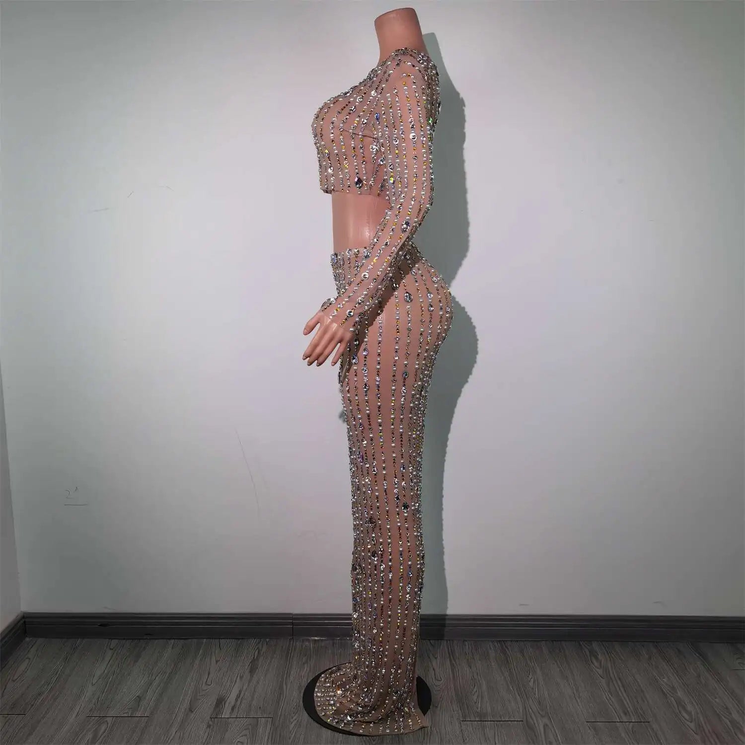 Elevate your special‑occasion look with this Shining Diamonds Prom Gown — a two‑piece set featuring a pearl‑embellished transparent top paired with a luminous skirt. Designed to glimmer under flash and stage lighting, this ensemble blends delicate illusion details with couture sparkle for birthdays, proms, photoshoots, and high‑glam parties.