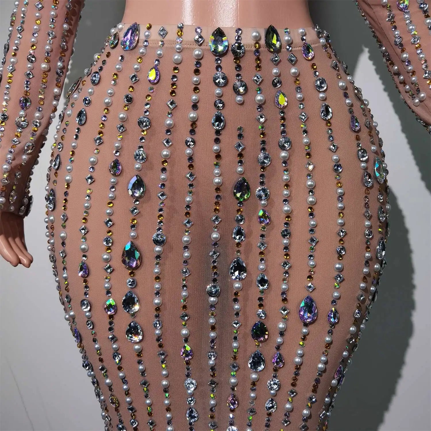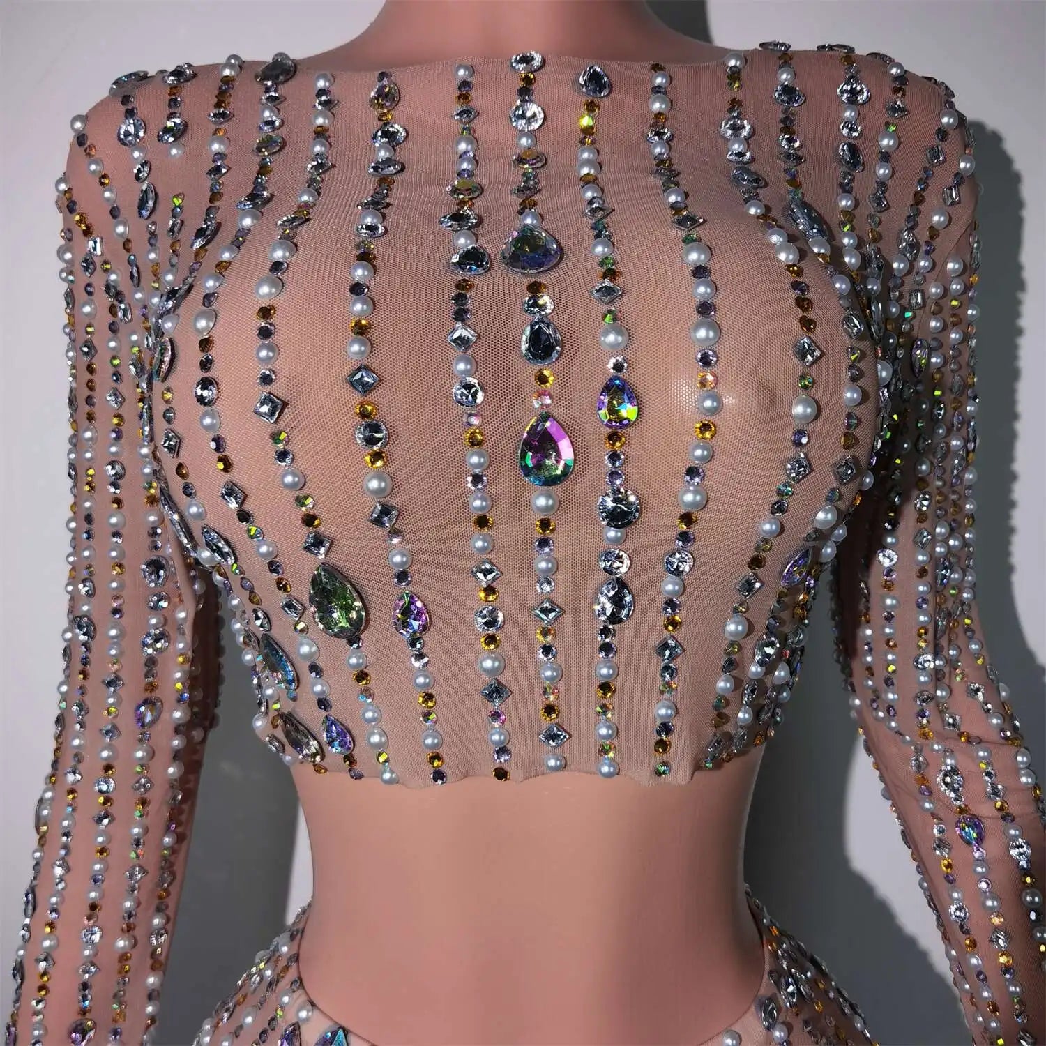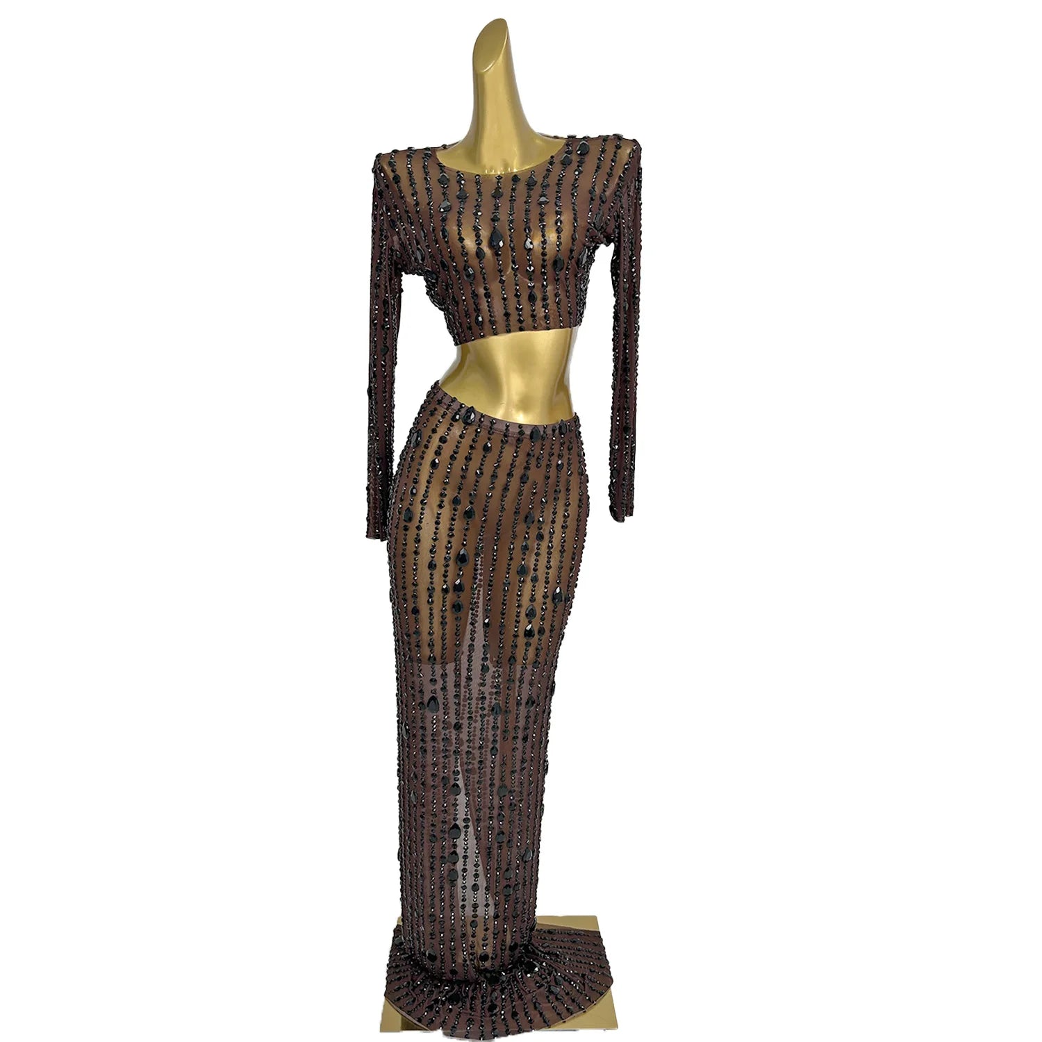 Elevate your special‑occasion look with this Shining Diamonds Prom Gown — a two‑piece set featuring a pearl‑embellished transparent top paired with a luminous skirt. Designed to glimmer under flash and stage lighting, this ensemble blends delicate illusion details with couture sparkle for birthdays, proms, photoshoots, and high‑glam parties.