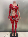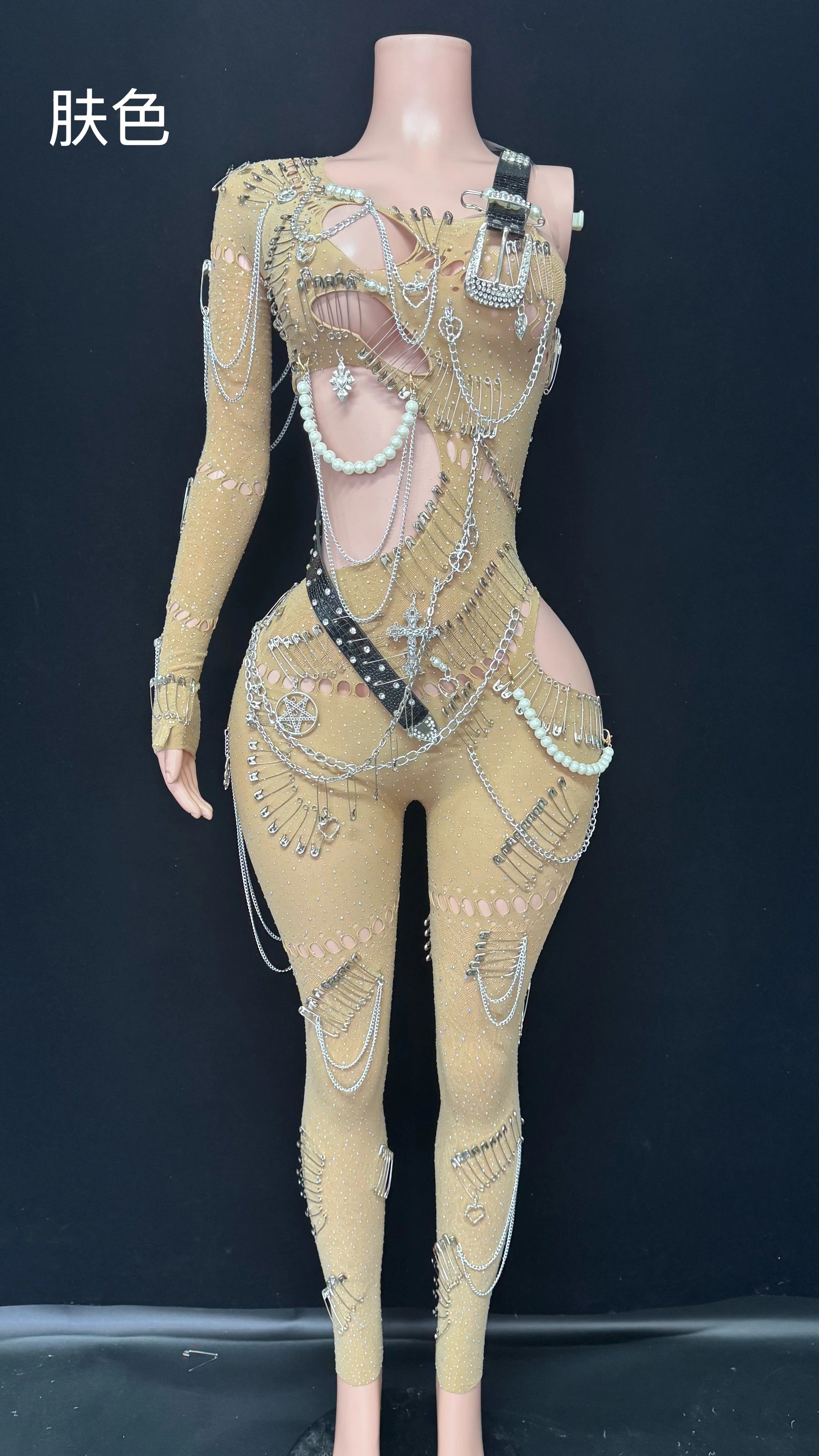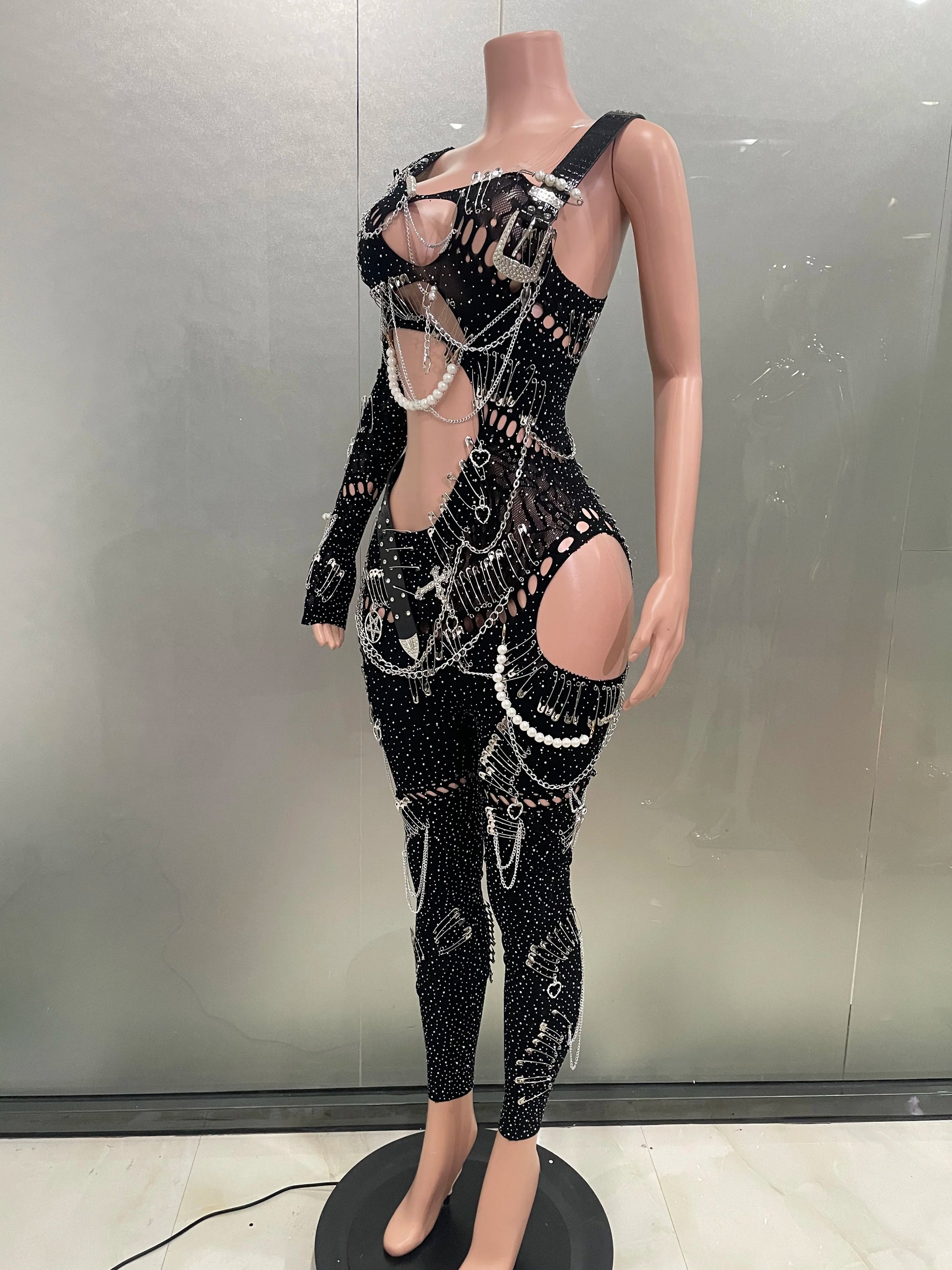 Brillez d'élégance dans cette combinaison asymétrique ornée d'une chaîne de perles scintillantes et d'une élégante coupe ajourée. Parfaite pour les femmes qui souhaitent se démarquer lors d'anniversaires, en boîte de nuit ou sur scène, en tant que chanteuse ou artiste. Cette tenue de scène sexy et unique vous permettra de vous démarquer et d'attirer tous les regards avec un charme sophistiqué.