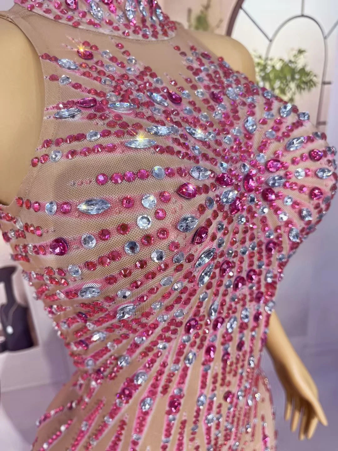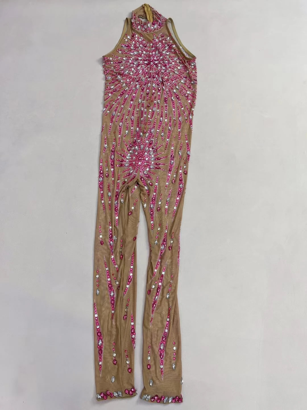Elevate your stage presence with the Shining Pink Rhinestones Jumpsuit, a bold, high‑glamour one‑piece designed for singers, dancers, performers, club nights, birthday celebrations, and showstopping appearances. This sexy, partially transparent costume fuses sultry silhouette design with dense pink rhinestone embellishment to create a luminous look that reads brilliantly on camera and under stage lights.