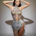 Éblouissez votre public avec cette robe à pampilles et strass scintillants, spécialement conçue pour les femmes qui aiment être sous les projecteurs. Confectionnée en résille élastique, cette robe sexy et moulante offre un effet de perspective saisissant tout en offrant confort et souplesse à chaque mouvement. Des strass scintillants et des cristaux créent un éclat scintillant, sublimé par des pampilles ludiques qui se balancent gracieusement au gré de vos pas. Idéale pour les chanteuses, les représentations sur scène, les spectacles de danse latine et les soirées glamour en boîte de nuit, cette robe époustouflante vous assure assurance et charme en toute occasion.