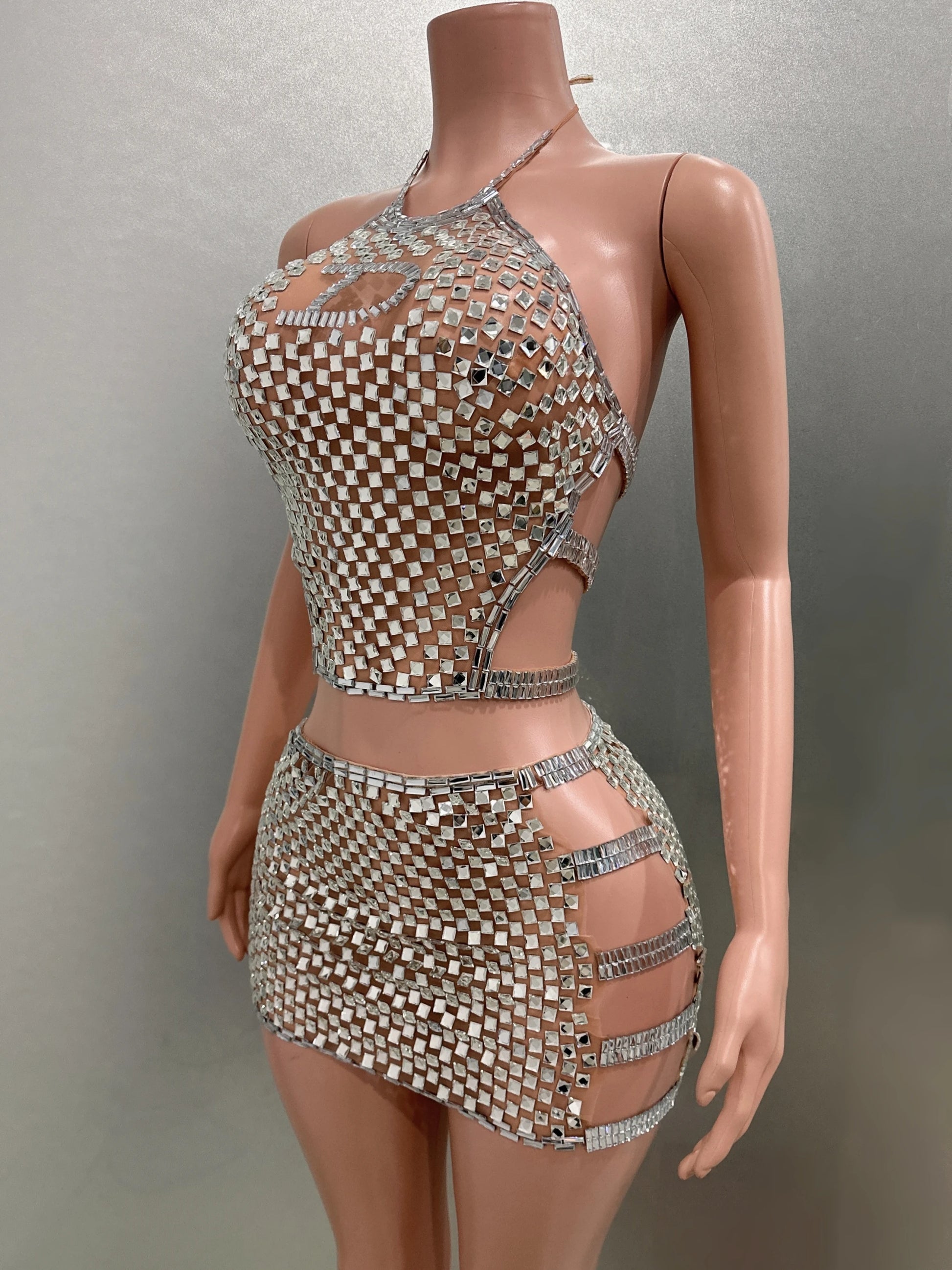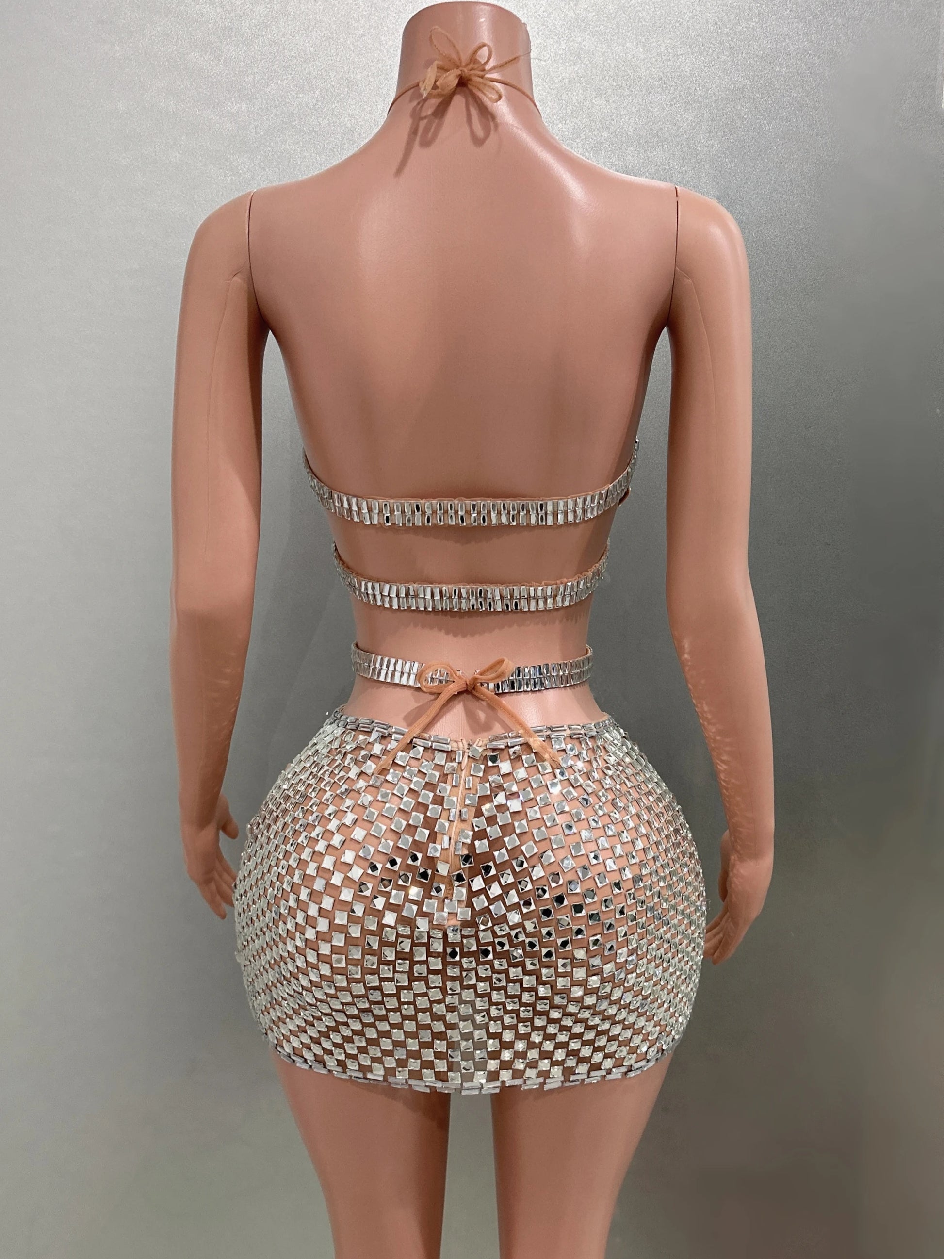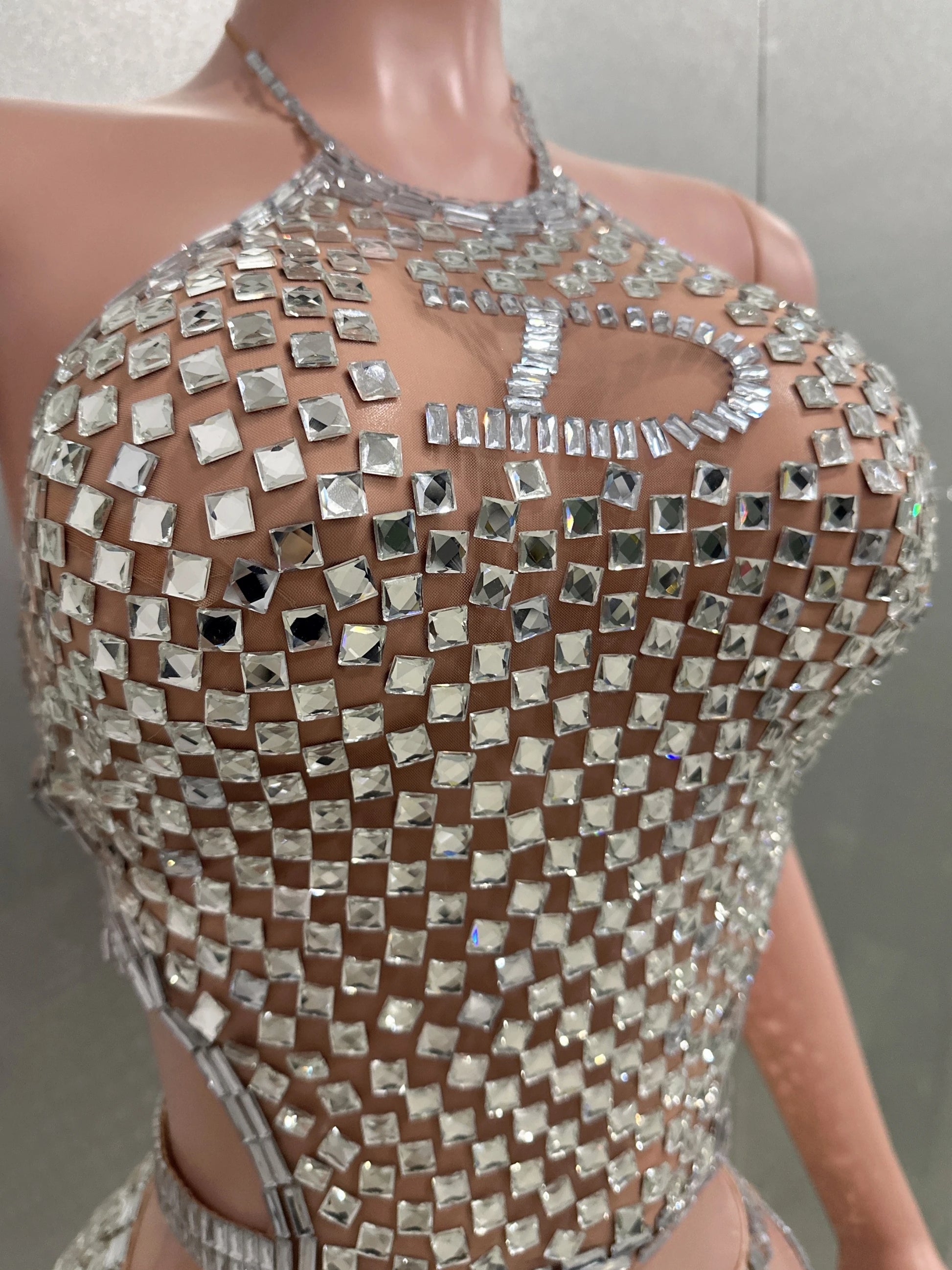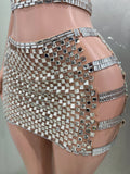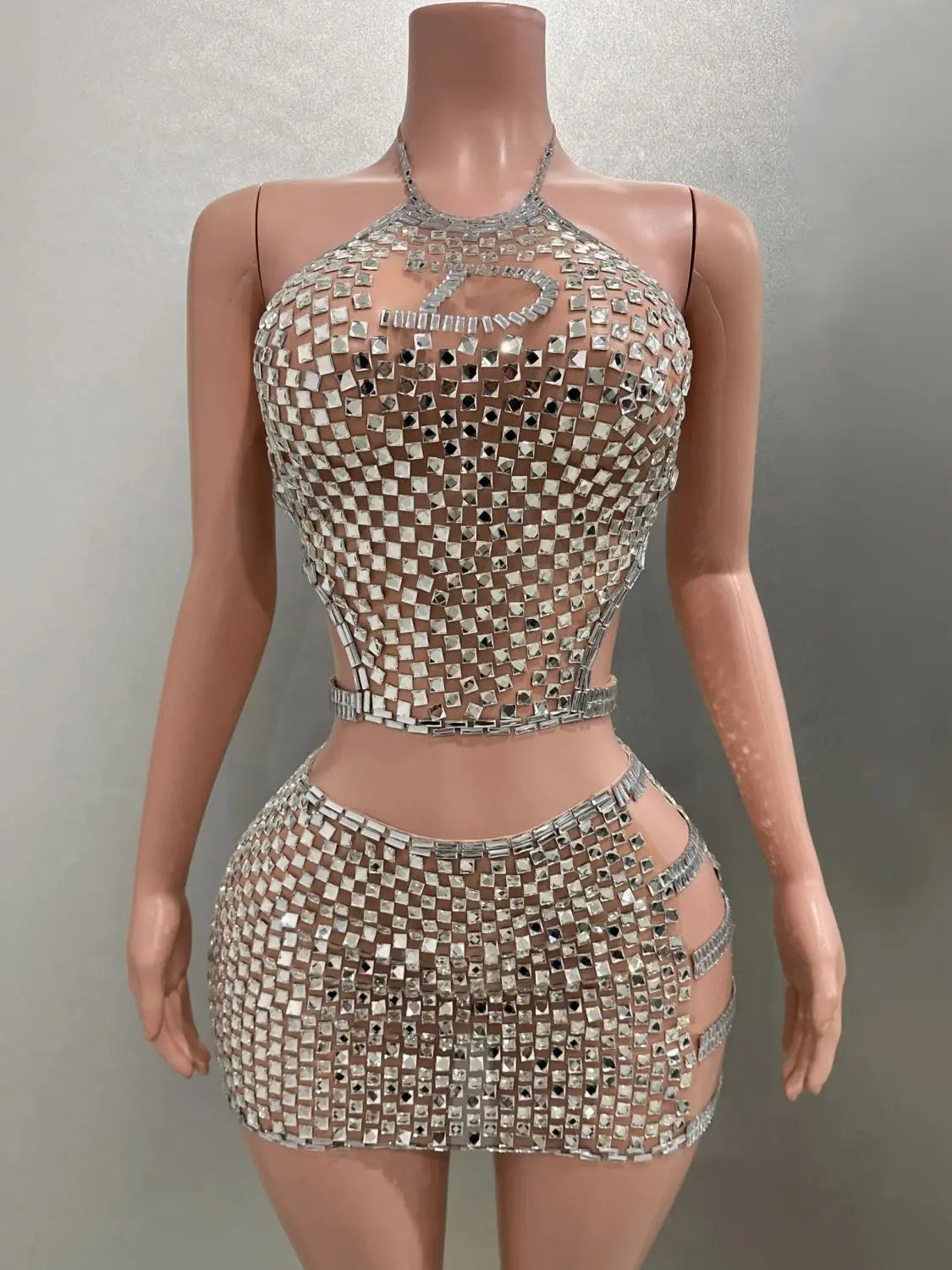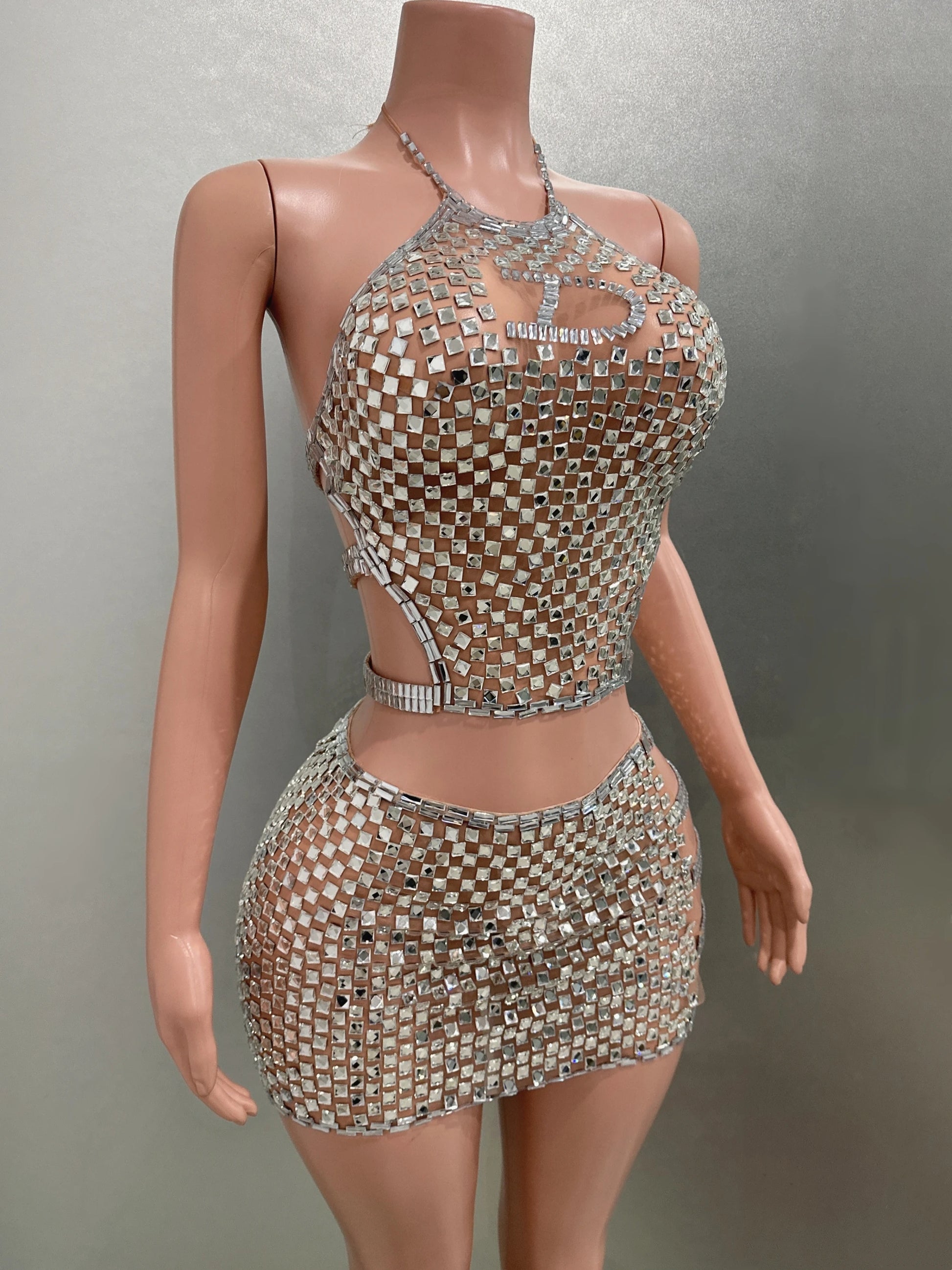Brillez toute la nuit avec cet éblouissant ensemble mini fourreau deux pièces, orné de diamants en cristal scintillants et d'un design argenté sexy et transparent. Idéal pour les femmes qui fêtent un anniversaire, organisent une fête ou se produisent sur scène, ce costume accrocheur vous permettra de vous démarquer avec un style glamour et radieux à chaque événement.