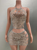 Costume deux pièces sexy transparent pour femme, mini-robe fourreau avec cristaux brillants et diamants argentés, idéal pour une fête d'anniversaire ou une performance