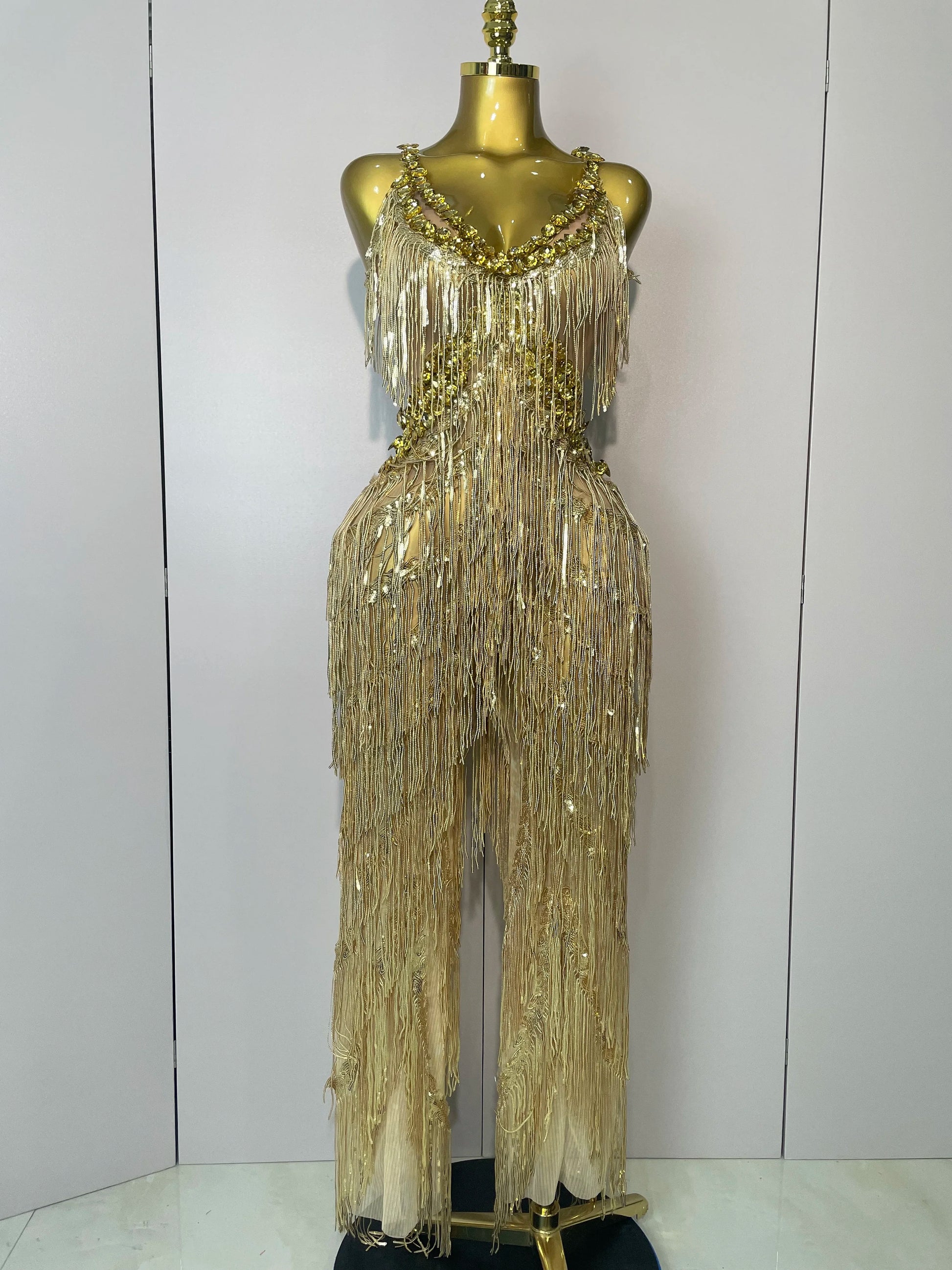 Faites une entrée éclatante dans cette combinaison large dorée brillante, ornée de strass scintillants et de franges pailletées. Conçue pour les femmes audacieuses et glamour, cette tenue sexy est parfaite pour les soirées, les boîtes de nuit ou pour faire sensation sur scène. Avec sa coupe flatteuse et ses mouvements accrocheurs, c'est aussi le choix idéal des chanteuses et artistes en quête d'un costume exceptionnel. Volez la vedette et brillez toute la nuit avec cette combinaison de soirée époustouflante.