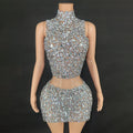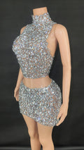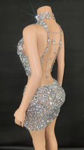 Turn heads at any event with this stunning mini dress, adorned with sparkling silver rhinestones for a dazzling effect. Featuring a sexy backless design and figure-hugging fit, this dress is perfect for evening performances, nightclub appearances, stage shows, or birthday celebrations. Make a bold statement and shine under the lights with this eye-catching performance costume.