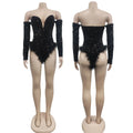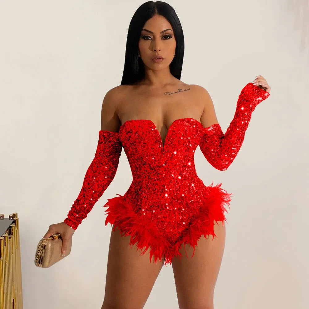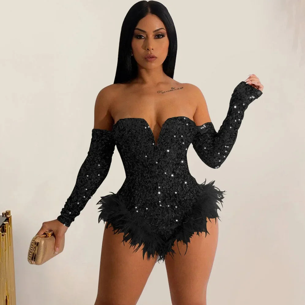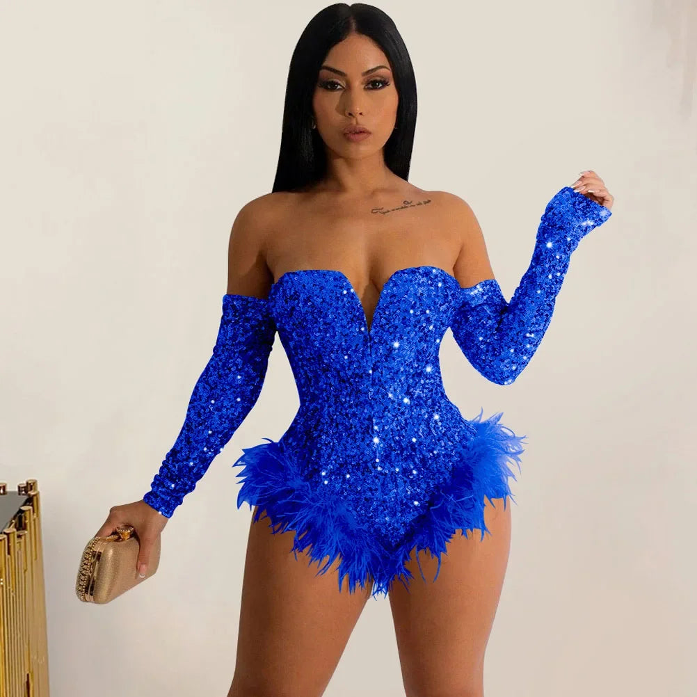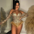 Body à plumes argenté et doré pour femme, combinaison bustier, barboteuse, soirée, boîte de nuit, sexy, moulante, corset
