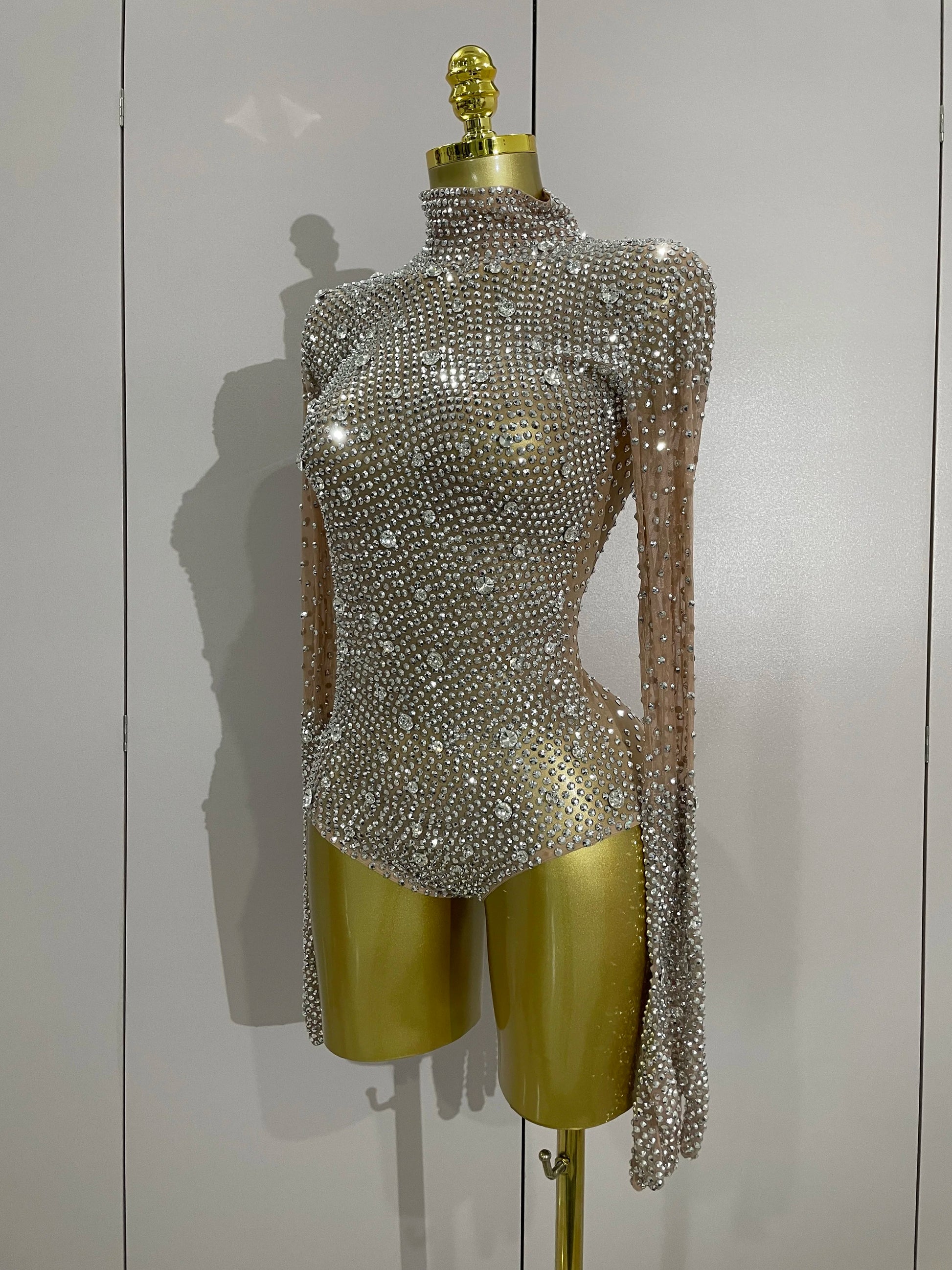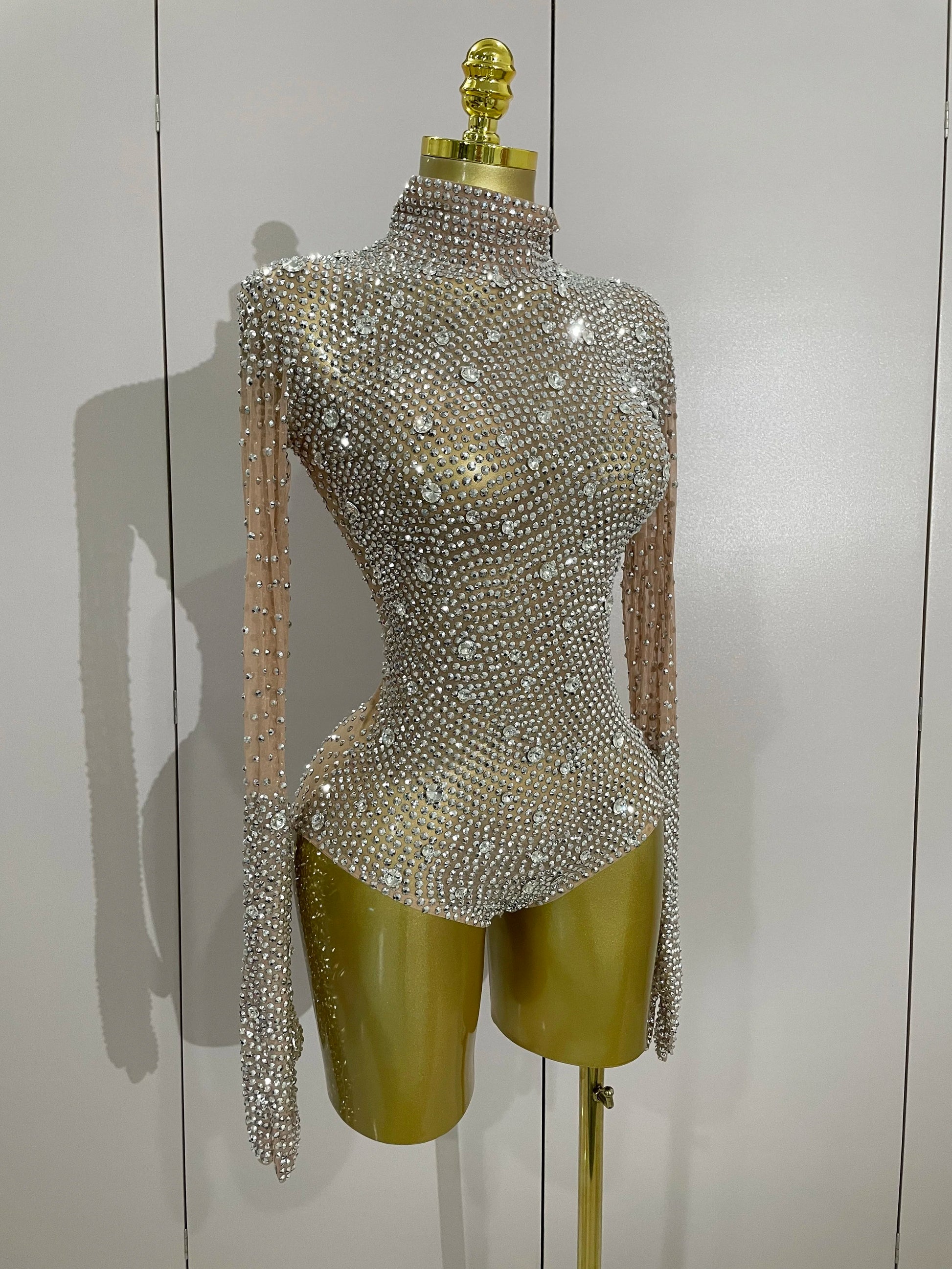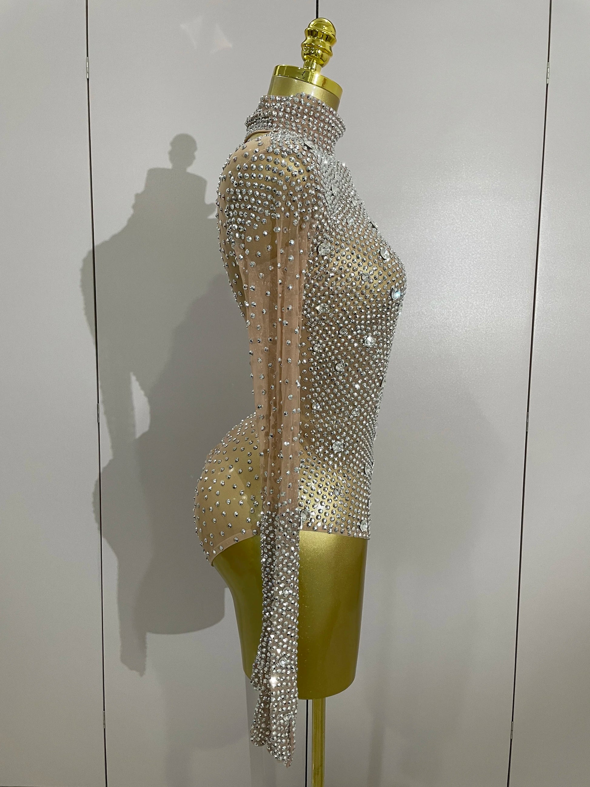Introduce a luxe, stage‑ready piece: the Sparkle Rhinestones Long‑Sleeve Gloves Stretch Bodysuit — a fitted, full‑coverage bodysuit with long sleeves that extend into glove cuffs, covered in rhinestones/crystals for maximum sparkle under lights. Designed for performers, club nights, birthday celebrations, and evening events where glam and movement meet.