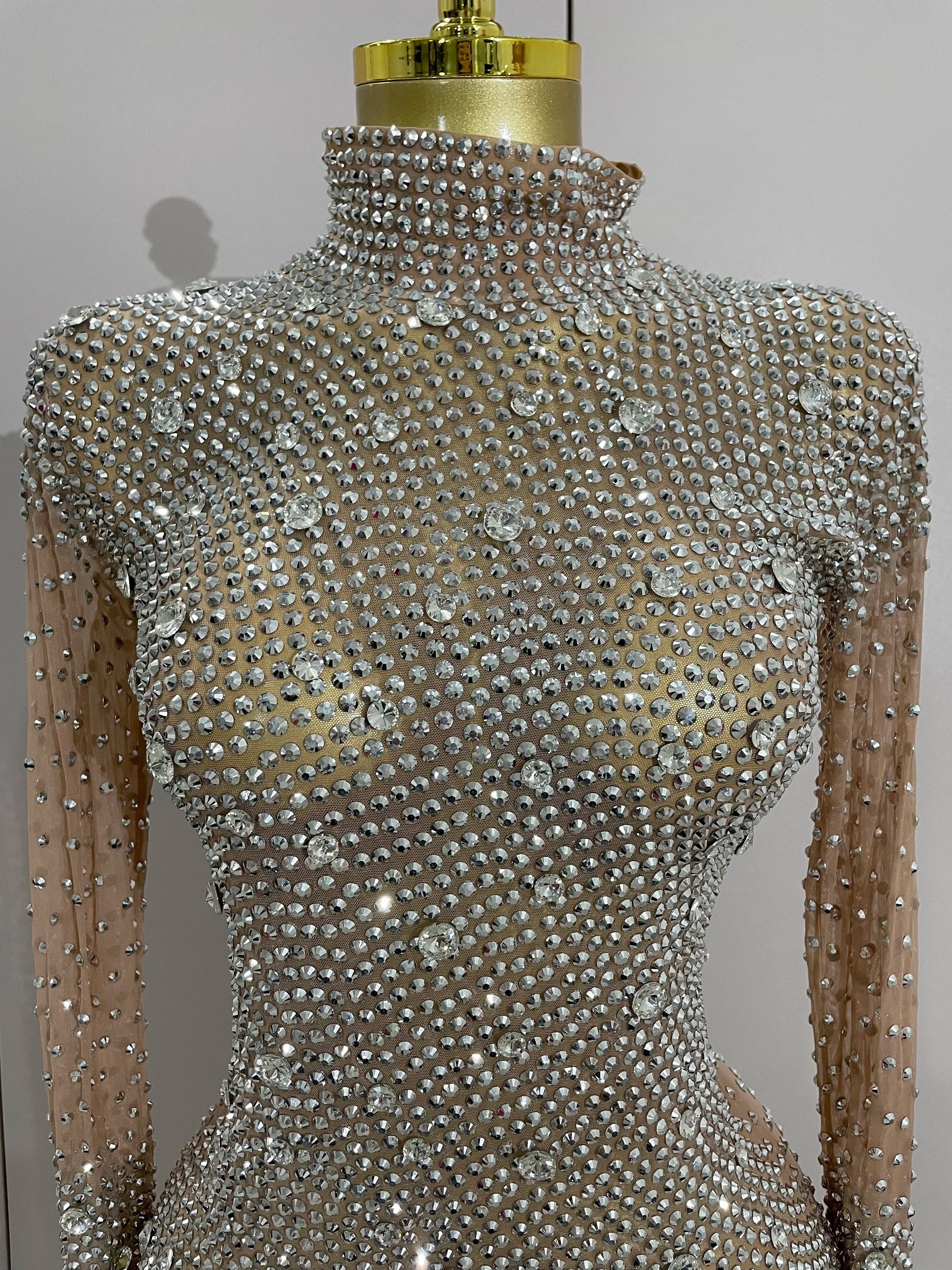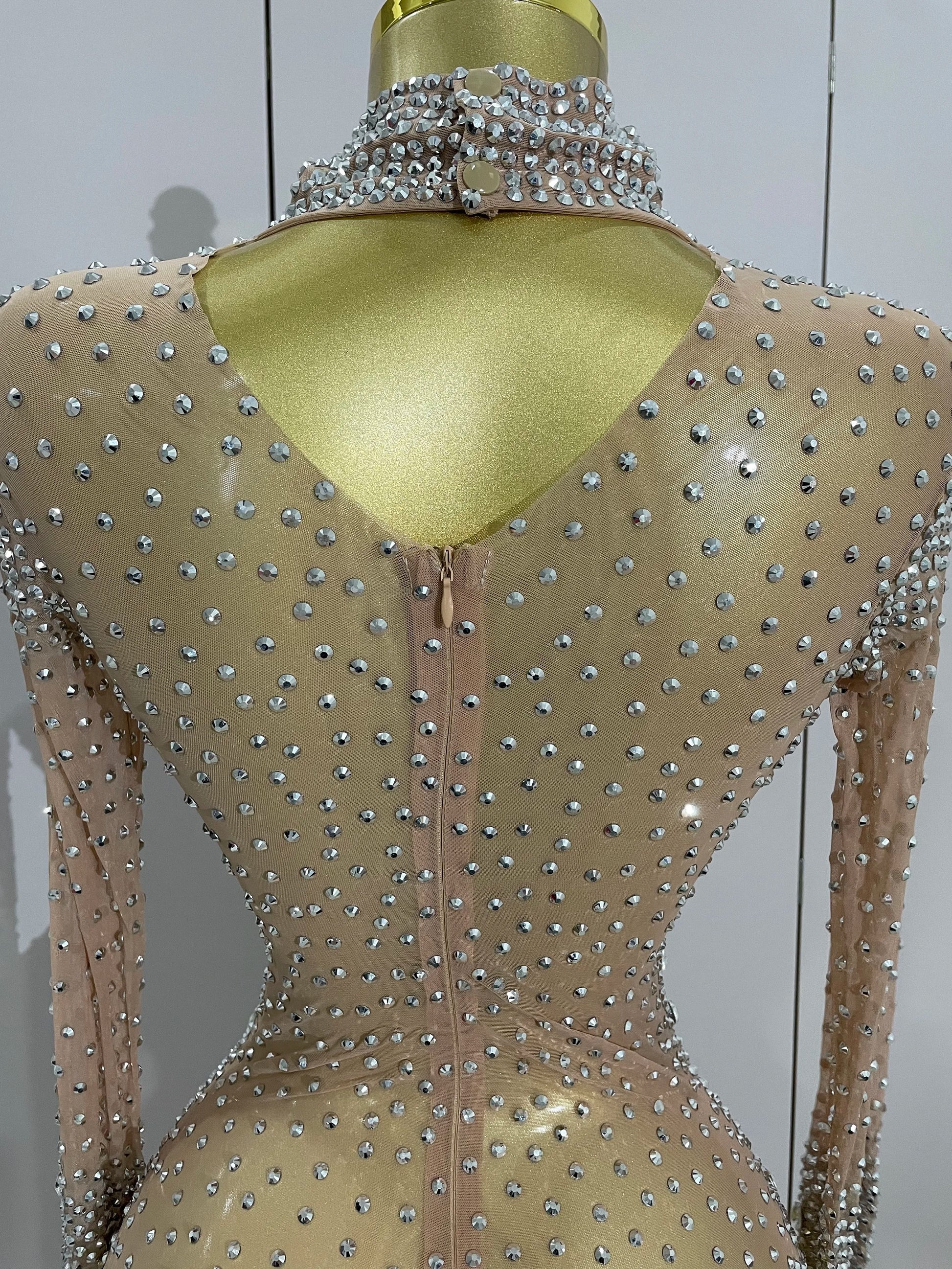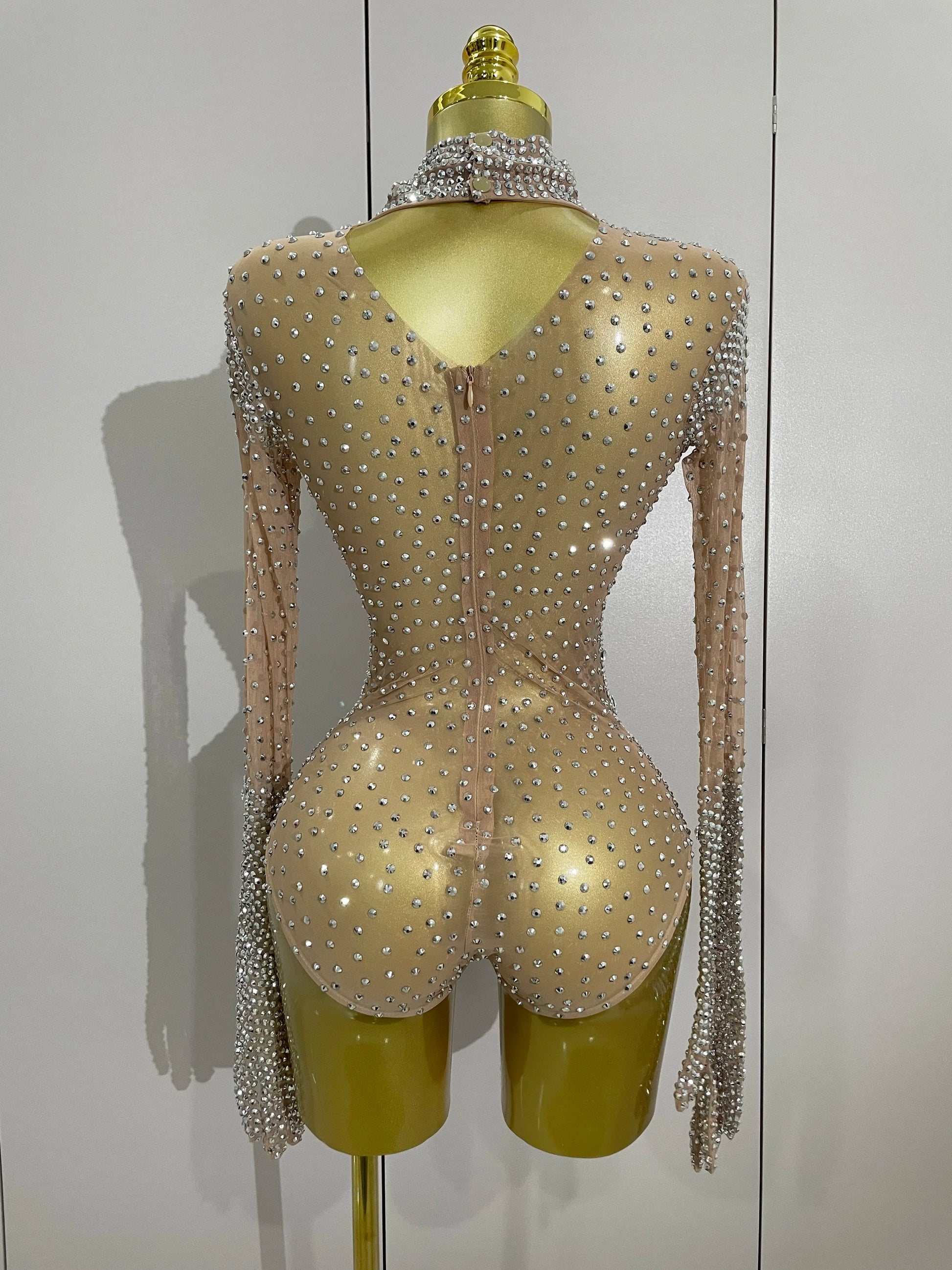 Introduce a luxe, stage‑ready piece: the Sparkle Rhinestones Long‑Sleeve Gloves Stretch Bodysuit — a fitted, full‑coverage bodysuit with long sleeves that extend into glove cuffs, covered in rhinestones/crystals for maximum sparkle under lights. Designed for performers, club nights, birthday celebrations, and evening events where glam and movement meet.