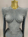 Body extensible à manches longues avec strass argentés scintillants pour femme, tenue de soirée de luxe, fête d'anniversaire, boîte de nuit, costume de scène