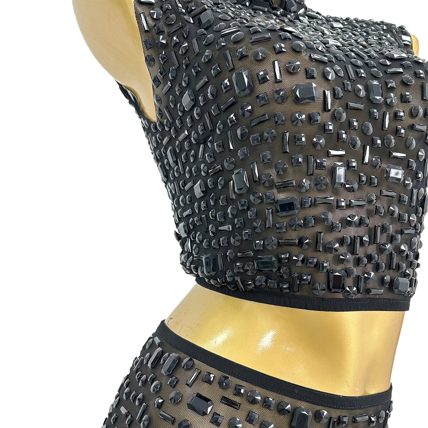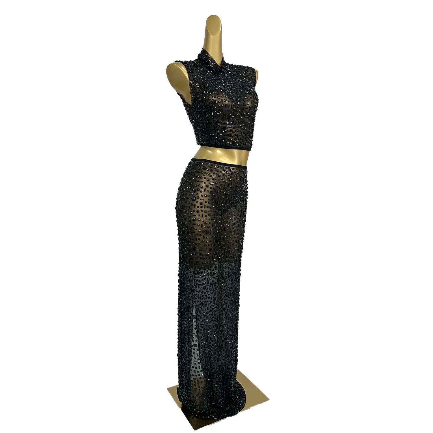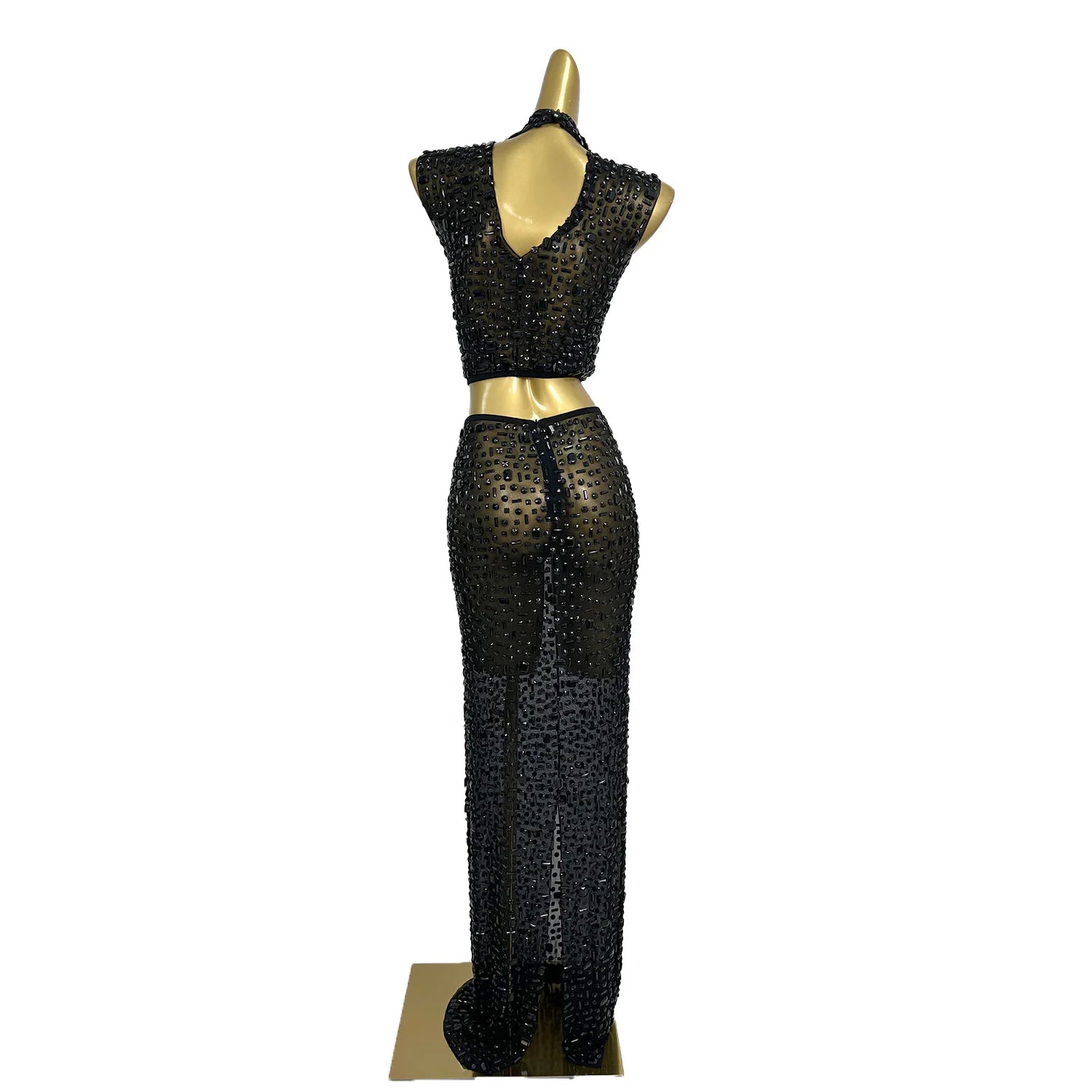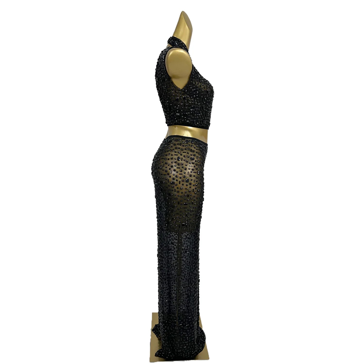 Sparkly Black Diamonds Crop Top Long Skirt 2 Pieces Set Sexy Celebrate Evening Prom Birthday Dress Photo Shoot Wear