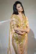 Sparkly Gold Sequins Mesh Celebrate Evening Prom Gown Long Dress Birthday Outfit Singer Stage Wear Show Costume