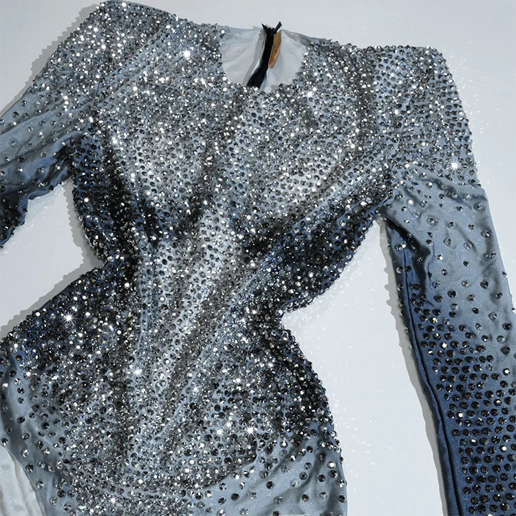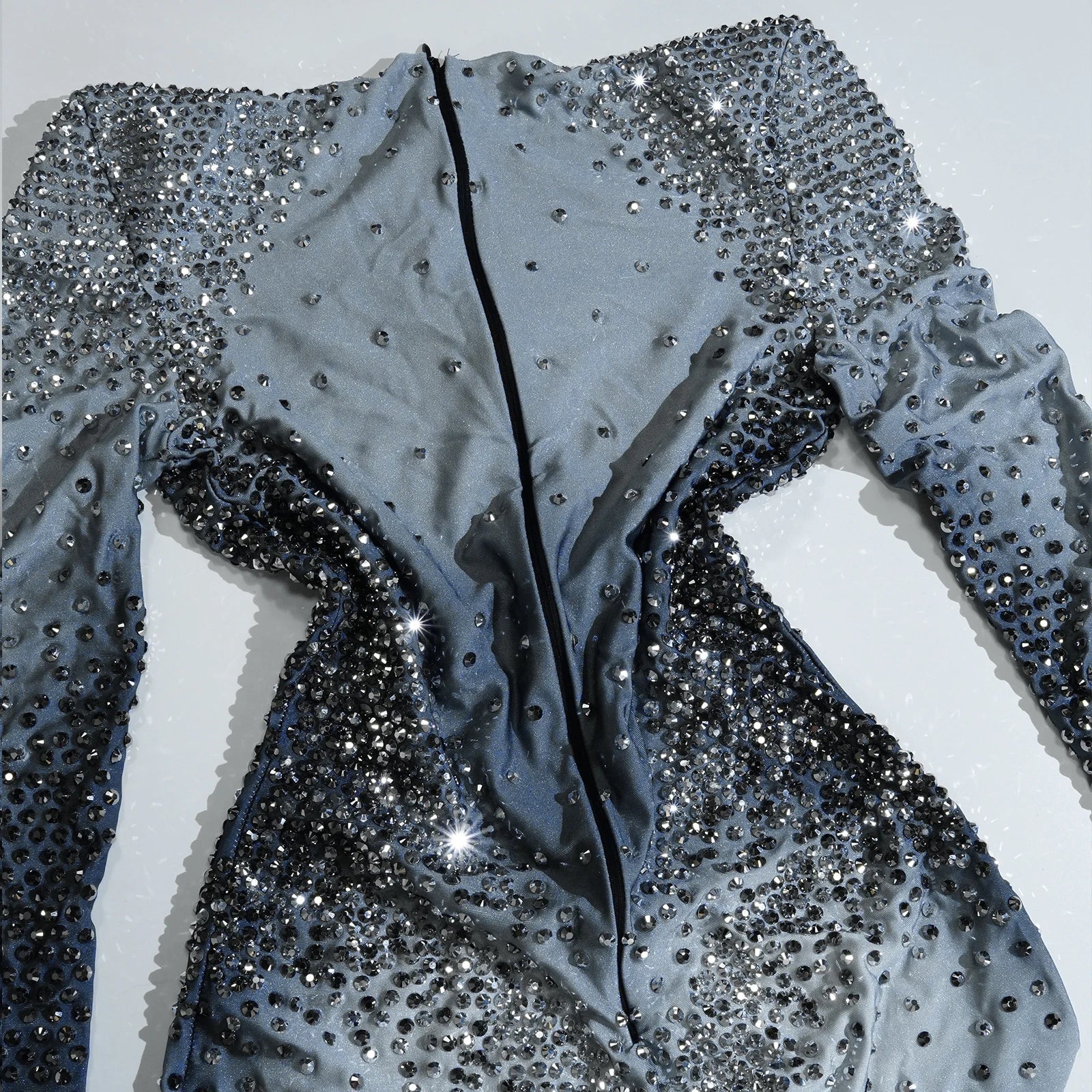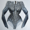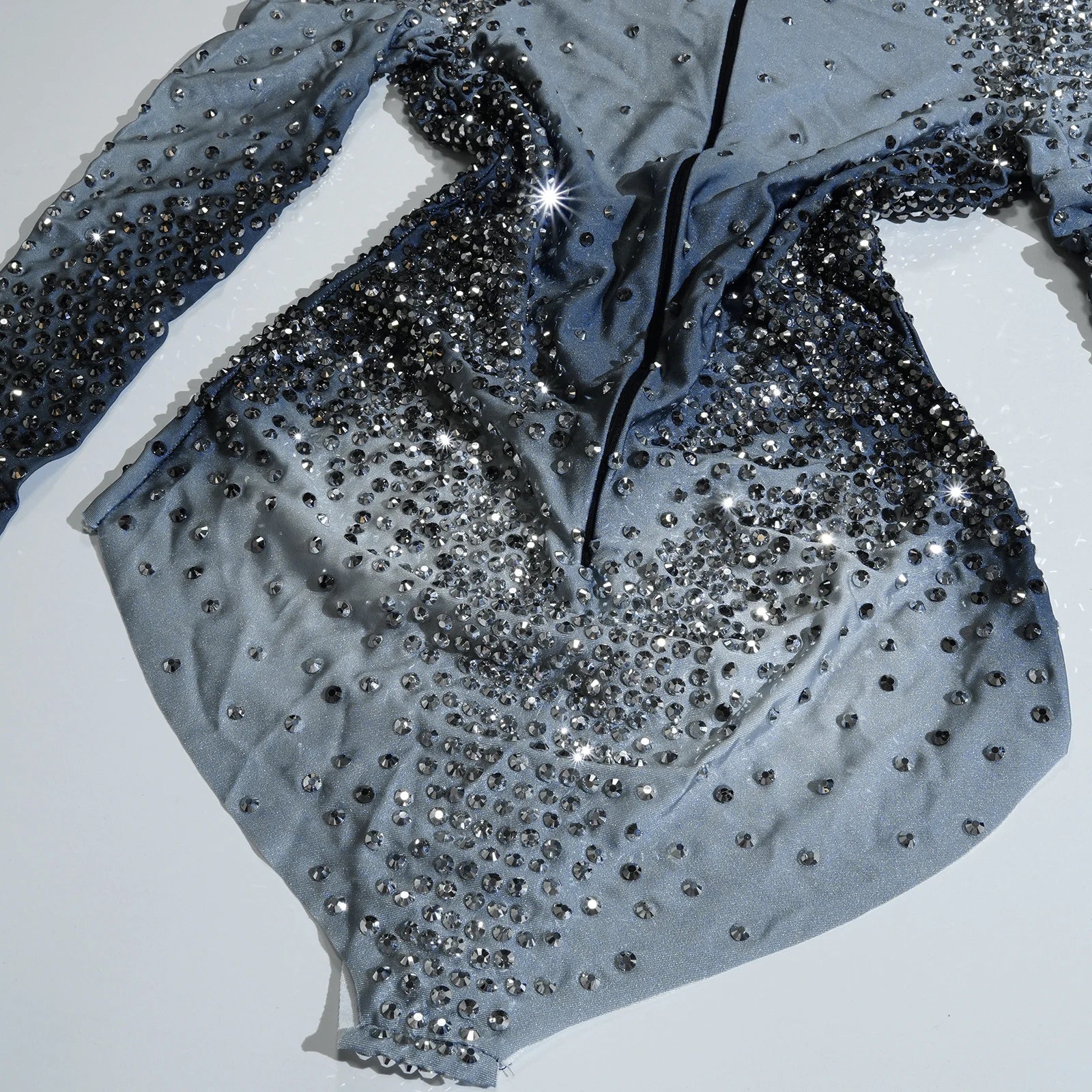 Justaucorps gris luxueux et scintillant avec strass pour fête, anniversaire, bar, discothèque, drag queen, pole dance, scène
