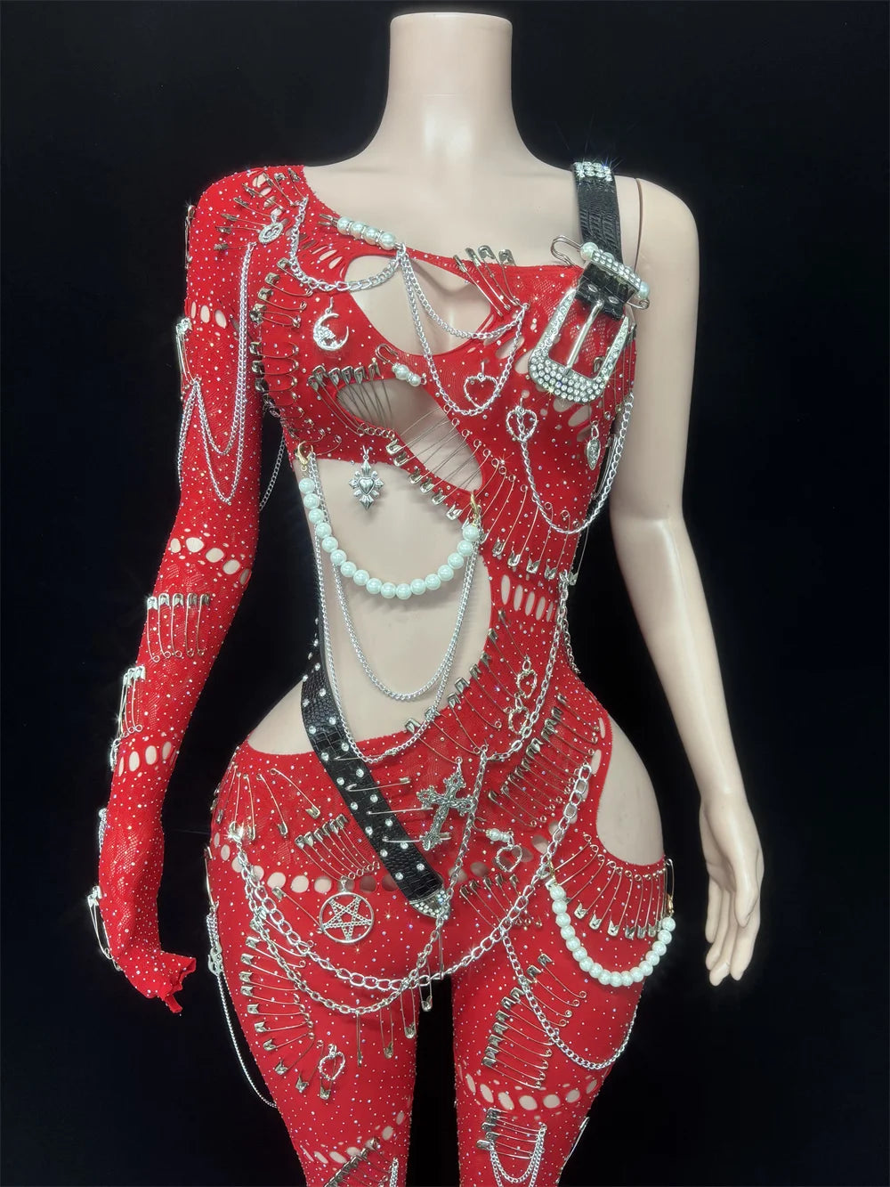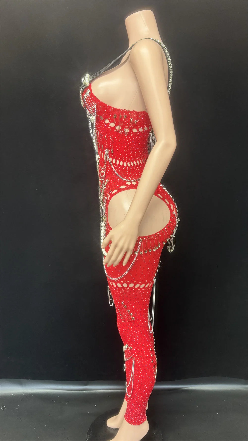 Faites tourner les têtes avec cette combinaison ajourée ornée de perles rouges scintillantes, conçue pour les femmes qui fêtent leur anniversaire ou qui attirent l'attention sur scène. Avec sa silhouette asymétrique sexy et ses perles éclatantes, ce costume de danse est parfait pour faire sensation lors de fêtes, de spectacles ou d'événements spéciaux. Glamour et accrocheur, c'est la tenue de scène idéale pour des moments inoubliables.