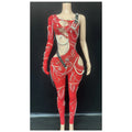 Combinaison ajourée à perles rouges scintillantes pour femme, tenue de fête d'anniversaire, sexy, asymétrique, tenue de danse, tenue de scène