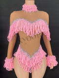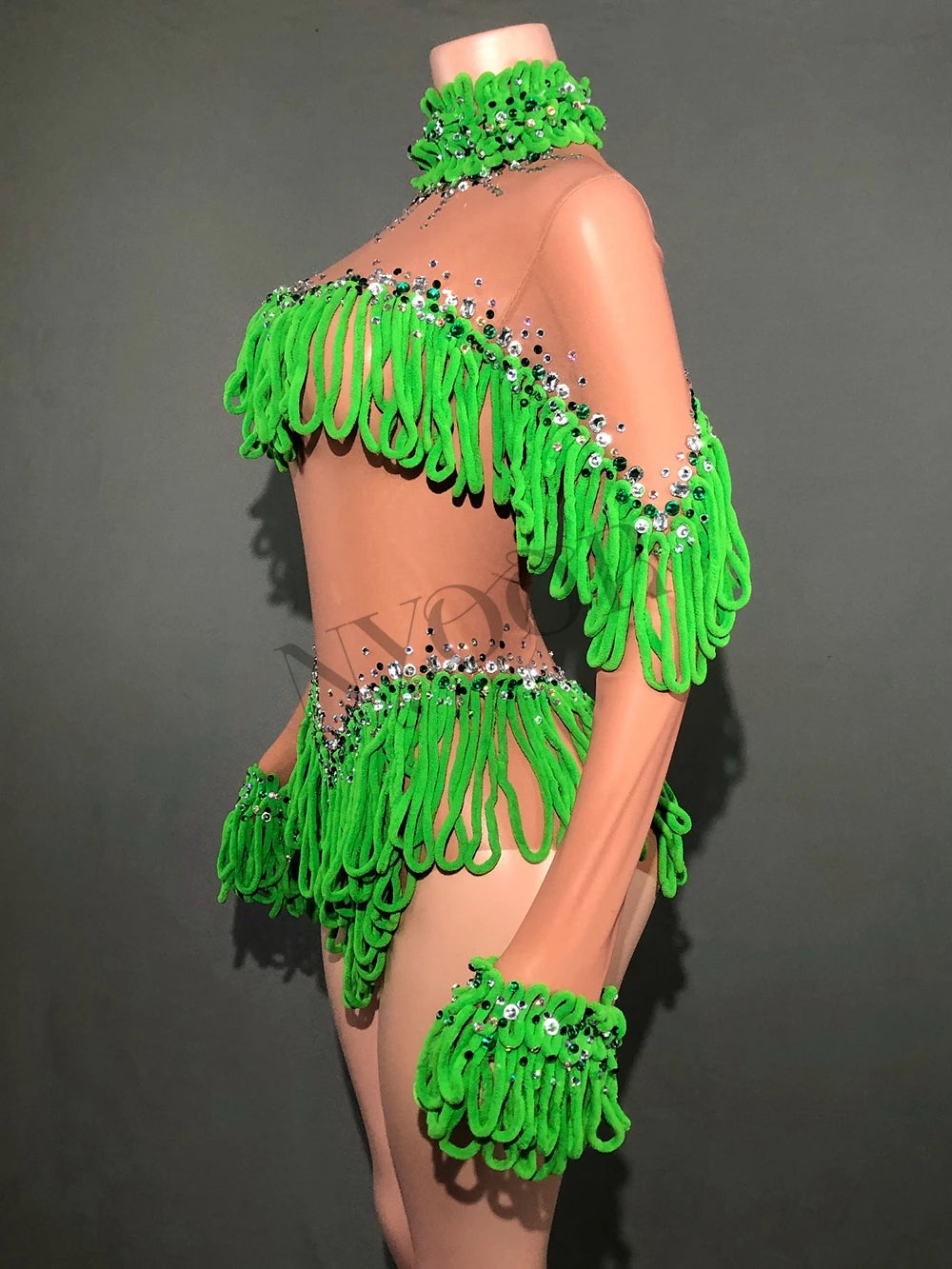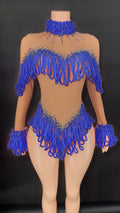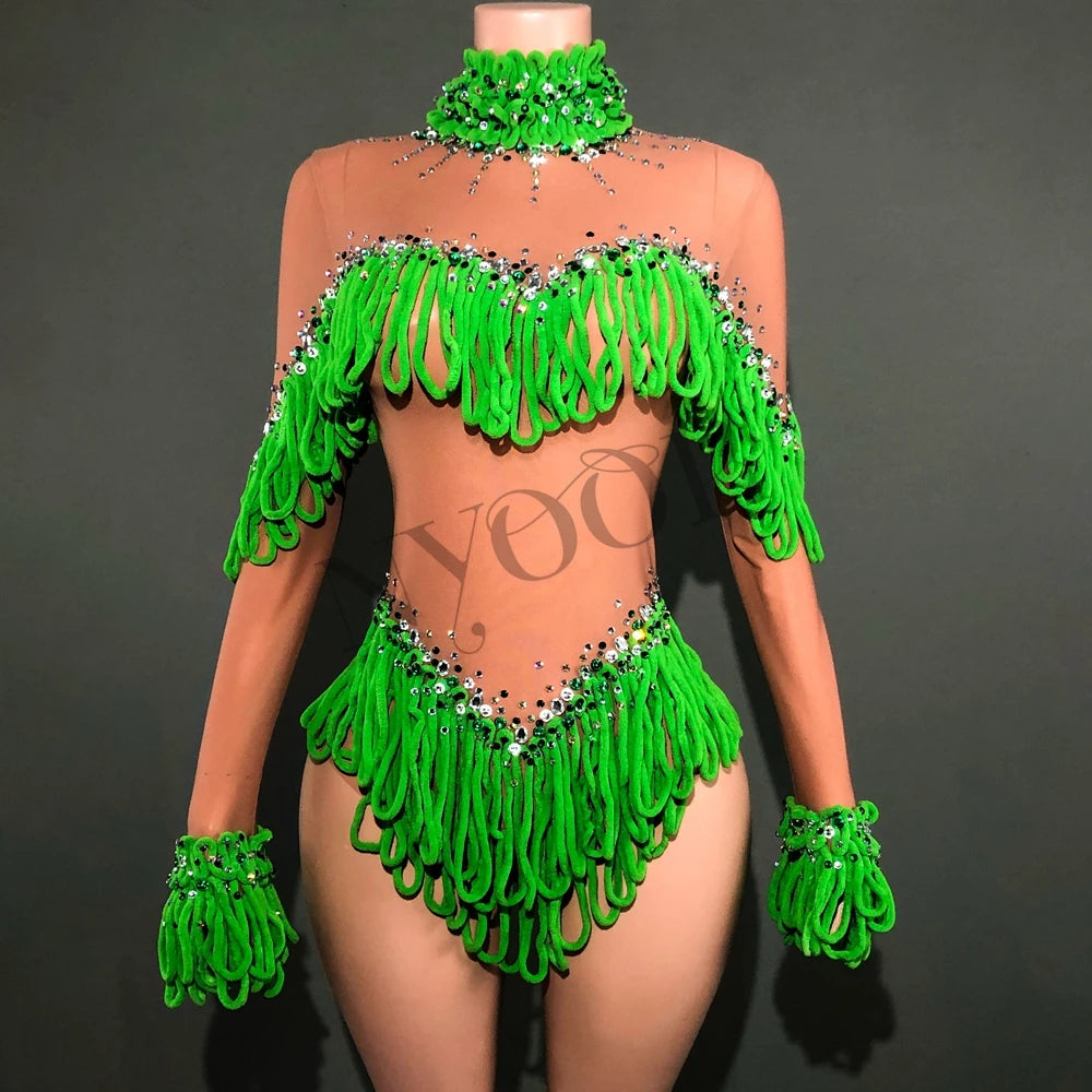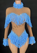 Sparkly Rhinestone Tassels Long Sleeves Bodysuit Women Sexy Mesh See Through Performance Dance Costume Stage Wear Party Outfit