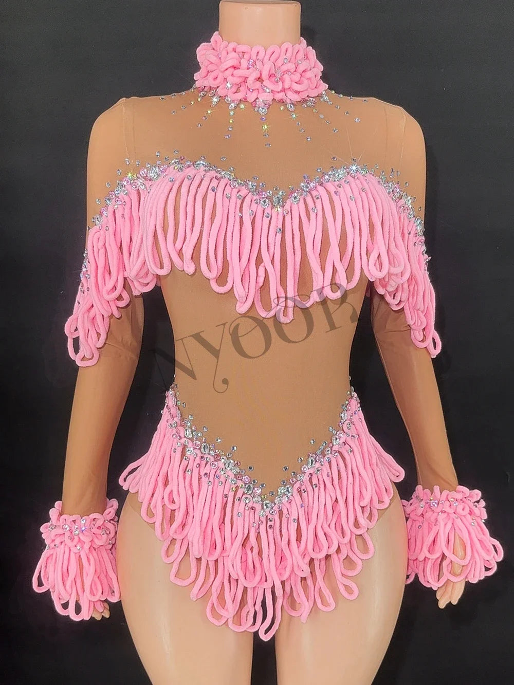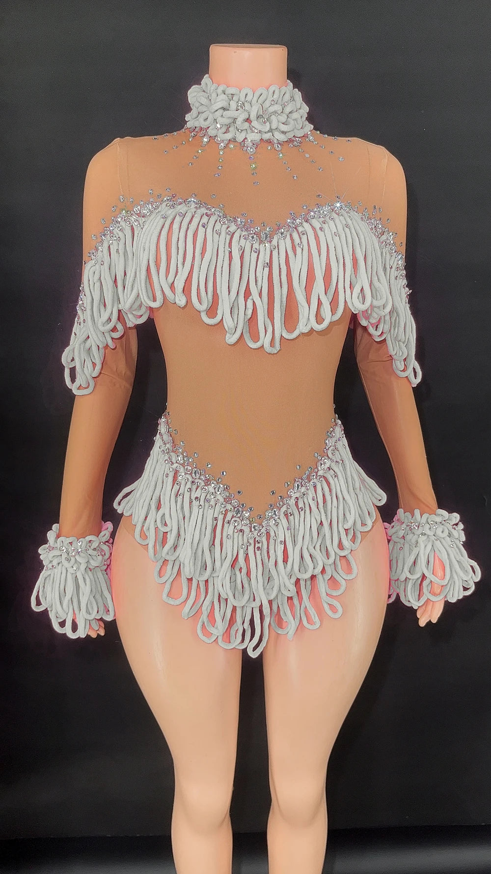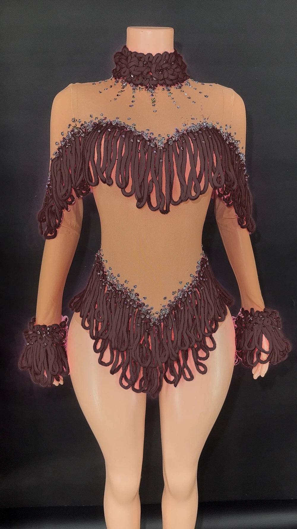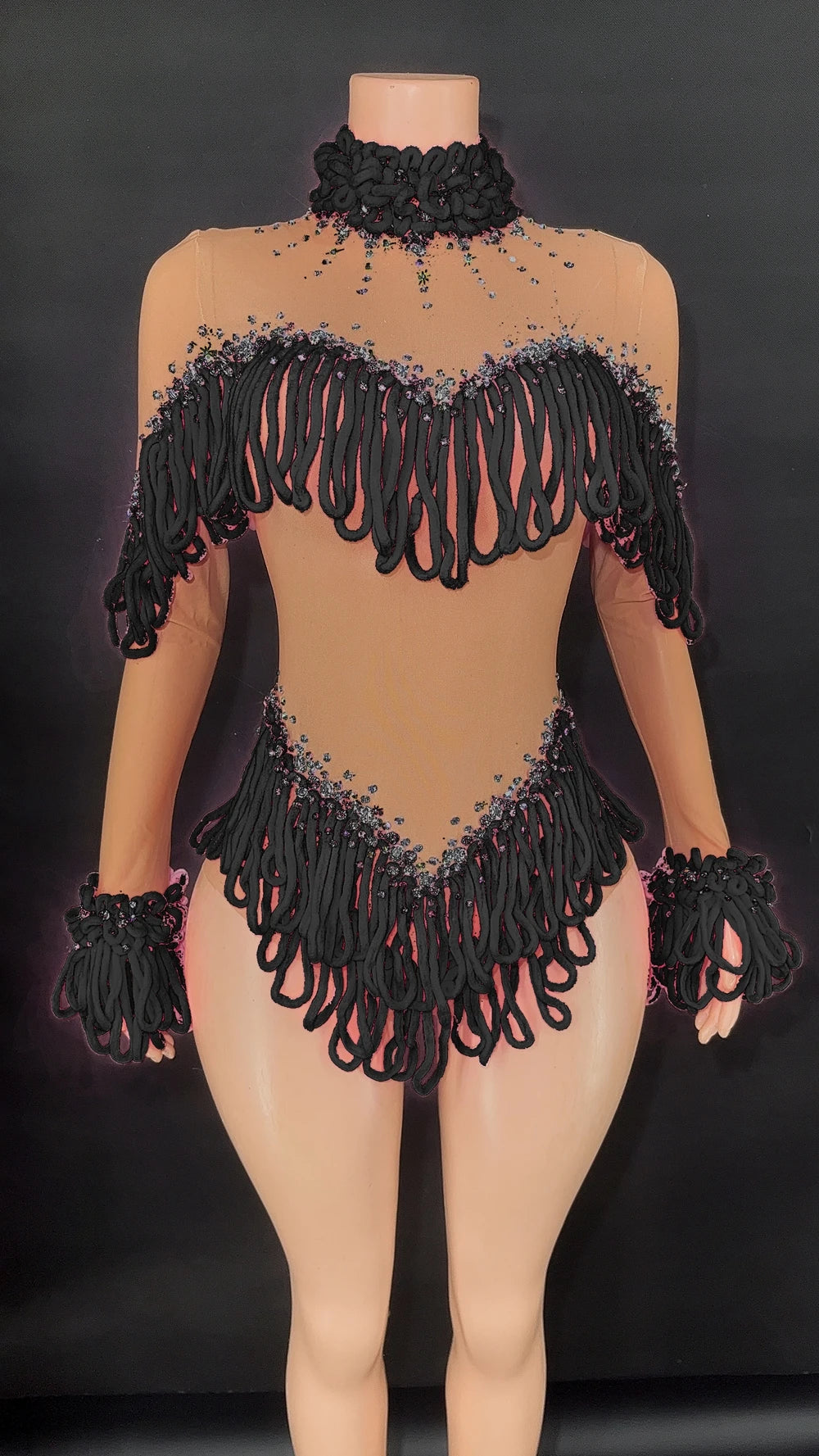 Elevate your stage presence with this Sparkly Rhinestone Tassels Long‑Sleeves Bodysuit — a sultry, high‑impact piece designed for dancers, performers, and party looks where movement, light, and glamour matter. This bodysuit combines sheer stretch mesh, densely placed rhinestones, and playful tassel details to create dramatic motion and brilliant sparkle under stage and event lighting.