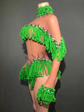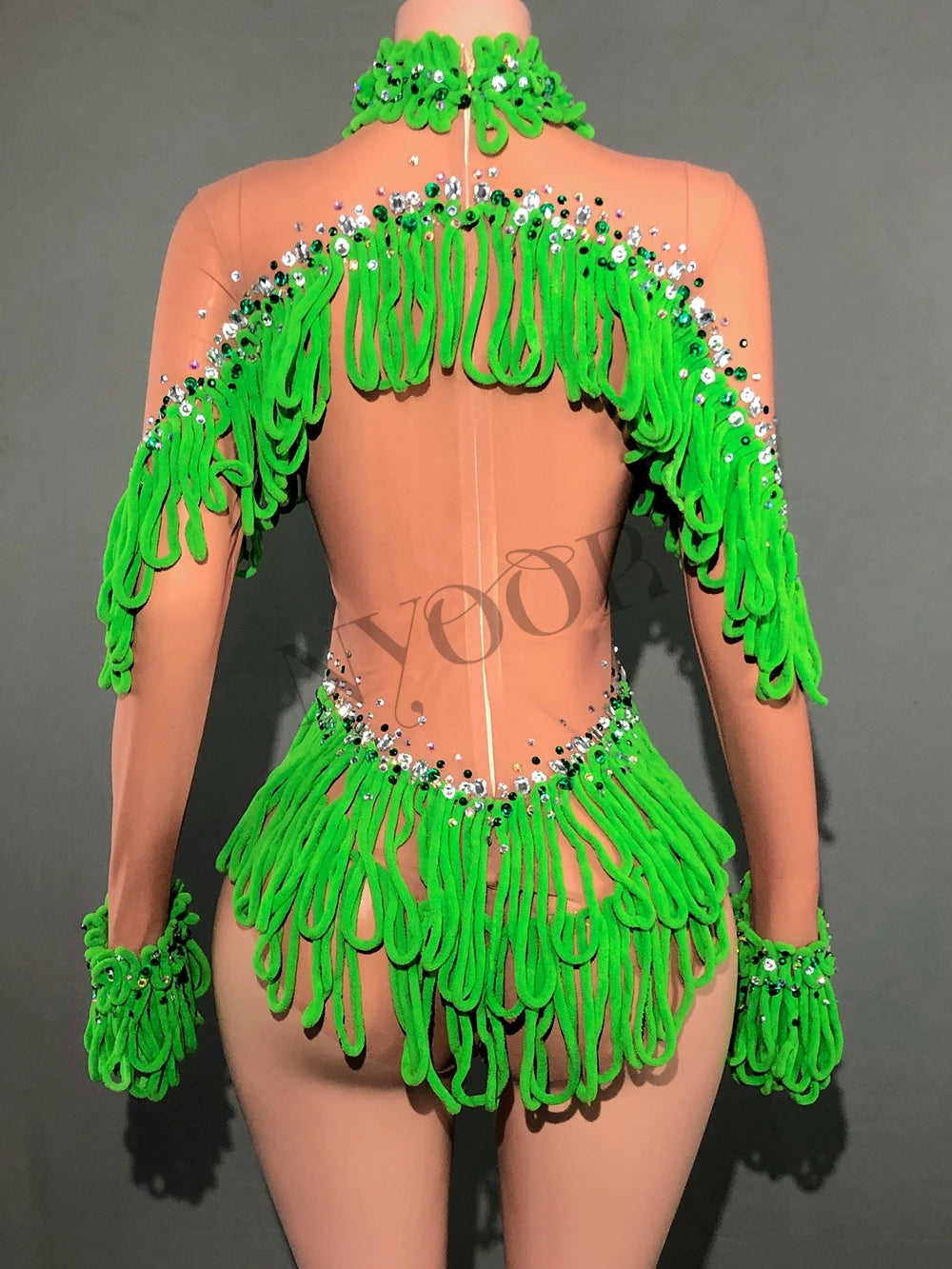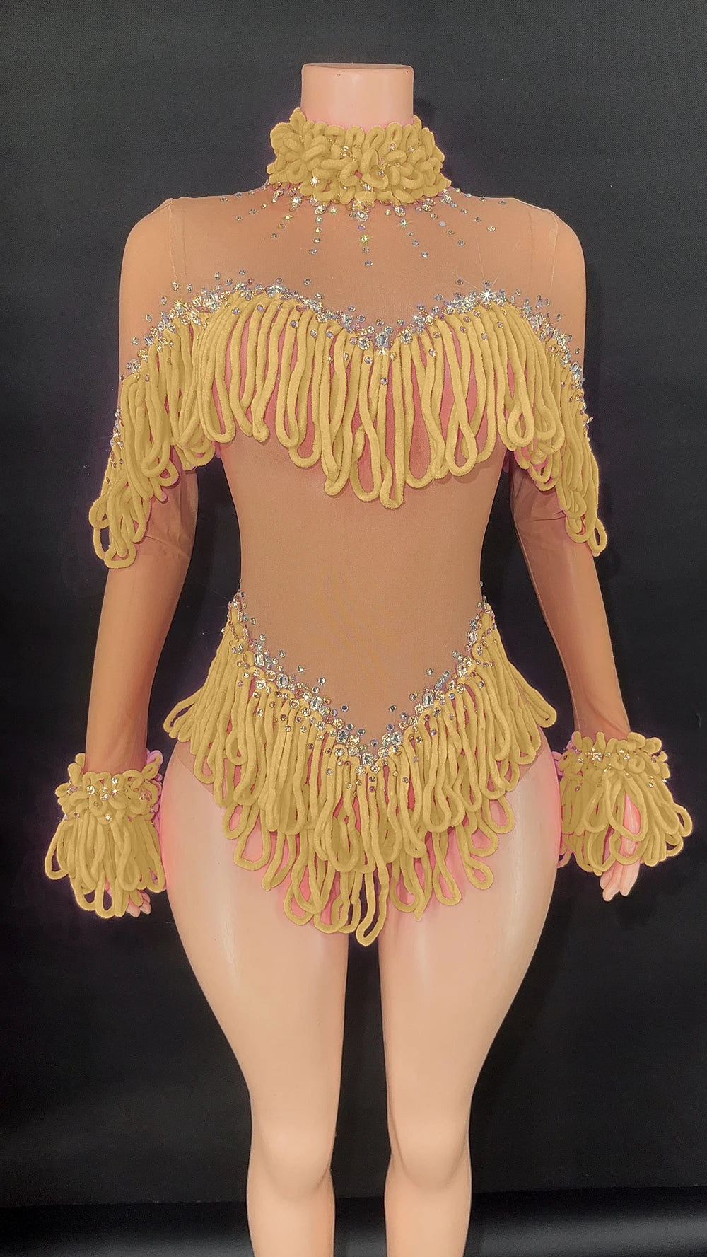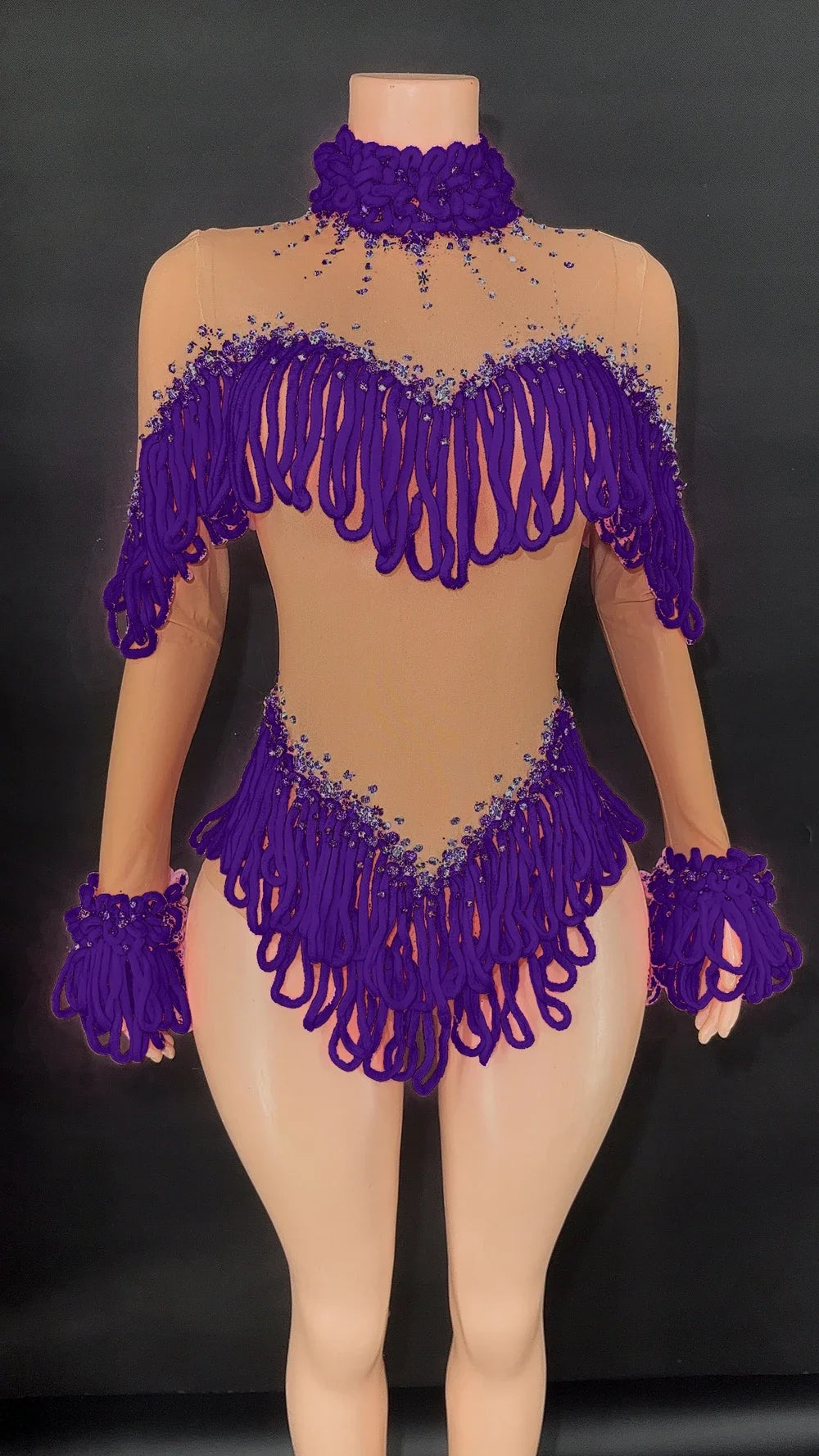 Elevate your stage presence with this Sparkly Rhinestone Tassels Long‑Sleeves Bodysuit — a sultry, high‑impact piece designed for dancers, performers, and party looks where movement, light, and glamour matter. This bodysuit combines sheer stretch mesh, densely placed rhinestones, and playful tassel details to create dramatic motion and brilliant sparkle under stage and event lighting.