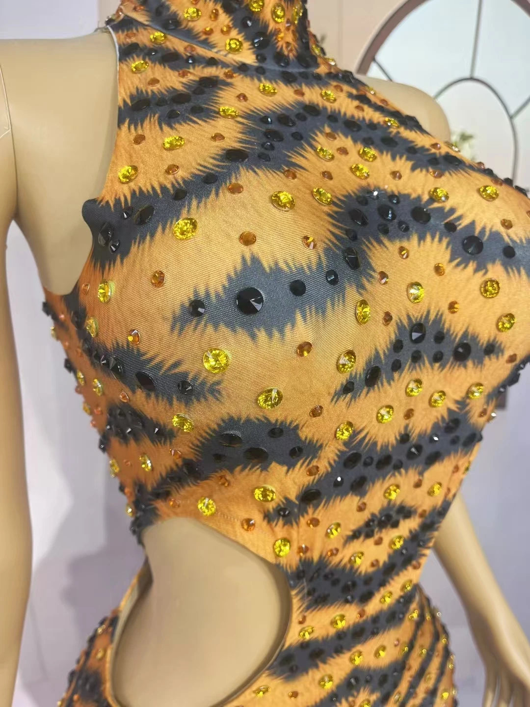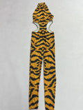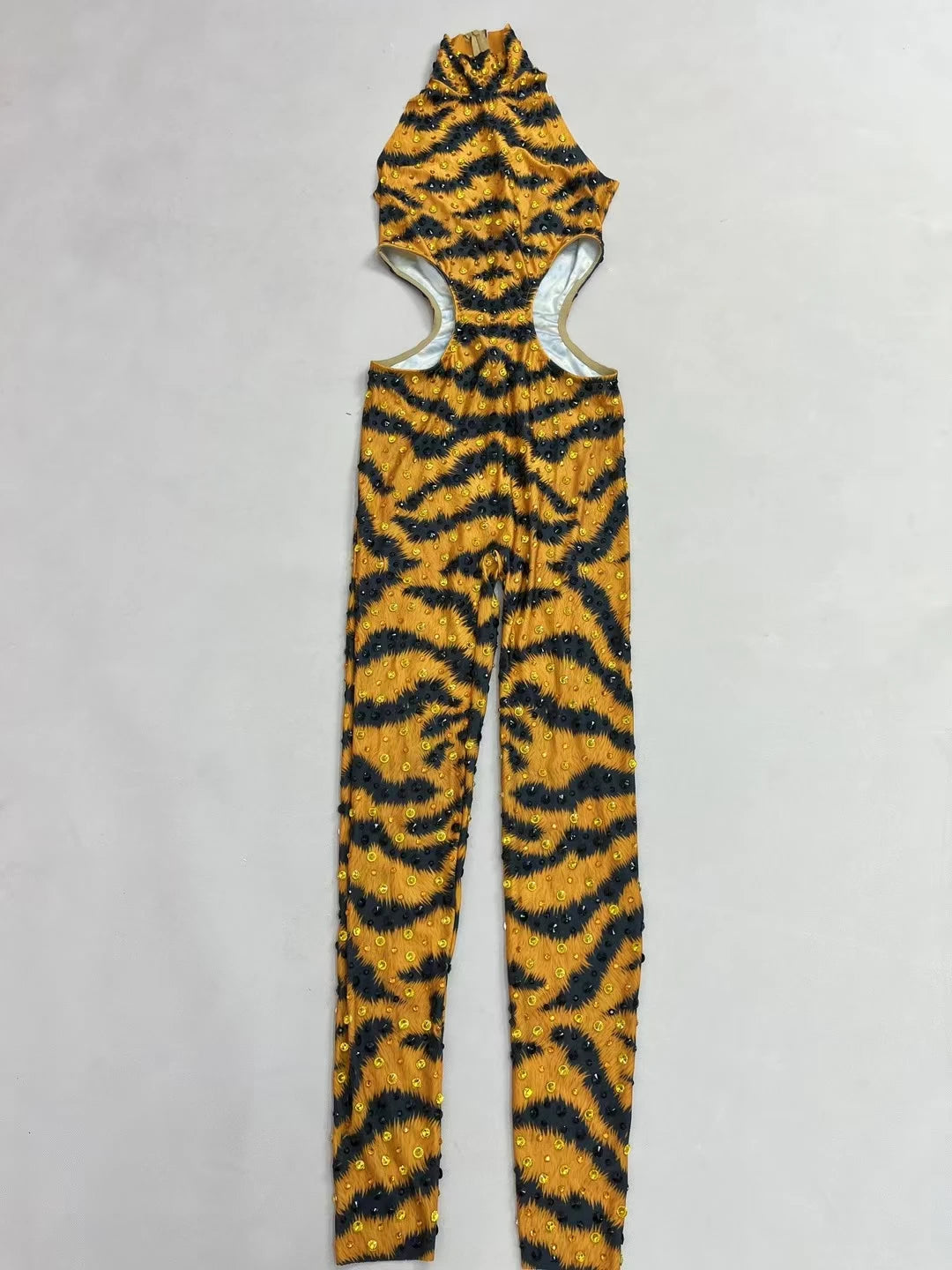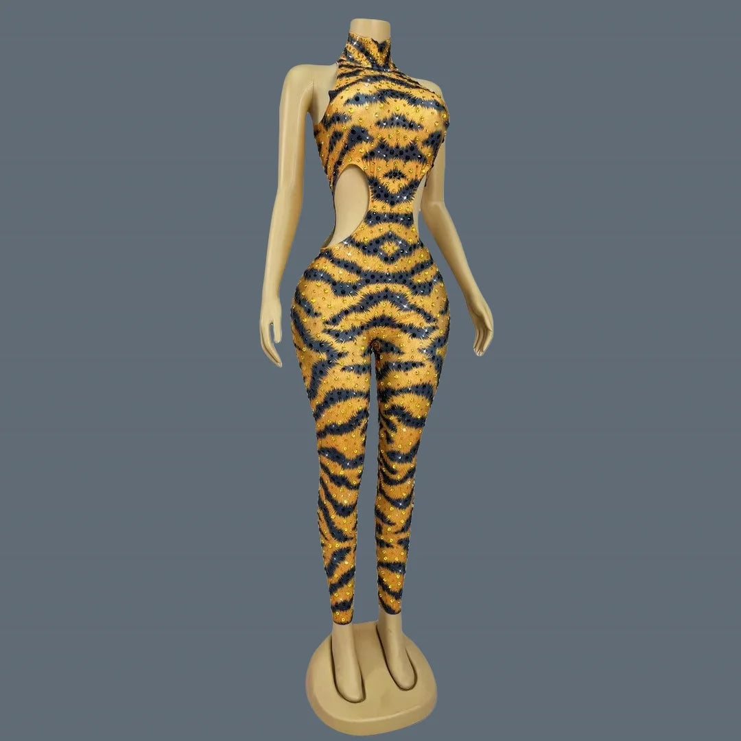 Unleash your wild side with this sparkly rhinestone tiger pattern jumpsuit. Featuring a tight-fitting, sleeveless design, this sexy and skinny outfit is perfect for night parties, stage performances, and making a bold statement in the spotlight. The dazzling rhinestones and fierce tiger motif ensure you’ll stand out and impress at any event.