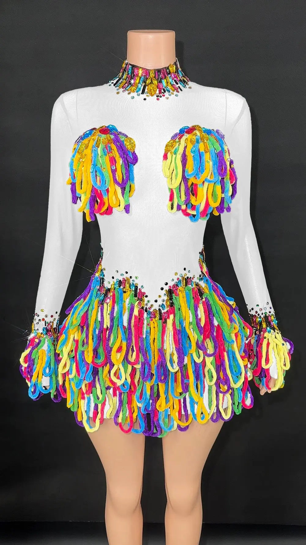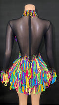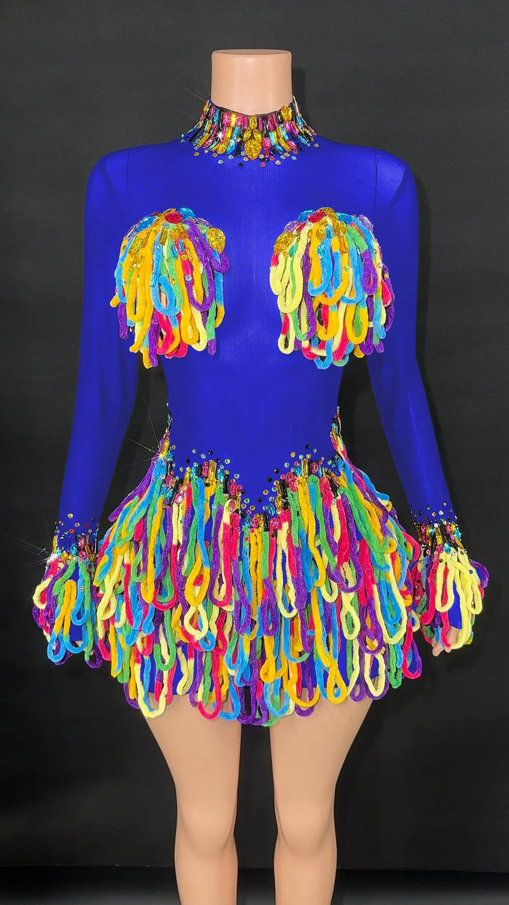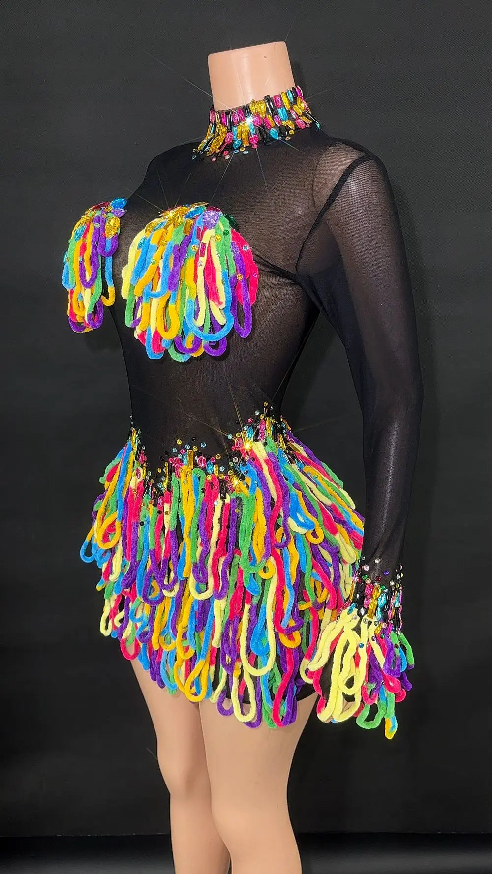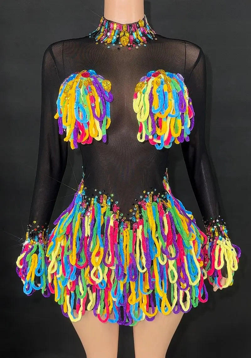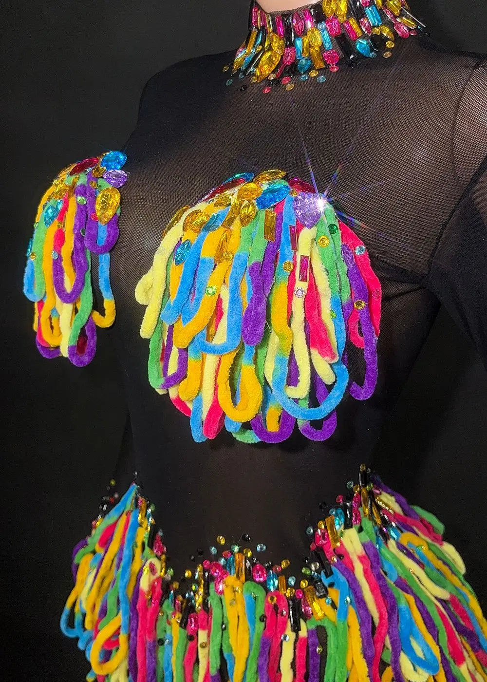Elevate your stage presence with the Sparkly Rhinestones Colourful Tassels Dress — a vibrant, movement-driven costume designed for dancers, performers, and anyone who wants to dazzle under stage lights. This eye-catching dress combines sheer, body-hugging mesh with arrays of sparkling rhinestones and colourful tassels that swing and shimmer with every step, spin, and beat.