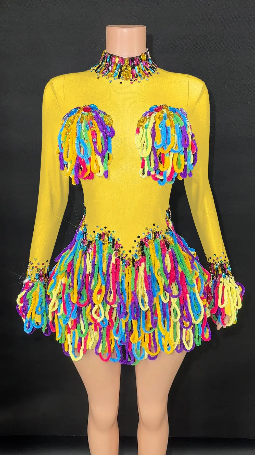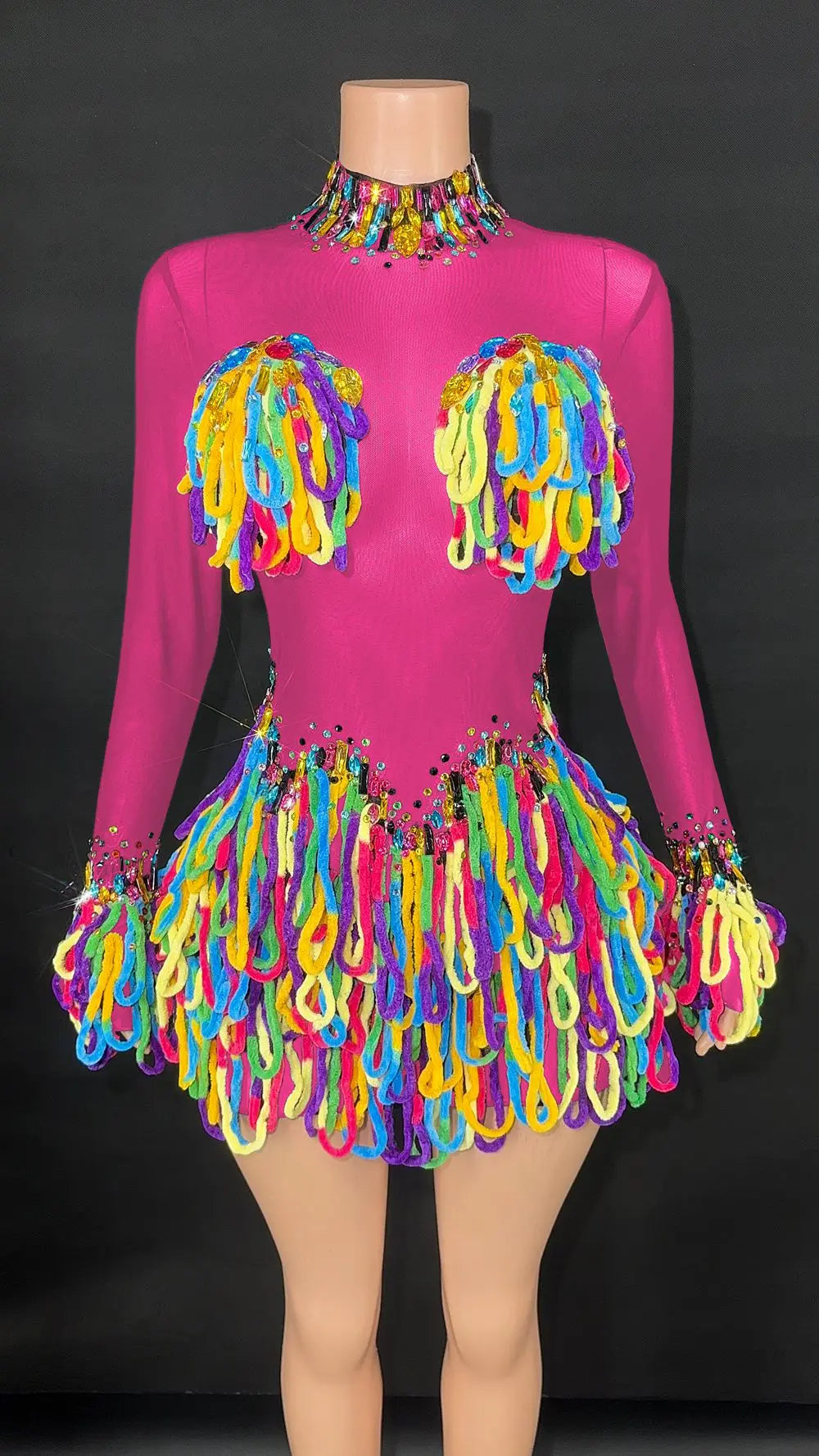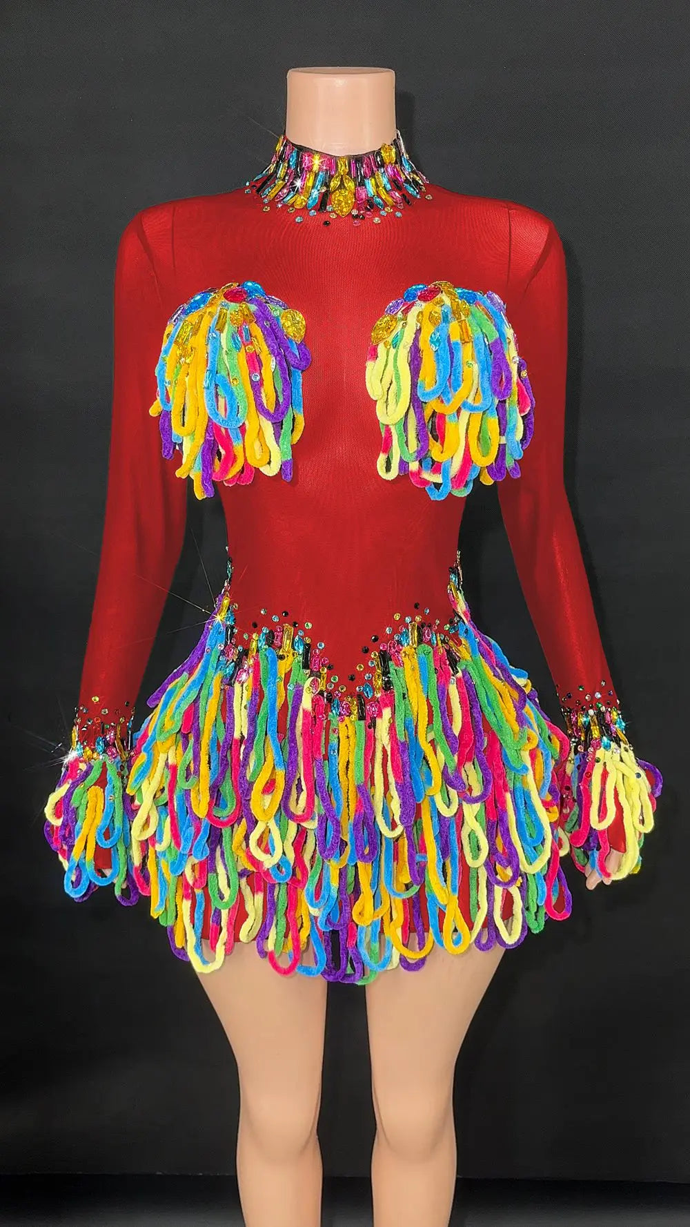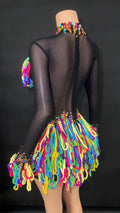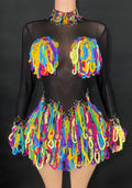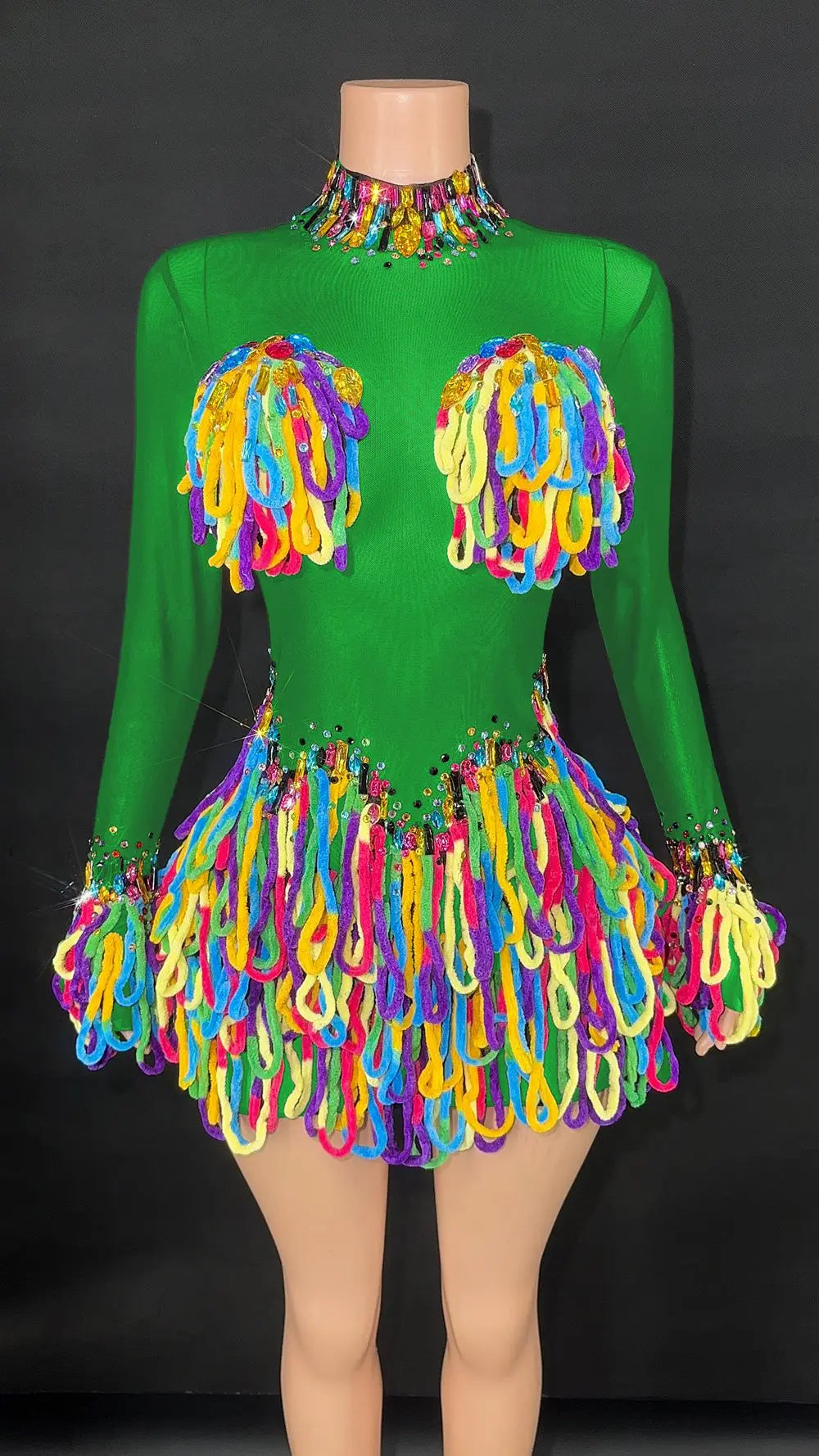 Elevate your stage presence with the Sparkly Rhinestones Colourful Tassels Dress — a vibrant, movement-driven costume designed for dancers, performers, and anyone who wants to dazzle under stage lights. This eye-catching dress combines sheer, body-hugging mesh with arrays of sparkling rhinestones and colourful tassels that swing and shimmer with every step, spin, and beat.