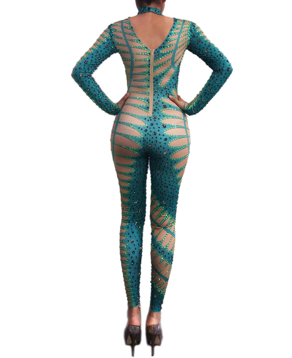 Shine bright at your next event in this sparkly green nude jumpsuit adorned with eye-catching rhinestones. The form-fitting, sexy design is perfect for nightclub outings, dance performances, or stage shows, ensuring all eyes are on you. Ideal for parties, celebrations, and any occasion where you want to make a bold, glamorous statement.