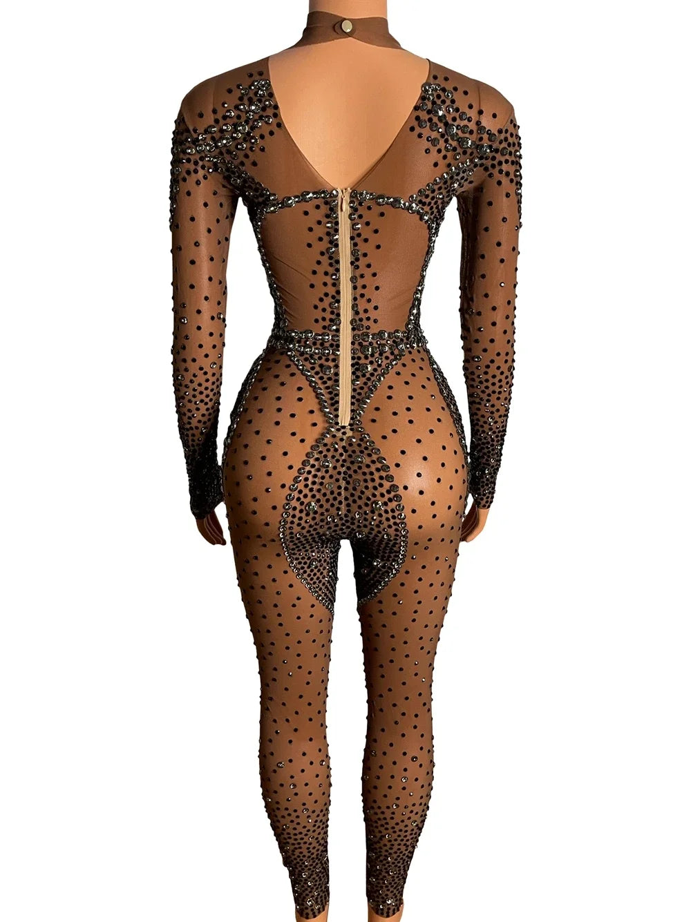 Éblouissez la foule avec cette combinaison transparente en maille à strass scintillants pour femme. Dotée de manches longues et d'une coupe moulante et sexy, cette combinaison est ornée de strass brillants sur une maille transparente pour un look audacieux et glamour. Idéale pour les anniversaires, les fêtes, les spectacles de danse ou les spectacles, cette tenue vous permettra de briller en toute occasion. Affichez votre assurance et votre style à chaque mouvement avec cette pièce remarquable.