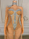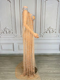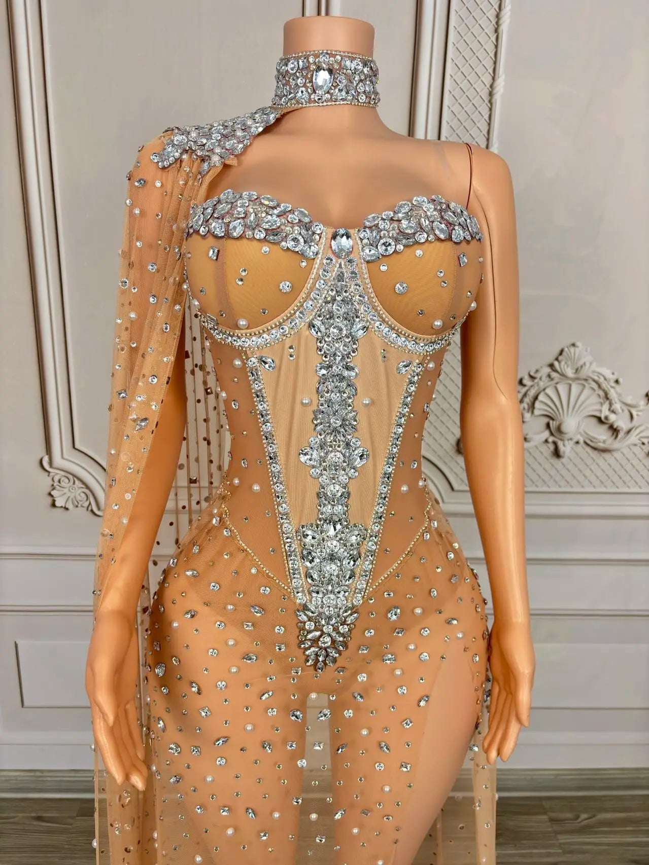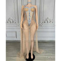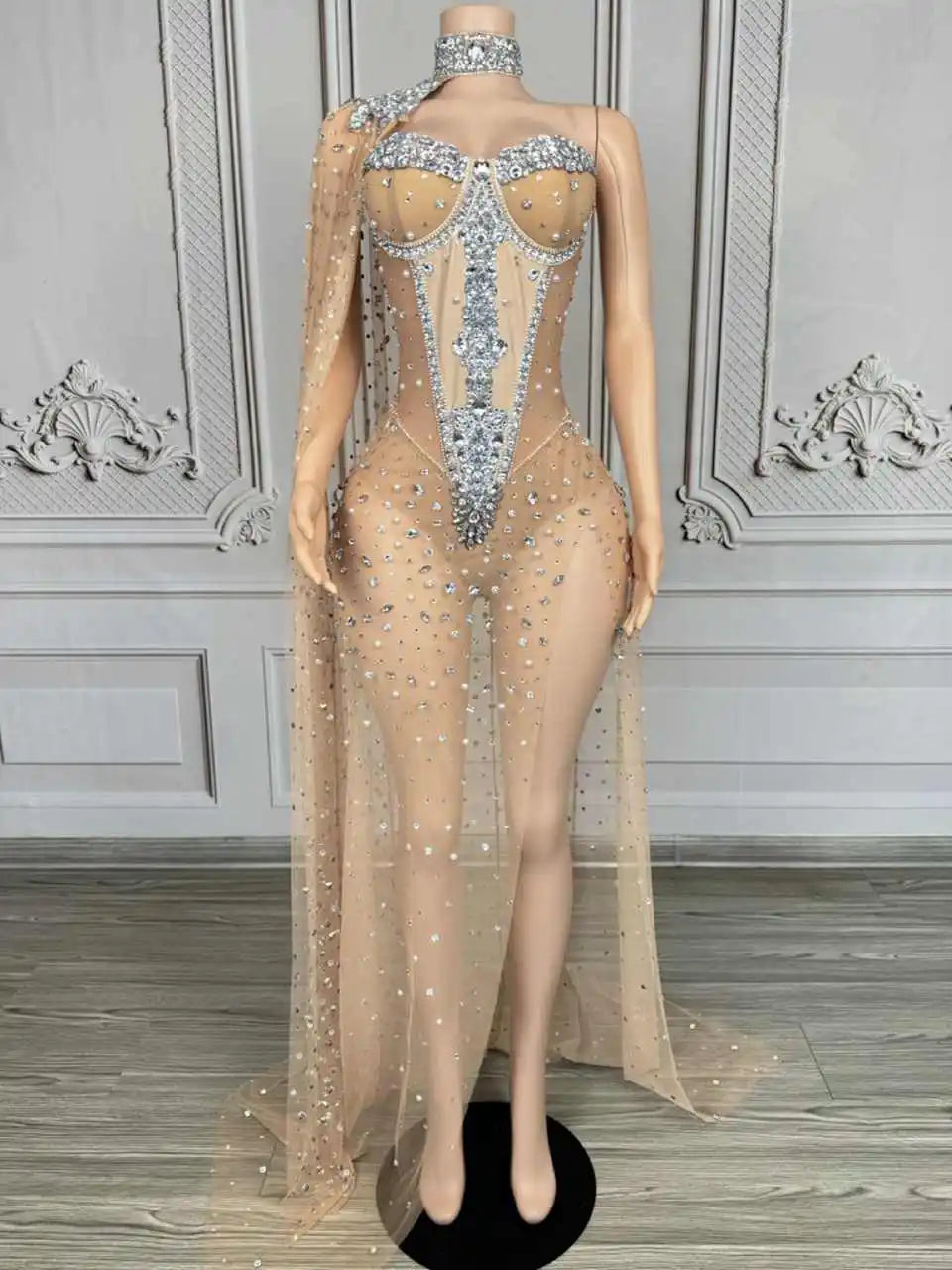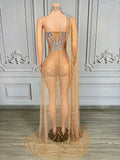 Sparkly Rhinestones Pearls Leotard Sleeve Cloak Floor-length Dress Women Sexy Mesh Evening Prom Event Celebrate Birthday Dress