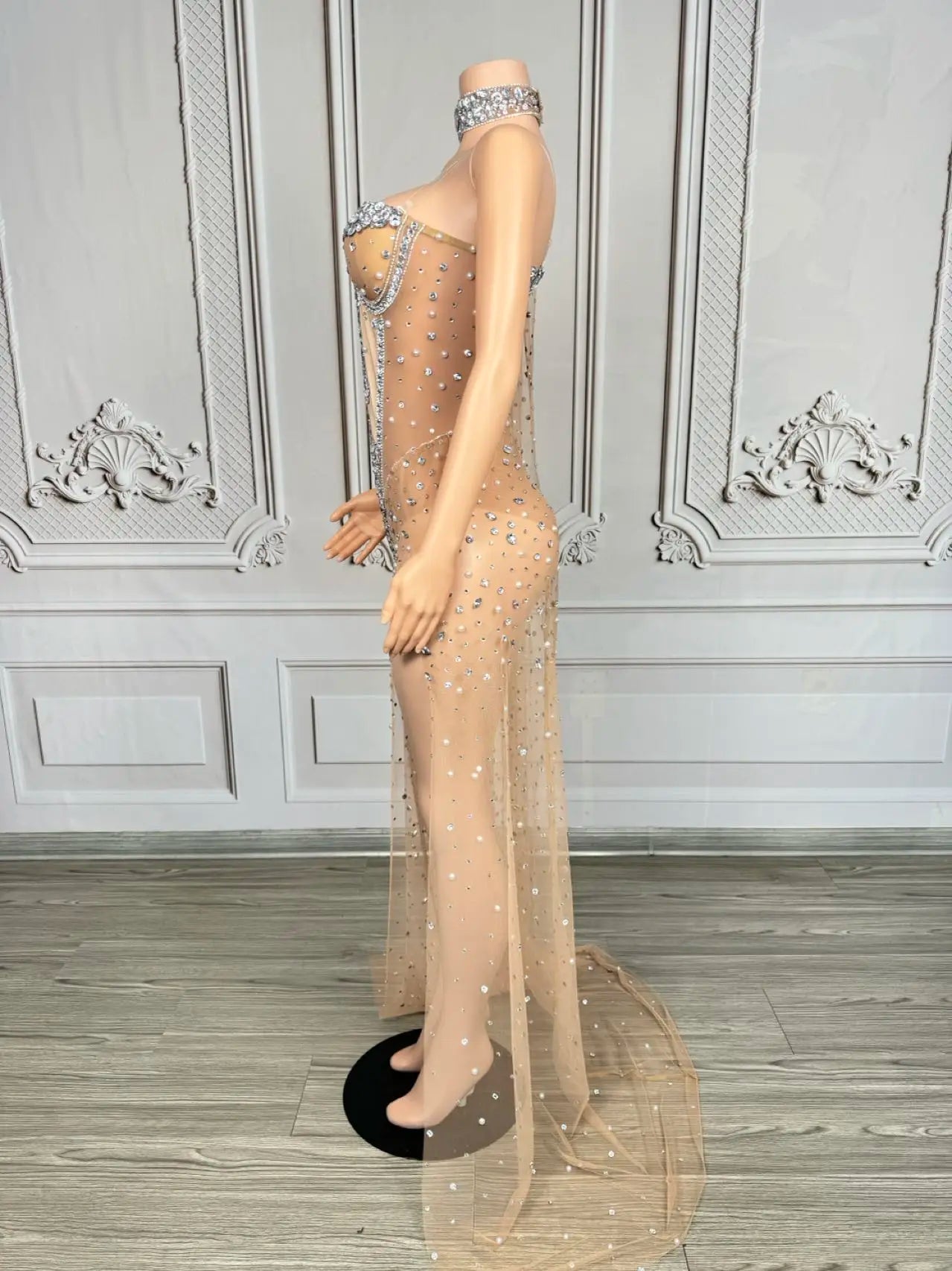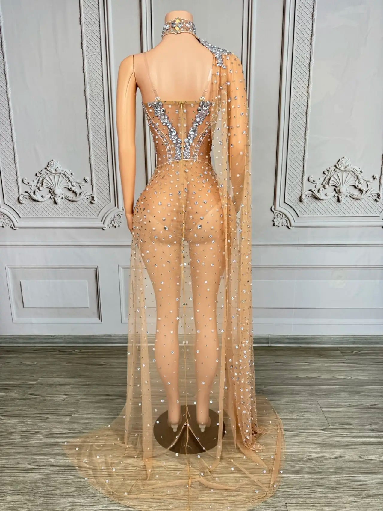 Make a grand entrance in this stunning floor-length dress, featuring a sexy mesh leotard adorned with sparkling rhinestones and elegant pearls. The dramatic sleeve cloak adds a touch of elegance and flair, perfect for evening events, proms, celebrations, or birthday parties. Designed for women who embrace luxury and love to shine, this show-stopping outfit is ideal for making unforgettable memories on your special night.