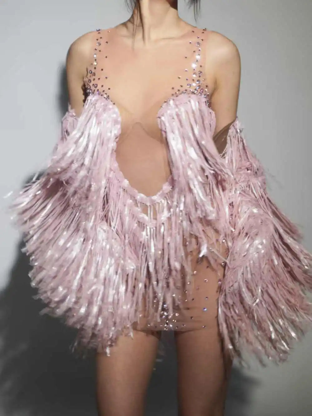 Soyez sous les projecteurs avec cet ensemble deux pièces éblouissant, composé d'une robe courte scintillante ornée de strass, de paillettes et de pompons glamour, et d'un châle transparent assorti. Conçue pour faire tourner les têtes, cette tenue sexy et transparente est parfaite pour les anniversaires, les spectacles de danse, les concerts ou les spectacles. L'éclat accrocheur et le mouvement ludique des pompons vous garantissent de briller et d'exprimer votre confiance en vous à chaque événement.