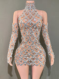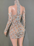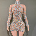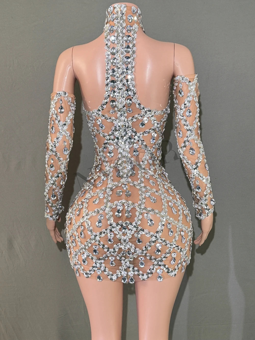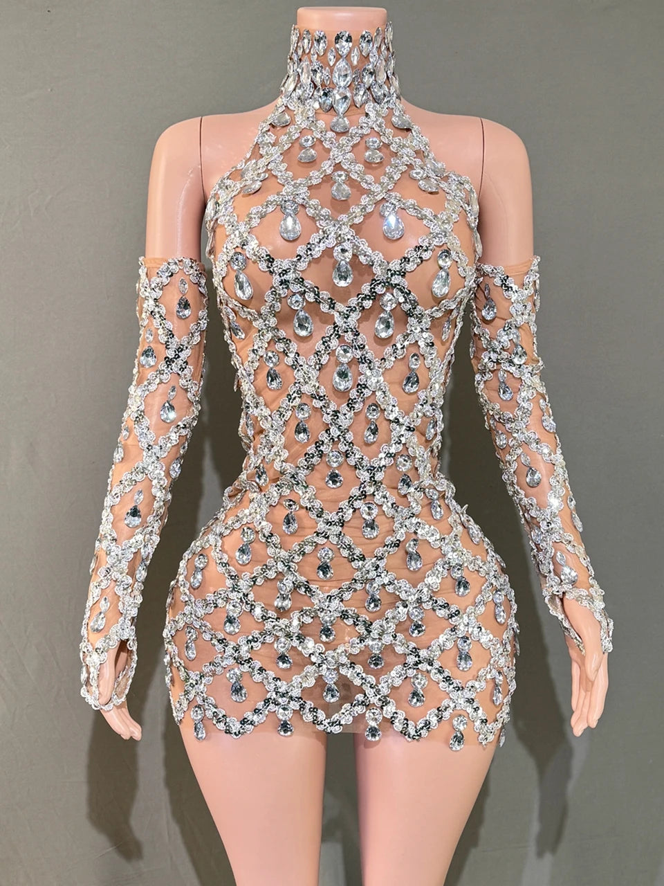 Sparkly Rhinestones Short Dress Gloves for Women Sexy Mesh See Through Evening Prom Party Event Birthday Dress Photo Shoot Wear