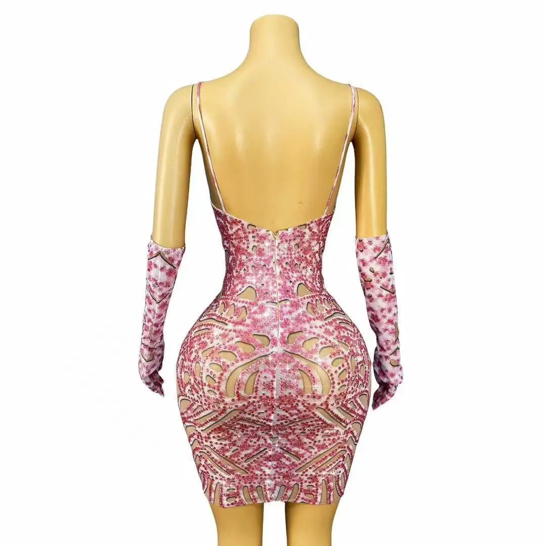 Sparkly Rhinestones Short Skirt Gloves Women Sexy Slip Mesh See Through Evening Prom Celebrate Birthday Dress Photo Shoot Wear
