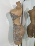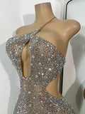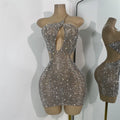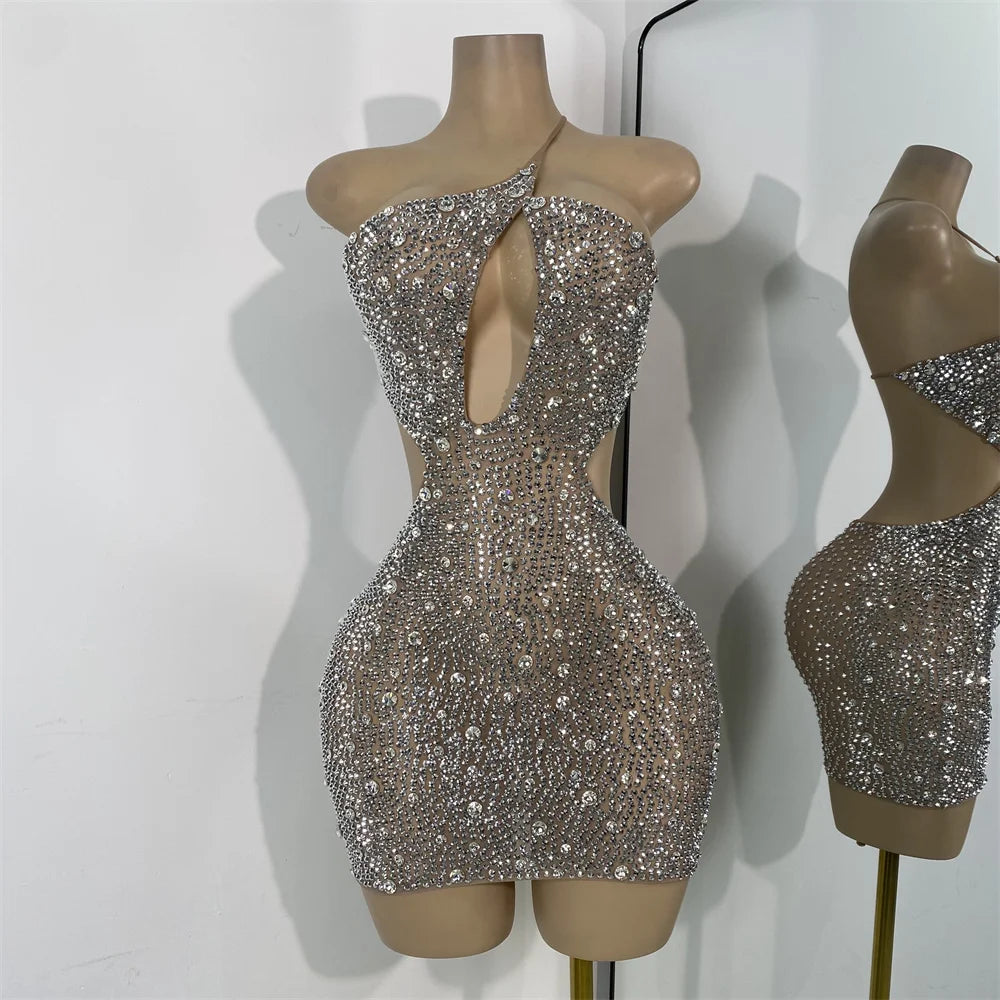 Sparkly Silver Rhinestones Mini Dress Luxury Women Sexy Mesh Hollow Out Celebrity Birthday Cocktail Dresses Performance Wear