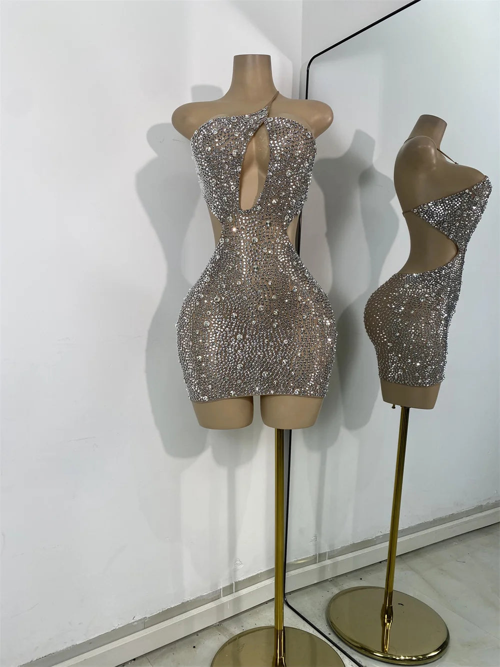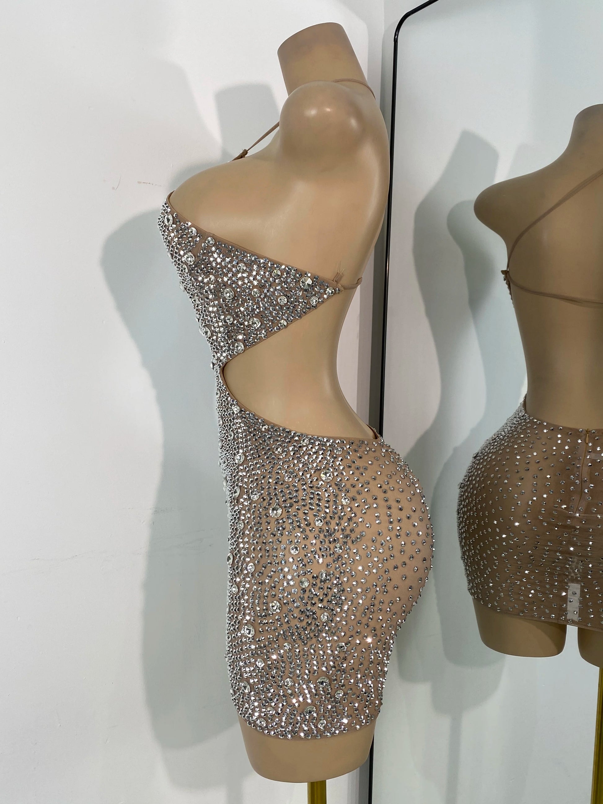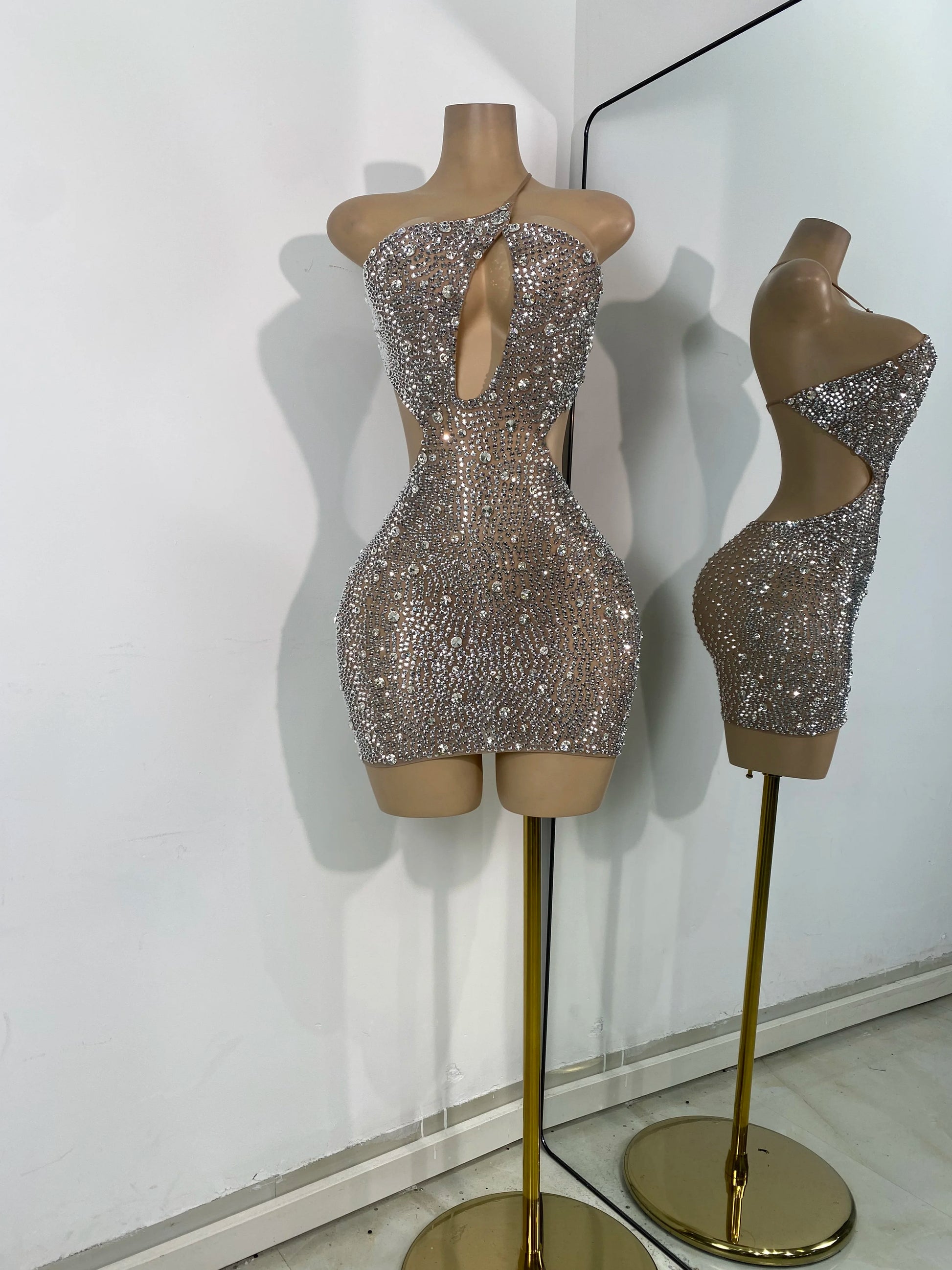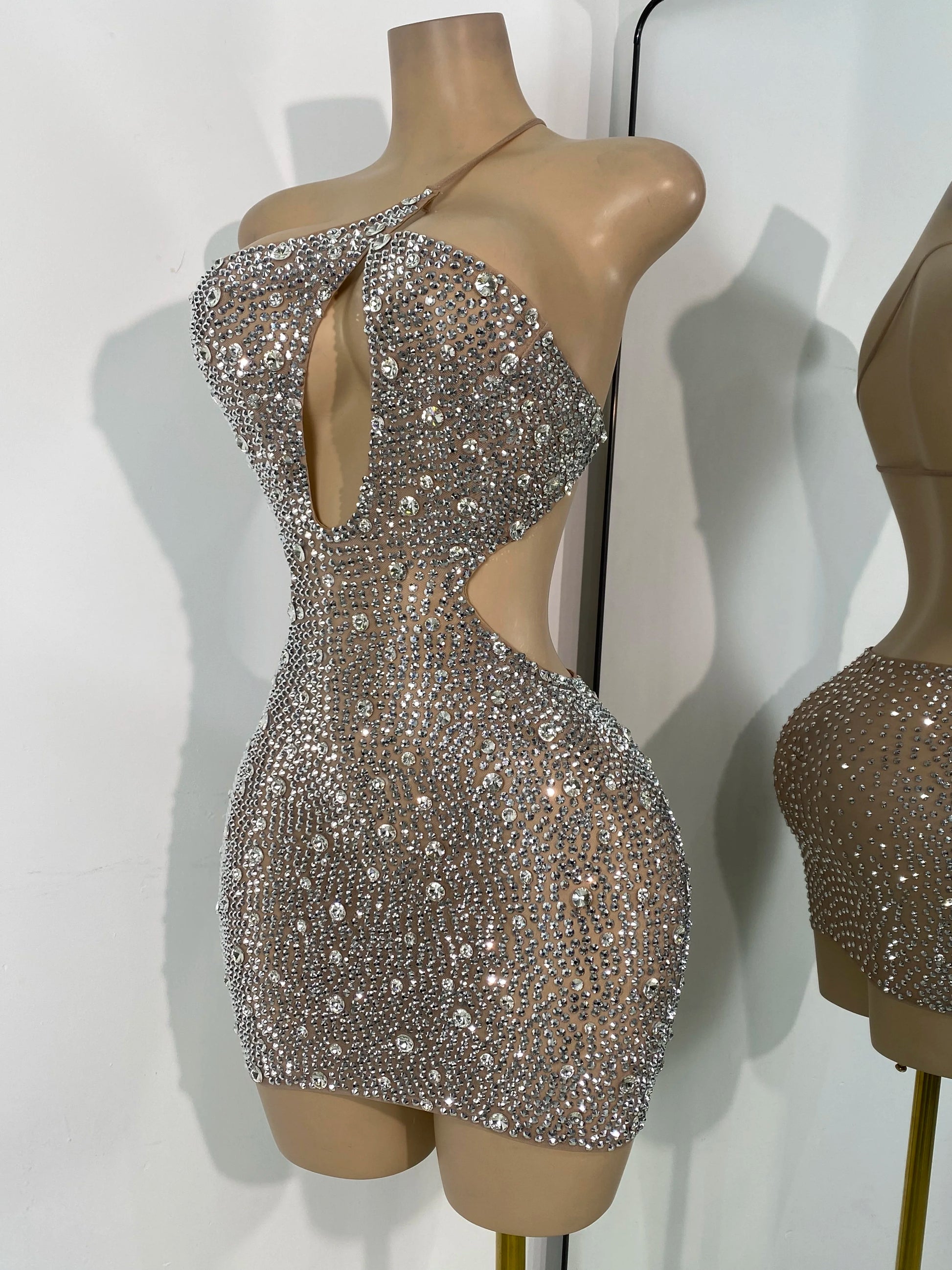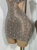 Step into the spotlight with this luxurious mini dress, beautifully adorned with sparkly silver rhinestones. The sexy mesh fabric and hollow-out design create a captivating silhouette, making it perfect for celebrity birthday parties, cocktail events, or performance wear. Dazzle the crowd and exude confidence in this glamorous dress, designed for women who love to make an unforgettable entrance.