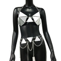 Ensemble 2 pièces en cuir PU spéculaire pour femme, tenue de festival rave, patchwork fait main, chaîne en métal, haut court dos nu, ensemble pour femme