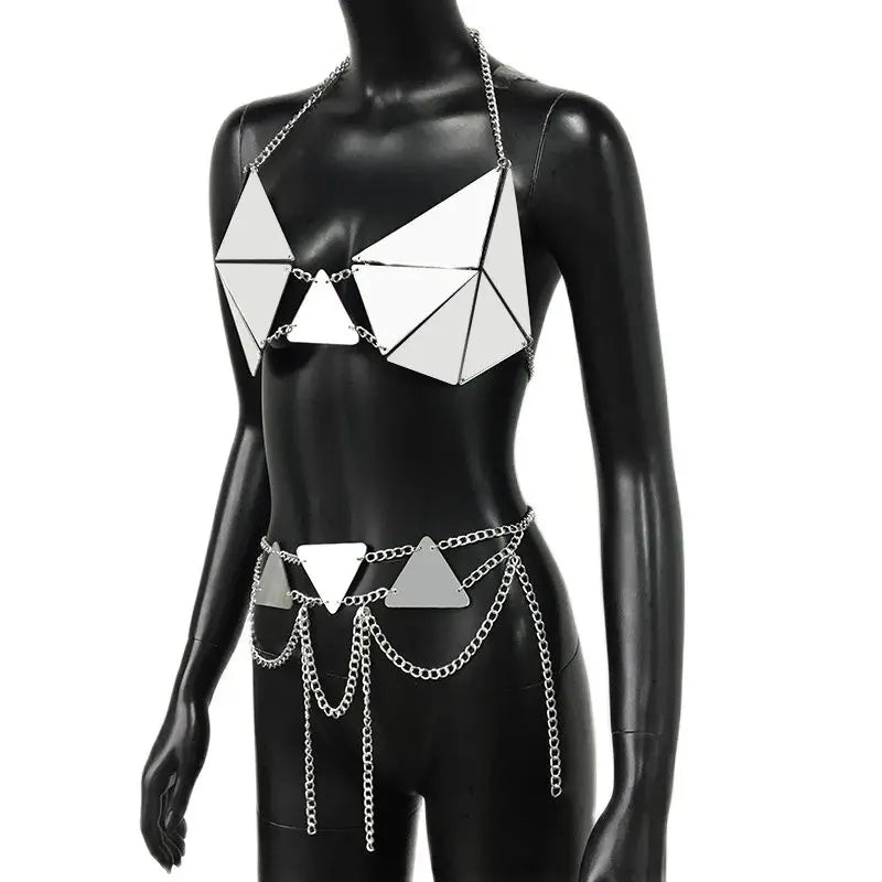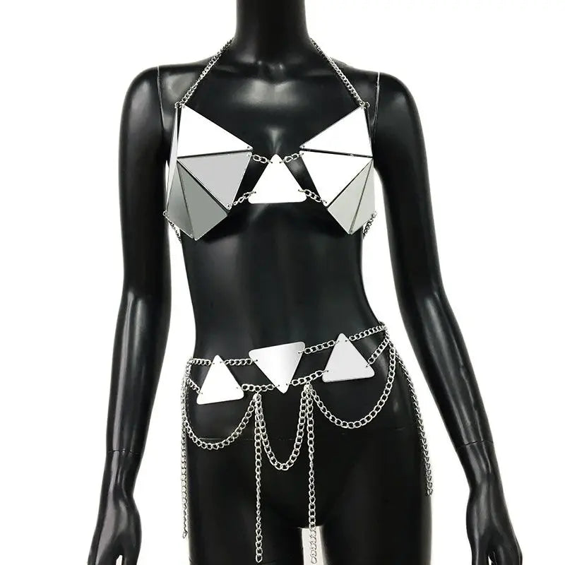 Sublimez votre style festivalier avec cet ensemble 2 pièces pour femme en similicuir spéculaire. Orné d'un patchwork fait main et d'audacieux détails en chaîne métallique, cet ensemble unique comprend un haut court dos nu audacieux qui se marie parfaitement avec le bas assorti. Conçu pour les festivals et les soirées rave, cet ensemble féminin accrocheur allie mode avant-gardiste et savoir-faire exceptionnel pour vous démarquer.