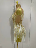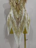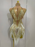 Robe courte sexy en maille extensible pour femme, avec strass scintillants et pompons, tenue de soirée pour boîte de nuit, chanteuse, danse, scène