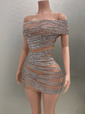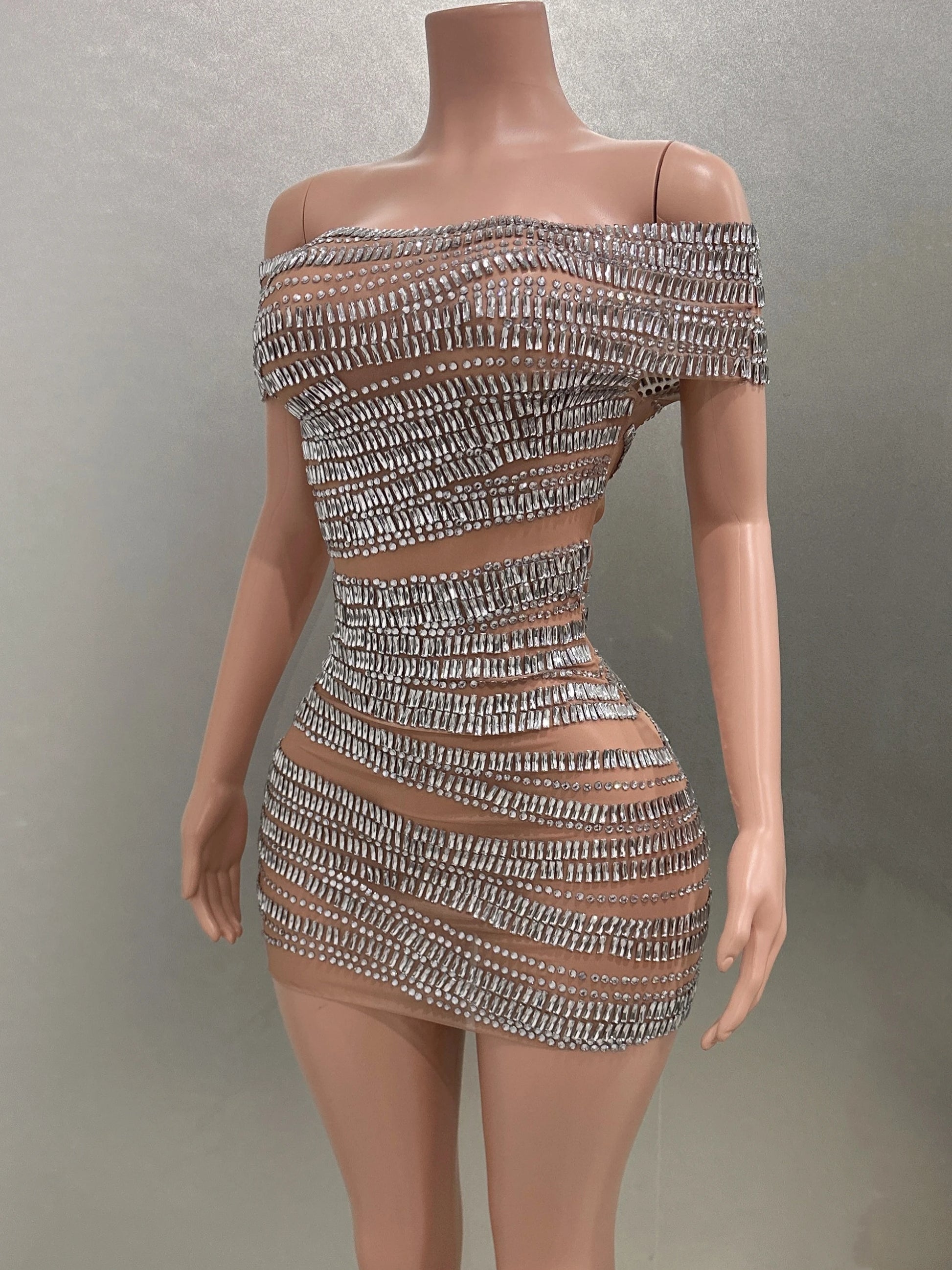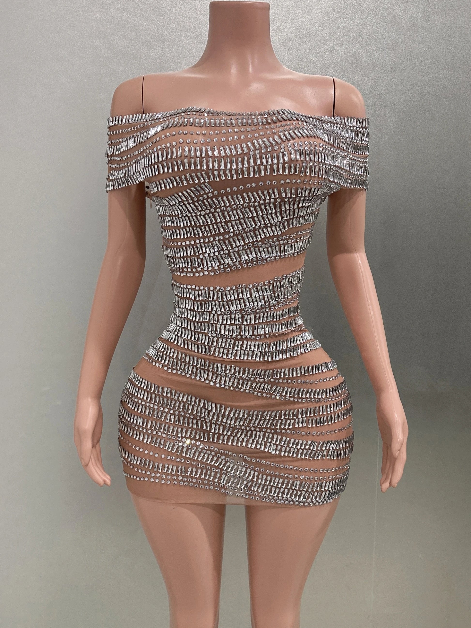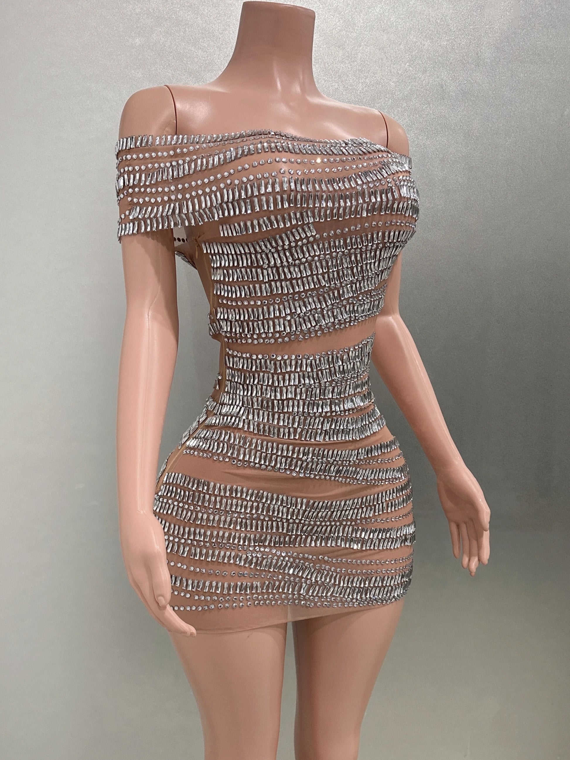 Affirmez votre style avec cette mini-robe moulante ornée de strass scintillants, dotée d'une maille sexy et d'un élégant décolleté. Idéale pour célébrer un anniversaire, une fête, une séance photo ou une représentation sur scène, cette robe éblouissante vous permettra de briller et de vous démarquer lors de toutes les occasions spéciales.