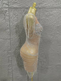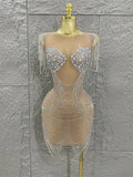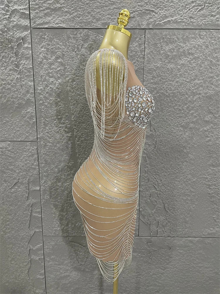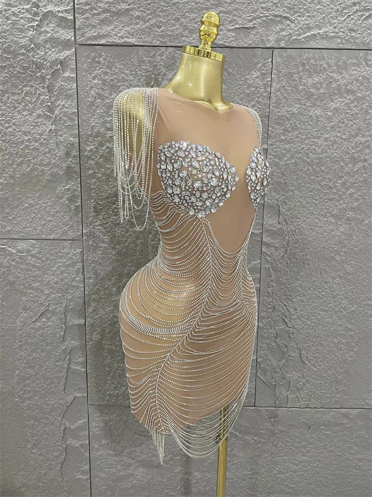Robe moulante sexy en maille transparente avec gros cristaux pour femme, tenue scintillante pour célébrer une soirée en boîte de nuit, un anniversaire ou une scène
