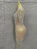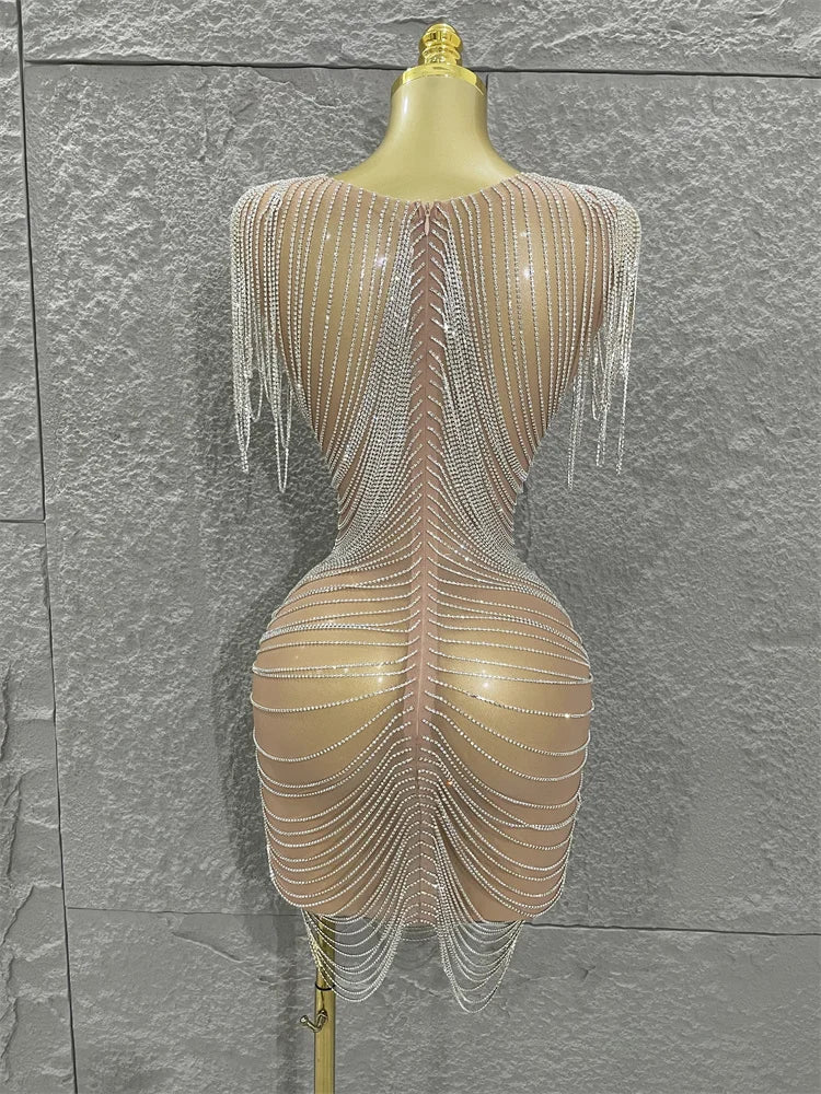 Éblouissez la foule avec cette mini-robe moulante sexy pour femme, ornée de gros cristaux scintillants sur une maille transparente pour un effet de transparence époustouflant. Conçue pour épouser vos courbes, cette mini-robe glamour est parfaite pour les sorties en boîte de nuit, les anniversaires, les fêtes et les représentations sur scène. Brillez avec assurance et rendez chaque instant inoubliable avec cette tenue audacieuse et captivante, qui respire le luxe et la fête.