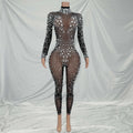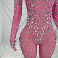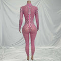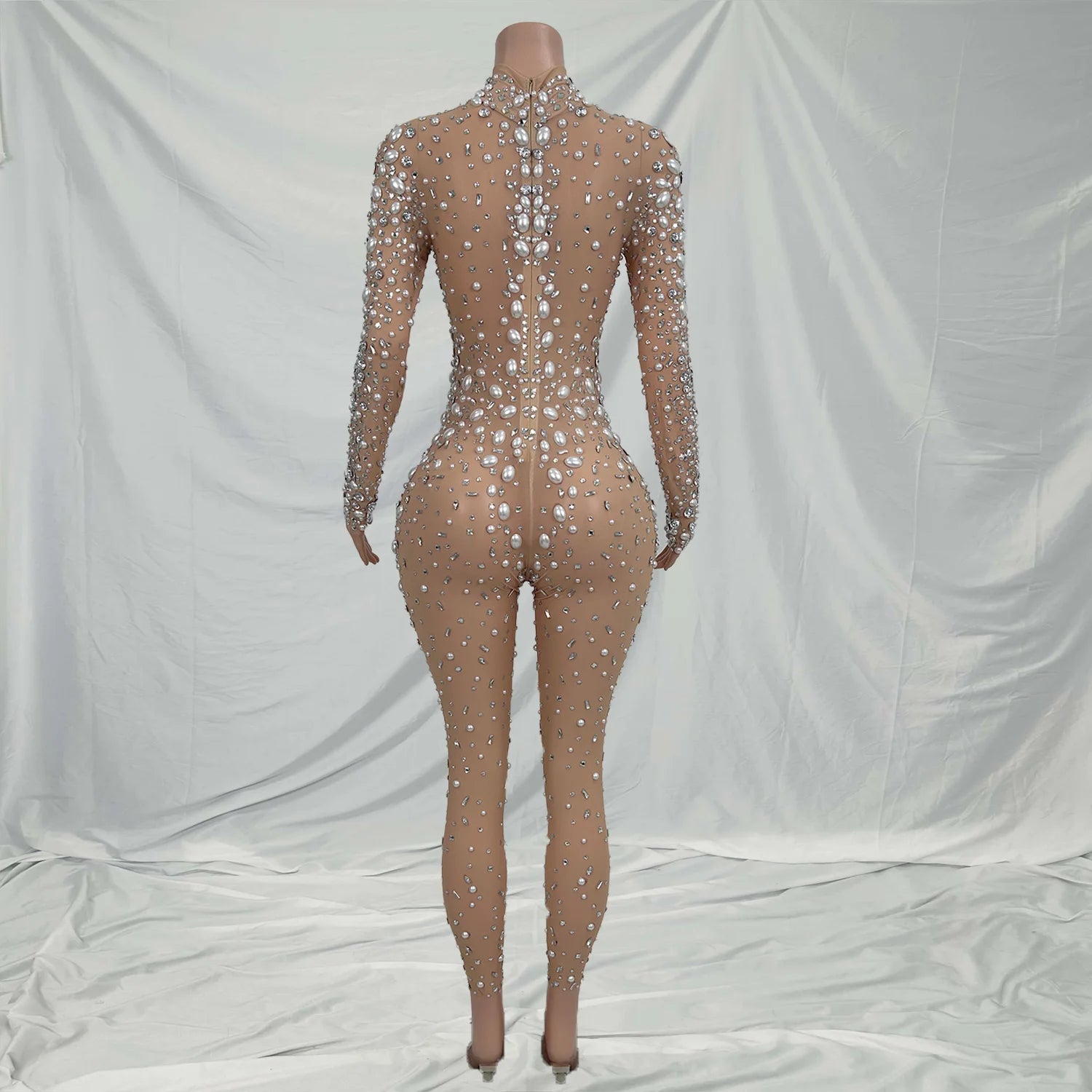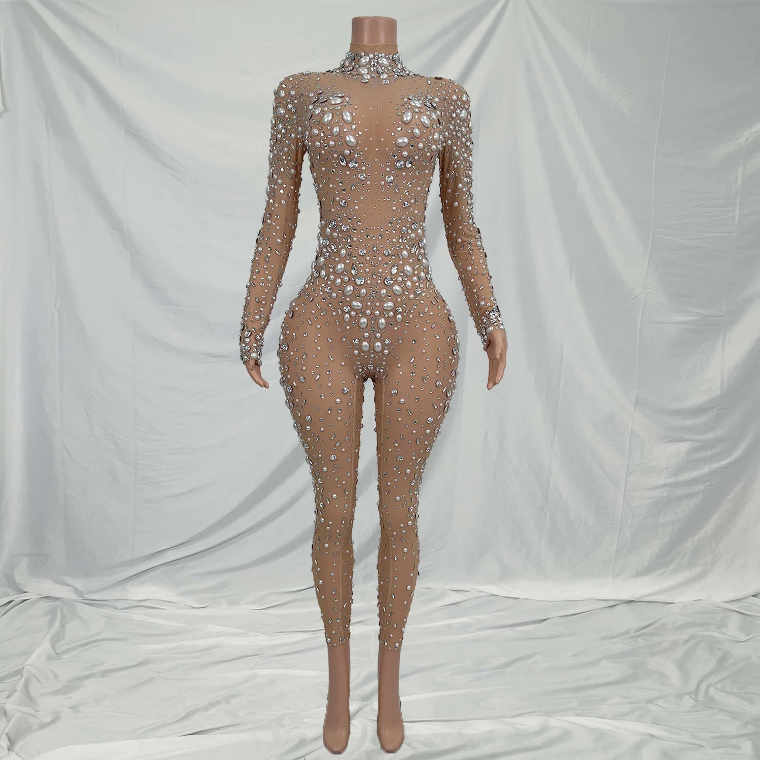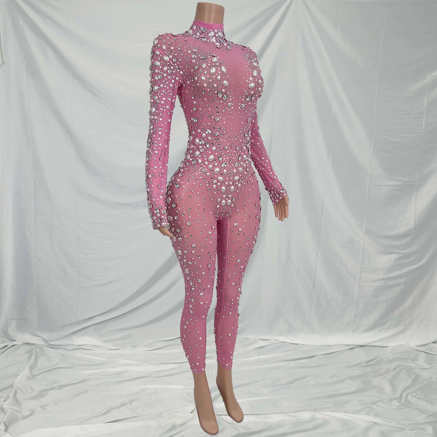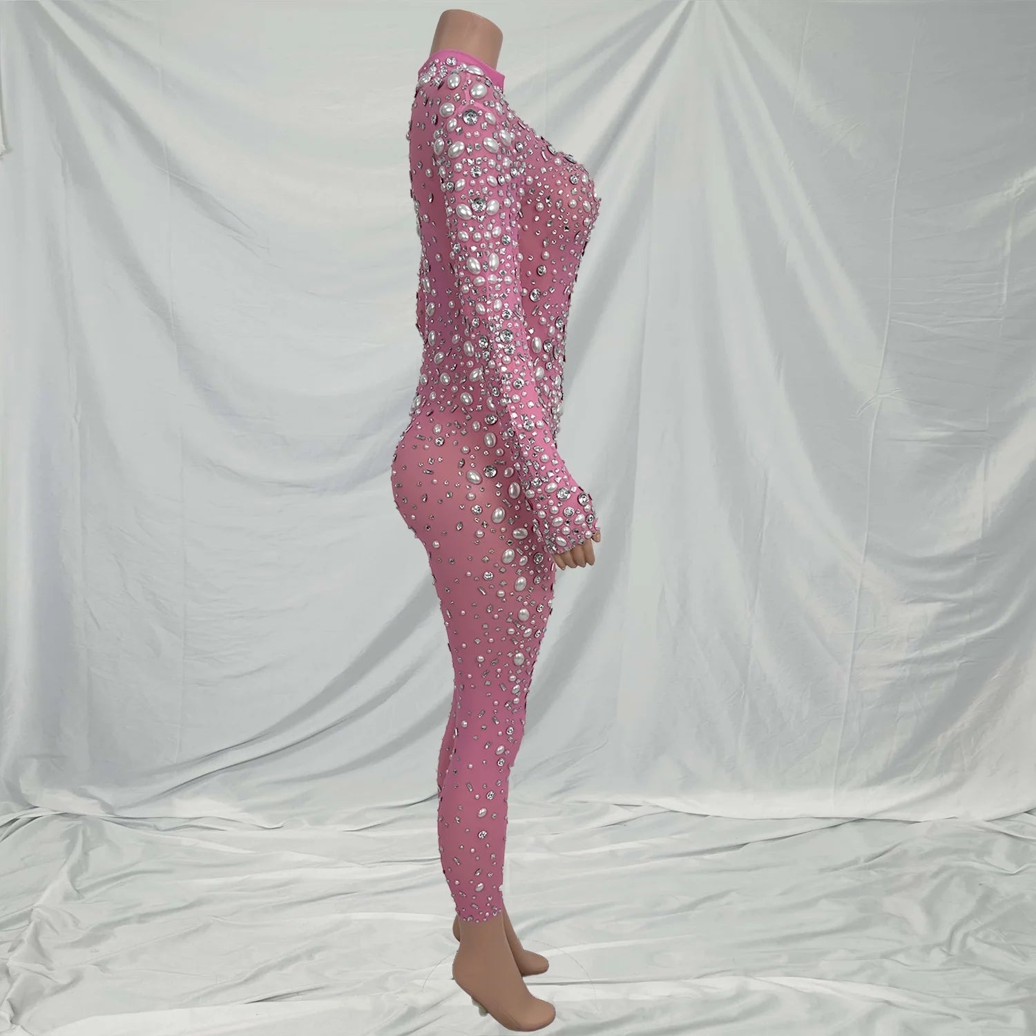 Make a grand entrance in this stunning women's stage jumpsuit, featuring oversized pearl embellishments and sparkling rhinestones throughout. Crafted from stretchy fabric for ultimate comfort and a body-hugging fit, this sexy dancer bodysuit is perfect for evening events, birthday celebrations, or any special occasion. Elevate your performance or party look with an outfit designed to shine and captivate every eye in the room.