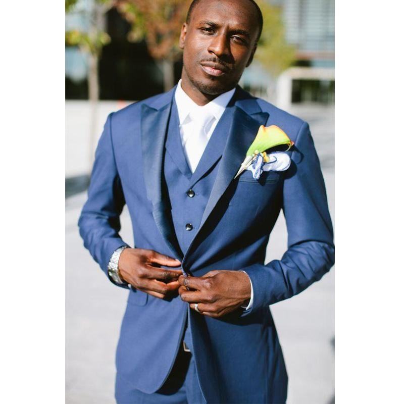 Tuksedo Pengantin Pria Biru dengan revers Puncak Ramping Cocok pour Gaun Pengantin Pria Jaket Blazer Pria Luar Biasa Setelan 3 Potong (Jaket + Celana + Rompi)