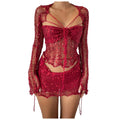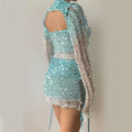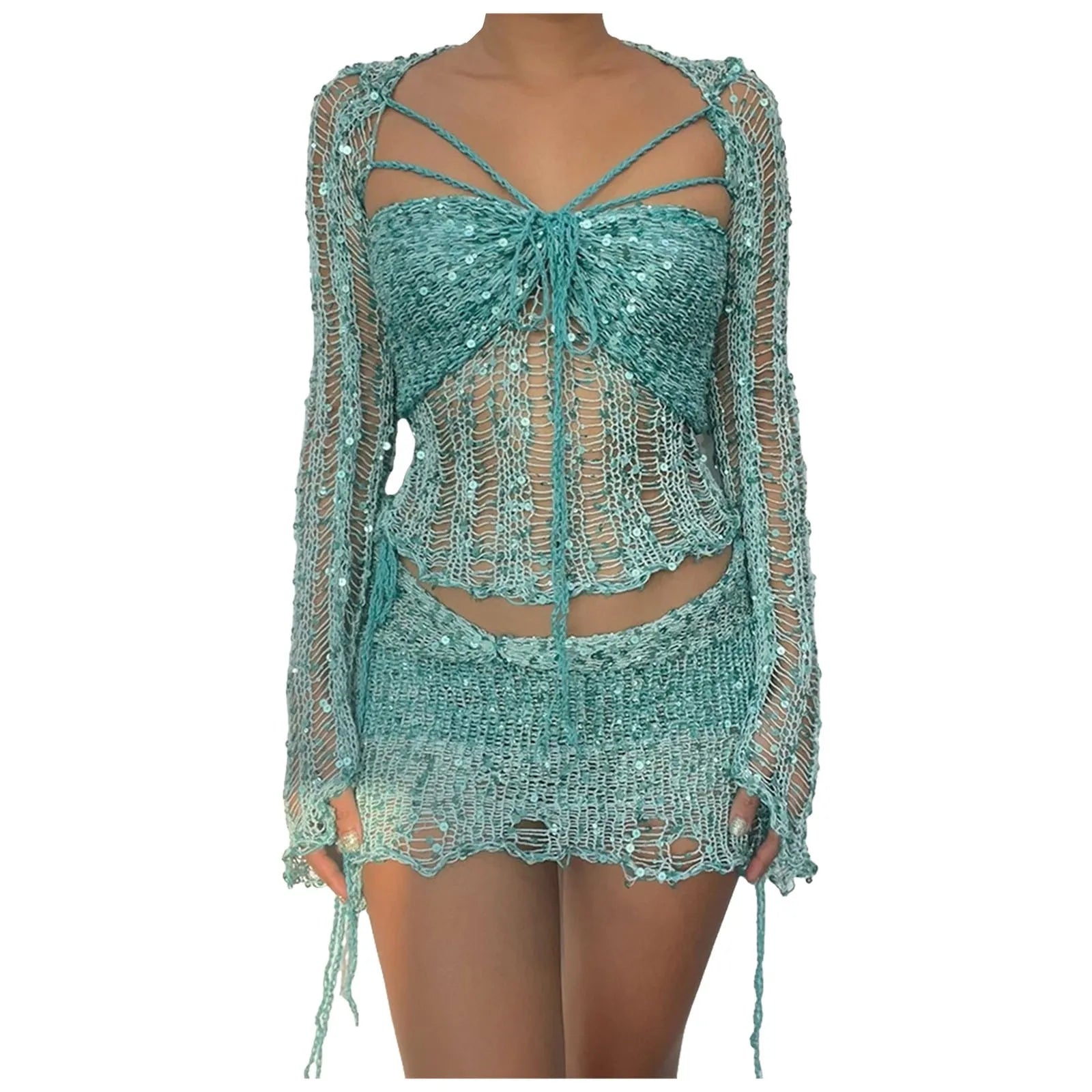 Brillez toute la nuit avec cet élégant ensemble deux pièces en tricot crocheté pour femme. Composé d'un haut court bandage orné de sequins et d'élégants détails ajourés, et d'une mini-jupe assortie, cet ensemble allie sophistication sexy et charme espiègle, idéal pour les fêtes, les soirées en boîte ou les occasions spéciales.